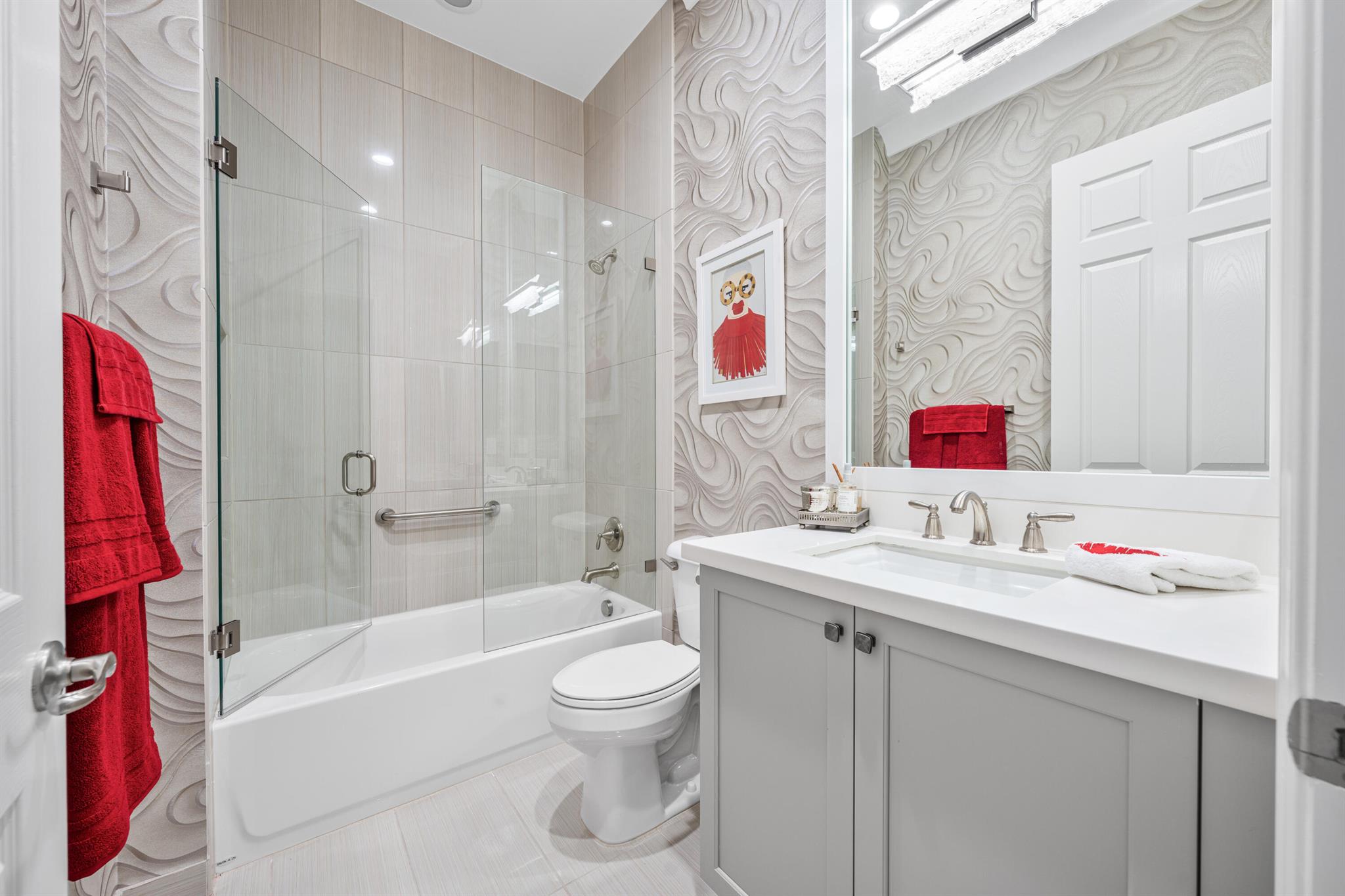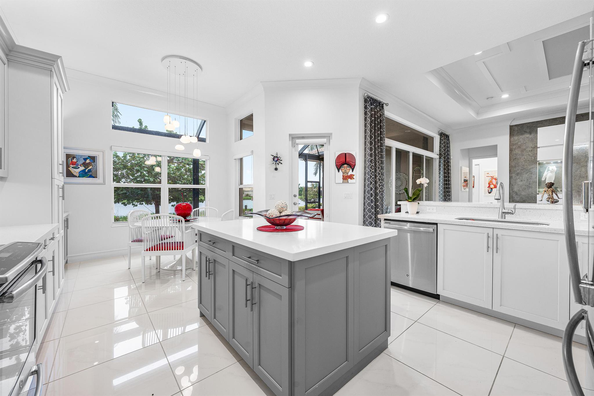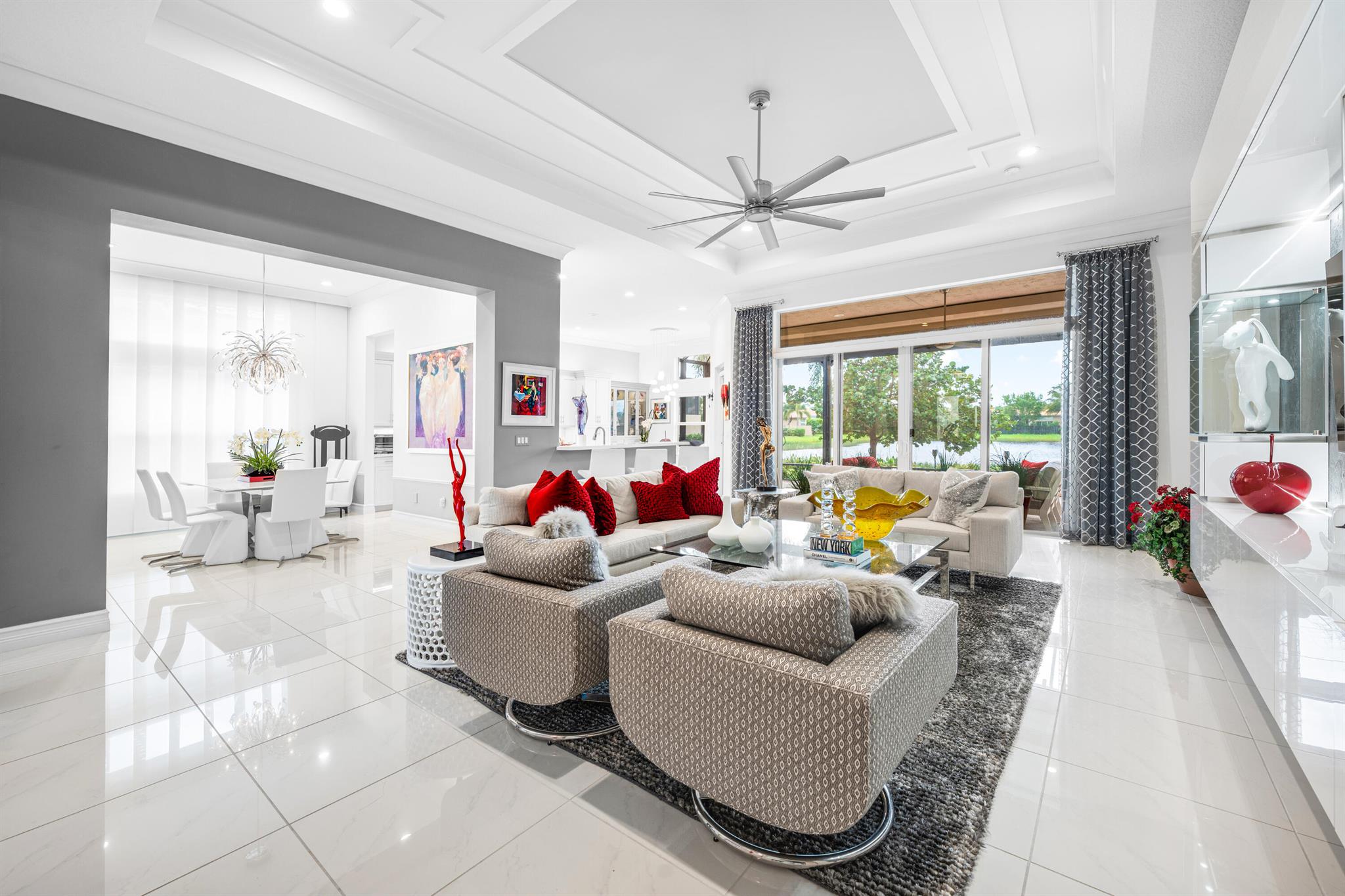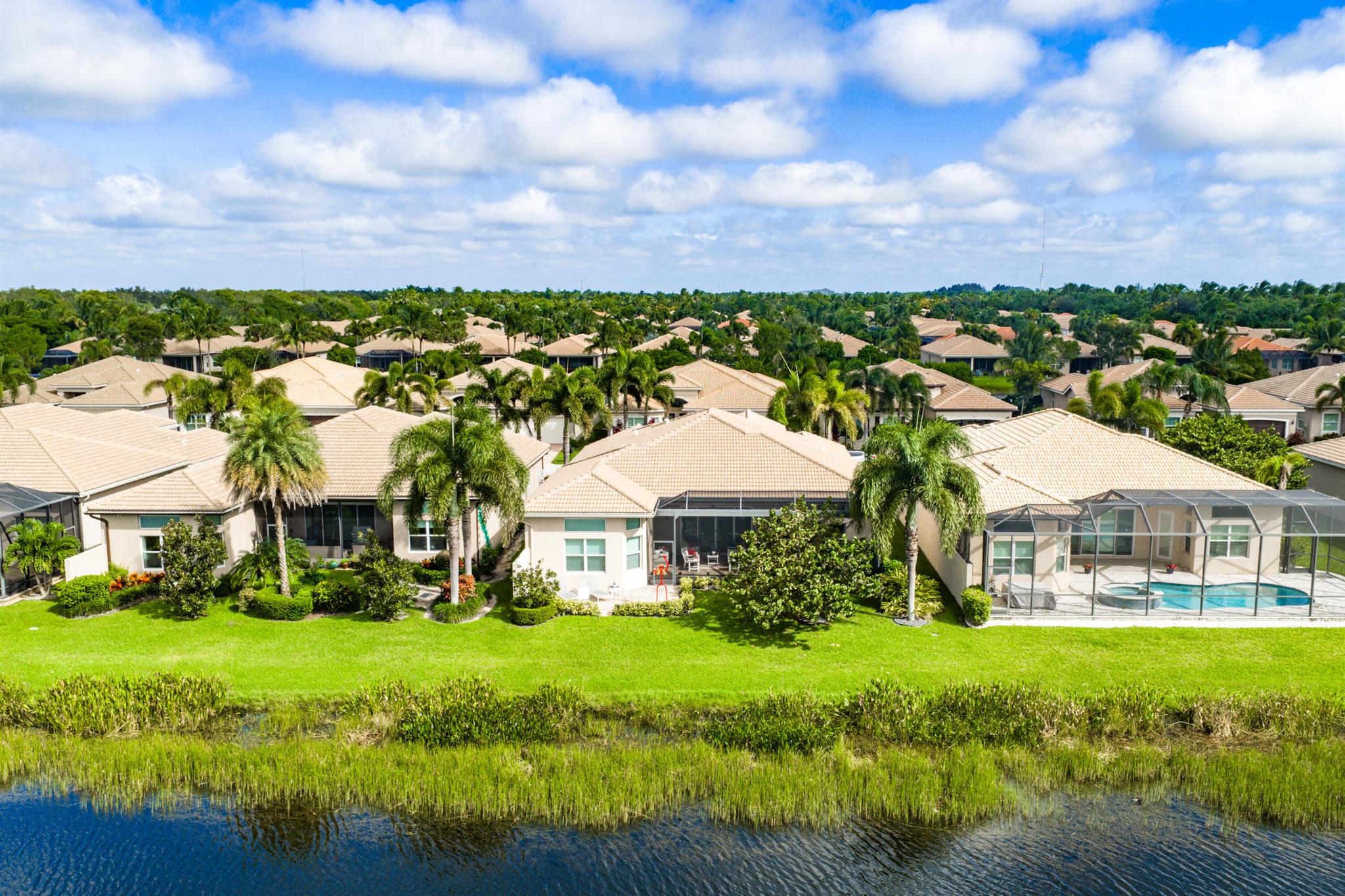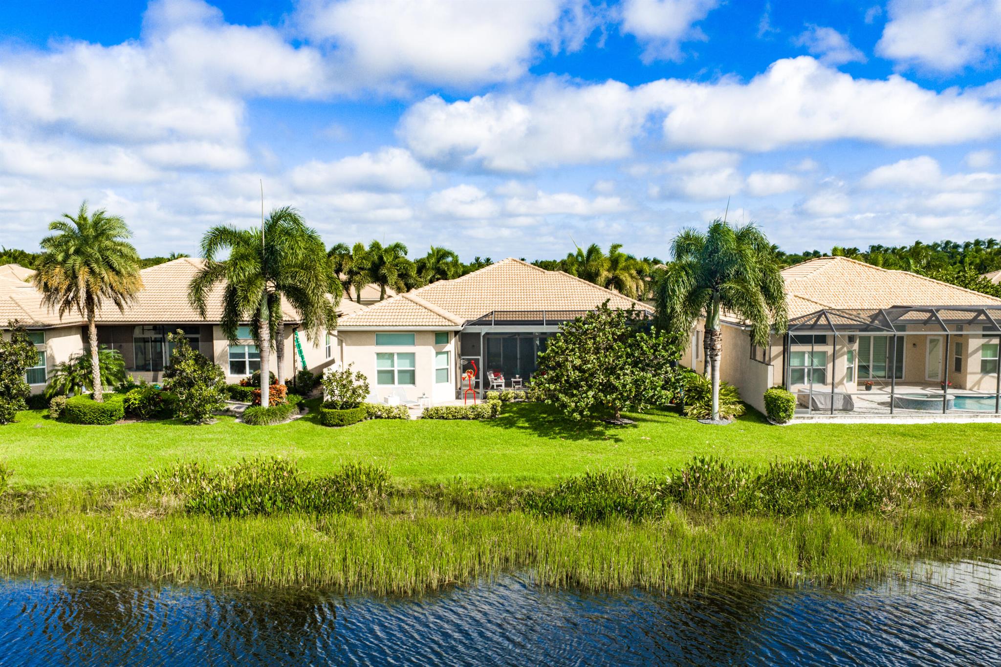 Custom Julia model on beautiful lakefront lot backing east. Features include front privacy gate & etched glass double doors, 24'' porcelain tile floors, wood floors, crown moldings, designer light fixtures & window treatments, designer wall & ceiling treatments, fans, hi-hats, built-ins, outfitted closets, upgraded baths & more! The gourmet kitchen has white wood cabinetry, quartz countertops, glass tile backsplash, stainless steel appliances, center island, snack bar, built-in pantry and hutch & separate breakfast area. Formal dining room. Large great room with custom built-in. Primary suite with luxurious bath. Two ensuite guest bedrooms, den with built-in desk unit & large hobby room. Enjoy the backyard with covered & extended patio, hurricane screen, birdcage & beautiful lake views.