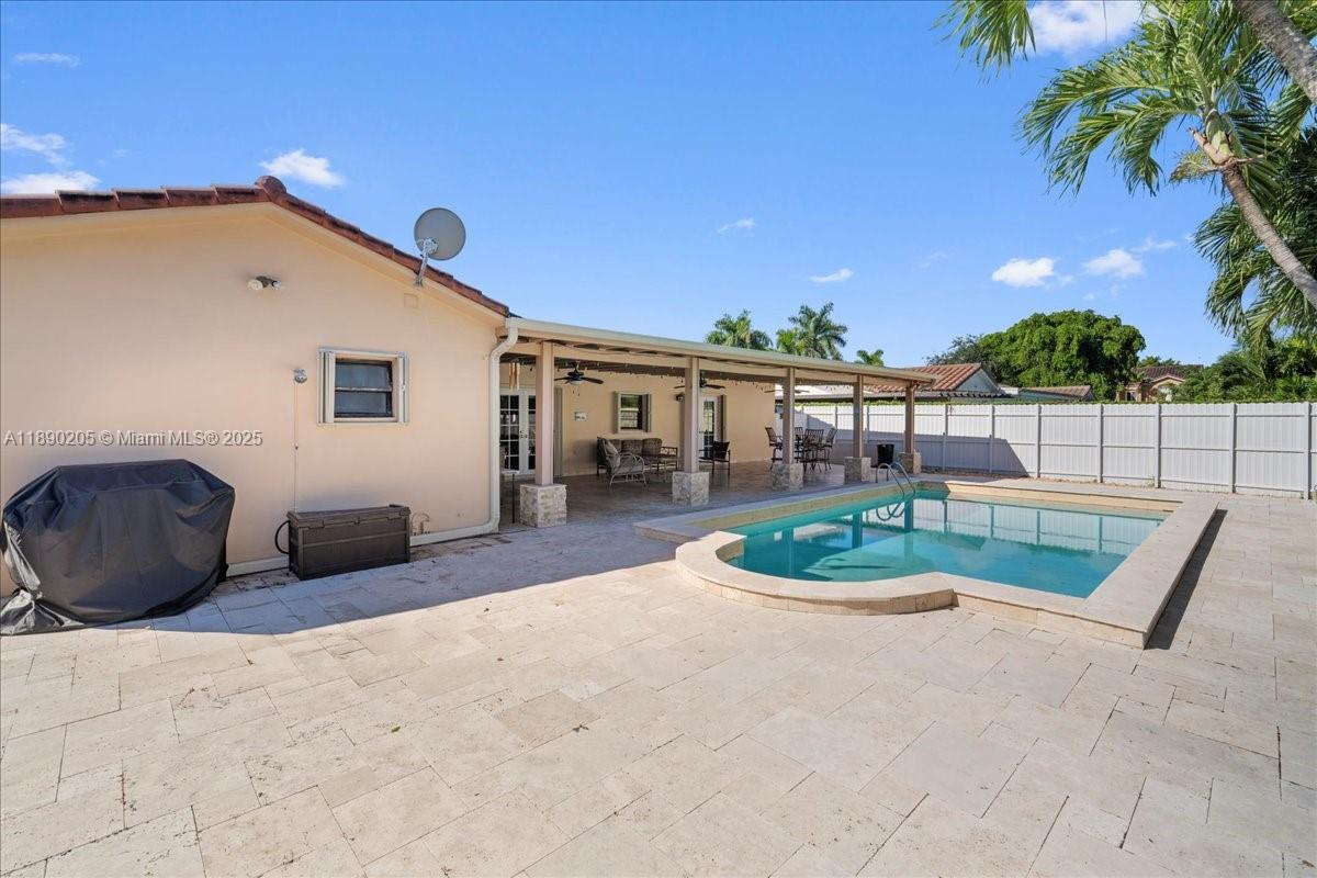 Beautiful 4BR home with 2 fully remodeled baths, 1 car garage that has been converted to more living space, utility and storage rooms. Large circular driveway. Enter this home through a double door entry. Large living area featuring a sunken living room and a formal dining room. Spacious kitchen features granite counters and overlooks a large family room, breakfast counter, crown molding throughout the home. The home features a stacked bedroom floorplan and ceramic tile throughout. Tankless water heater, roof replaced 2015. Enjoy a large deep pool and spacious covered patio—perfect for entertaining. Move-in ready home combining comfort and Florida outdoor living! Great school district. Close to shopping, main highways and place of worship. Don't miss out and priced to sell.