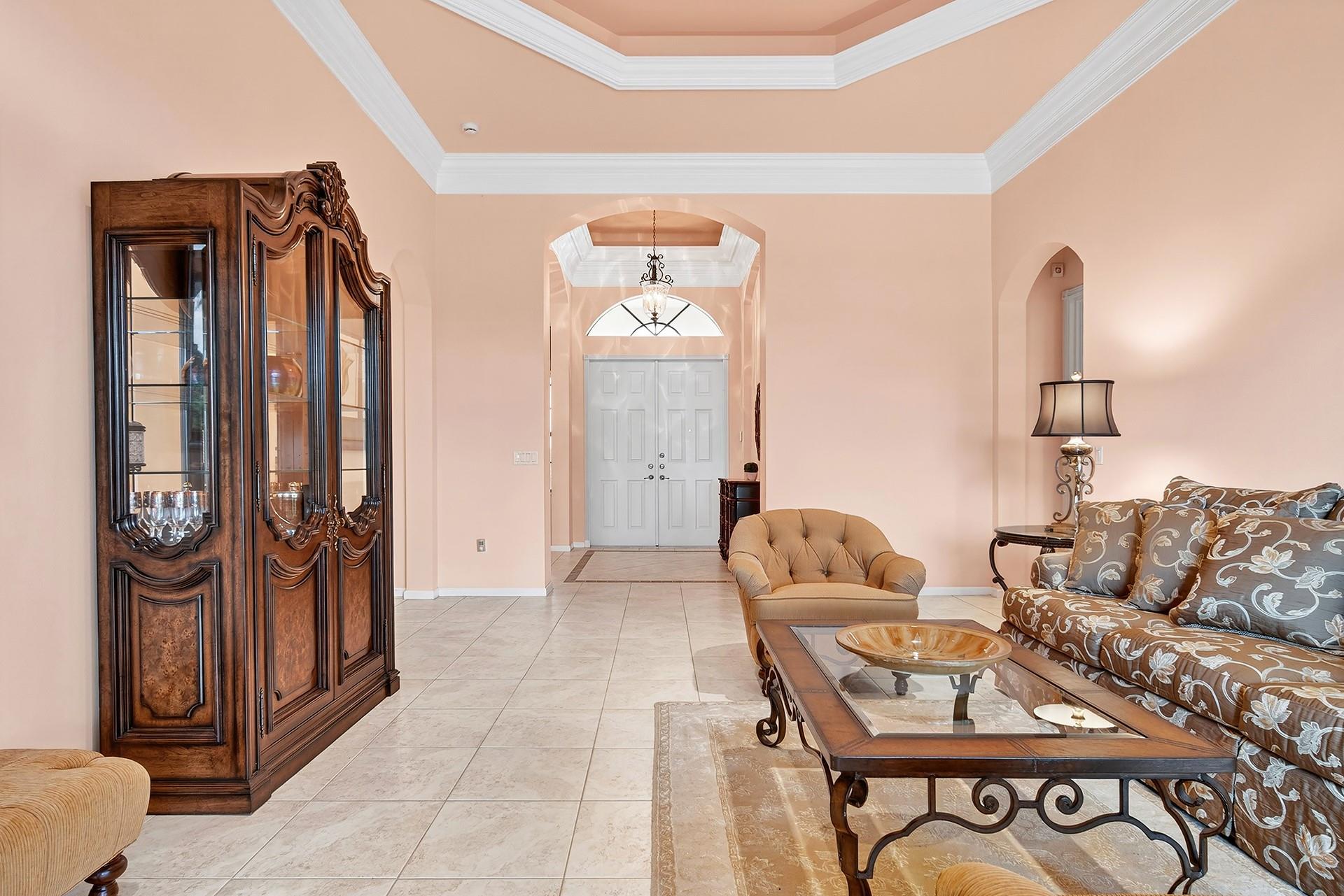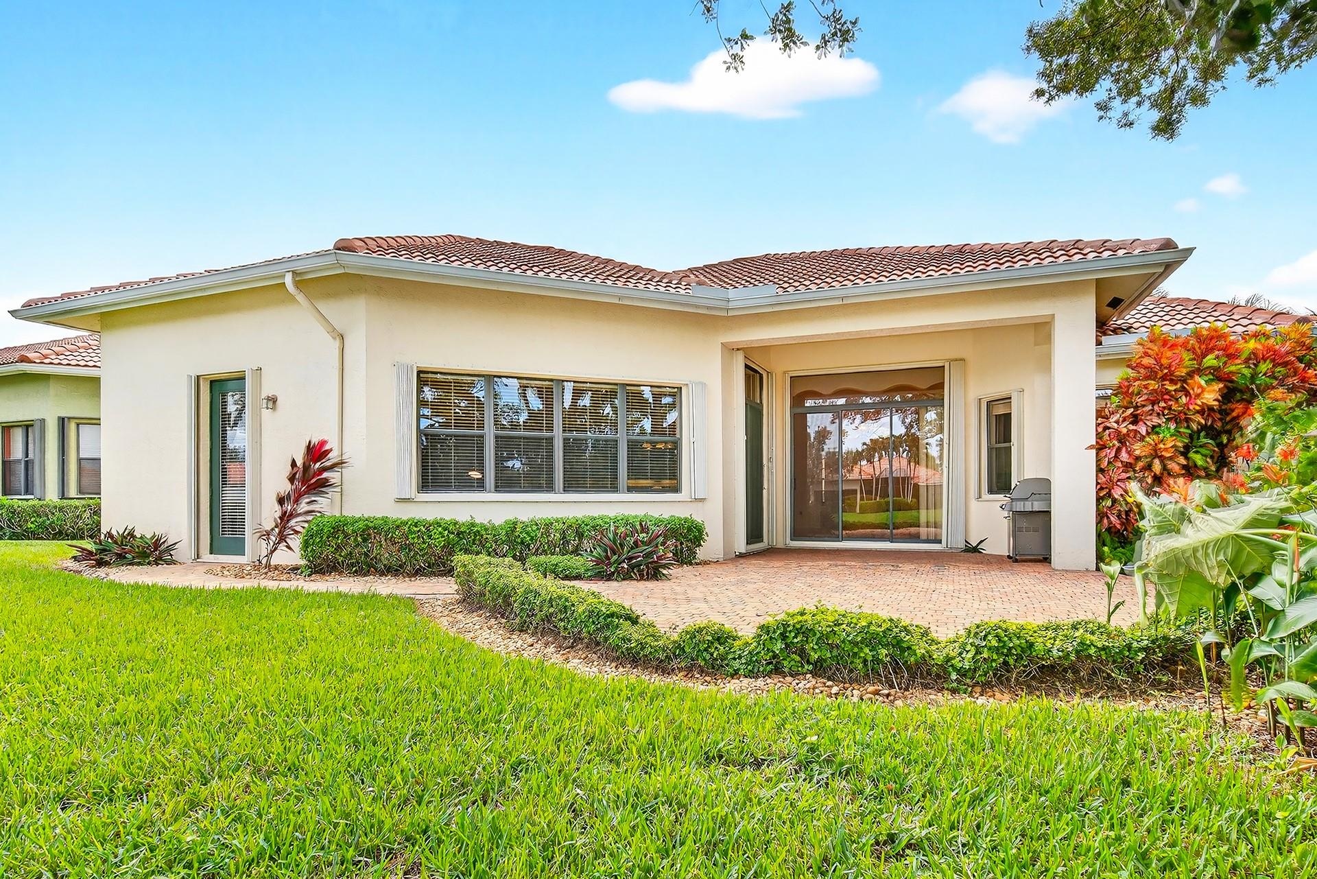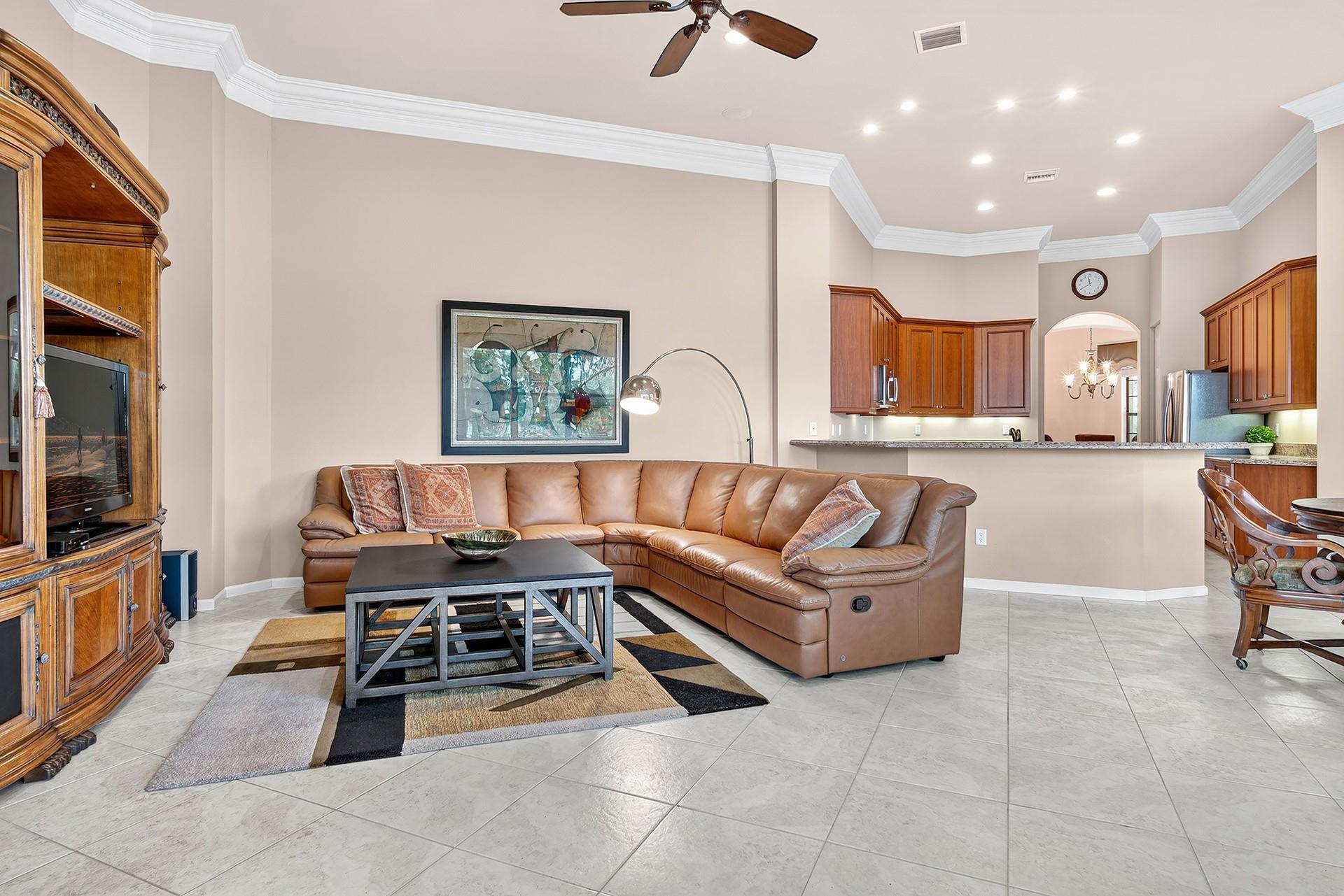Tivoli Lakes | Popular Brunello floor plan (Estate Collection) boasting 3 BR + Den and 2.5 BA. Sited on a beautiful lakefront lot, this expansive one-level Mediterranean-style home offers an open floor plan with multiple entertaining spaces and a covered veranda surrounded by lush landscaping. Soaring 11 ft+ ceiling | Crown molding | Recessed lighting. This fine home offers a 2-car attached garage and an additional 2 parking spaces in the driveway. Tivoli Lakes is a premier gated 55+ community with just 324 homes and manned security 24/7. Relish the active lifestyle with a stunning clubhouse, social hall, card rooms, gathering room with bar, fitness center, and aerobics room. Tennis | Pickleball | Bocce Ball | Billiards | Pool. Convenient to PBI Airport, retail, and the beaches!