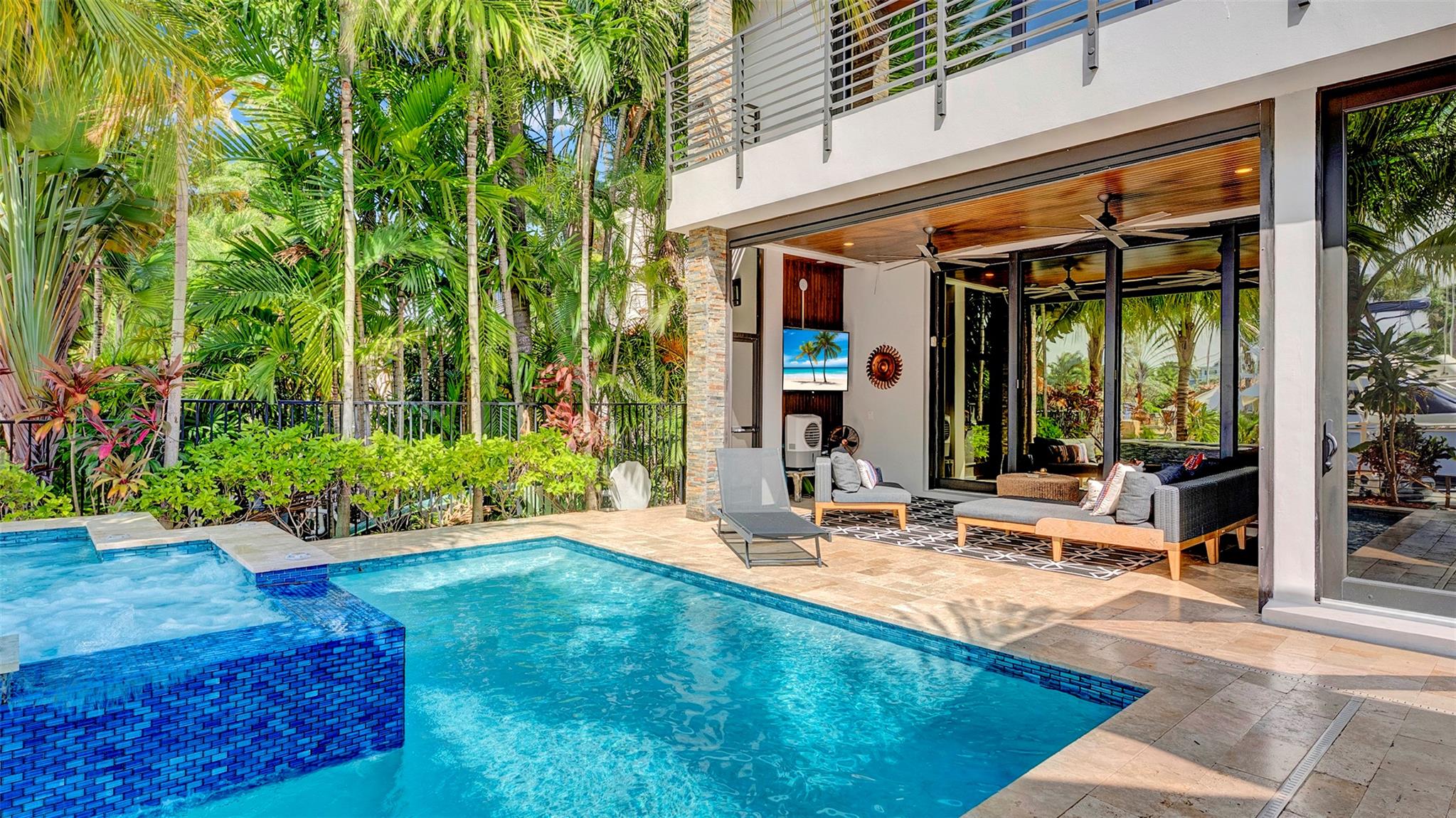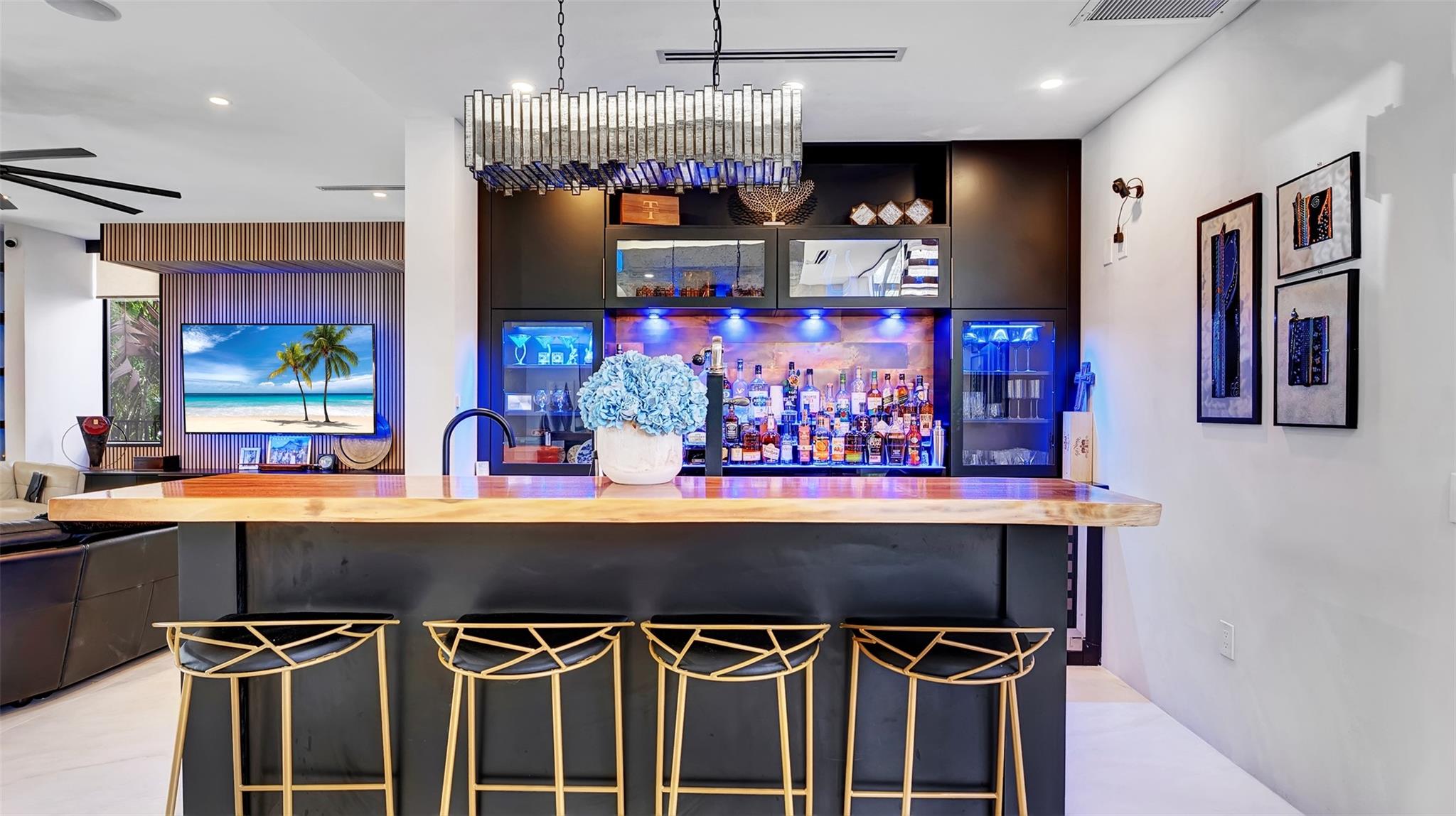 Not your average home on the Las Olas Isles, behind the gates this custom 4-bed, 4.5-bath home spans 4,539 Sqft. Meticulous attention to detail and modern elegance helps define this home, which comes equipped with high-impact windows, 12 camera surveillance system, large porcelain tiles, quartz counters, 8.5 Tons of AC systems, low E windows with bronze tint a floating staircase over a 170-bottle wine cellar, a bar for entertaining, the kitchen has a huge island, 6 burner gas range that overlooks the family room that flows outside through the 11’ pocket sliders to a screened Lani. Outside you can entertain with your pizza oven & grill, pool and jacuzzi, the 50’ dock is well equipped with 30/50 amp. smart illumination by Lutron & Dals. Live luxuriously in this exquisite Idlewyld residence.