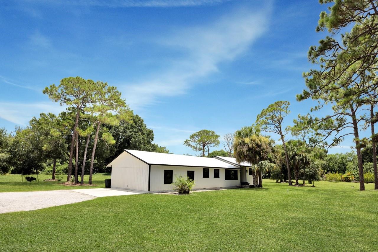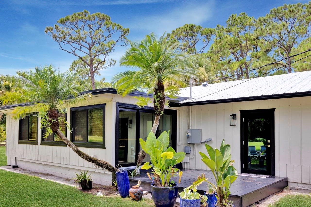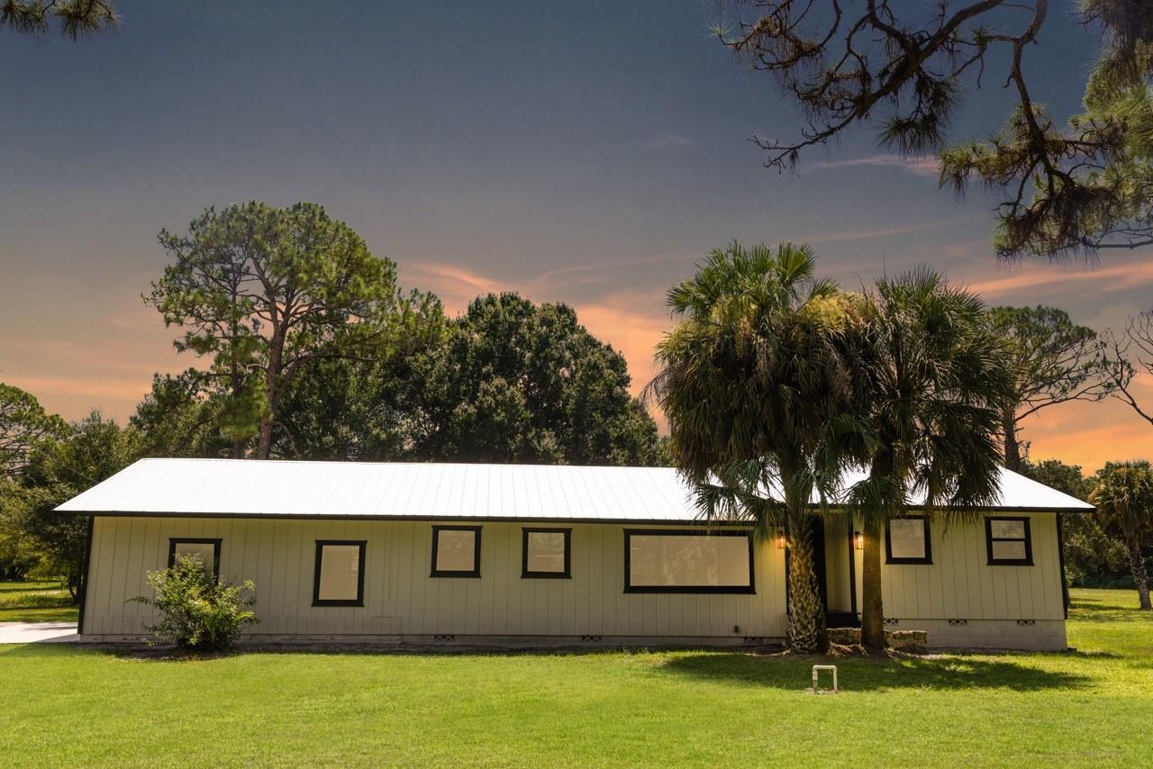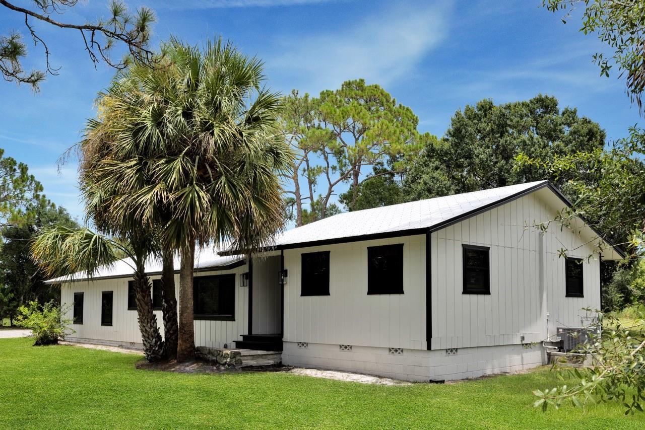 This cozy, newly remodeled three bedroom, two bath home is situated on 5 acres in the farms of Palm City. The rustic modern interior is an open plenum delight sporting high ceilings, exposed joists, a generous kitchen island, and a rec room. The sliding barn doors make the most of every inch. New roof (2023), New windows & doors (2024), repaired siding with fresh paint both inside and outside (2024), New water system & septic (2023), New appliances, re-fortified the sub-flooring, and completely cleared lot make this property & house almost unrecognizable from what it was 15 long months ago! There is also RV hook up which is attached to an outdoor shower & separate stand alone patio.
