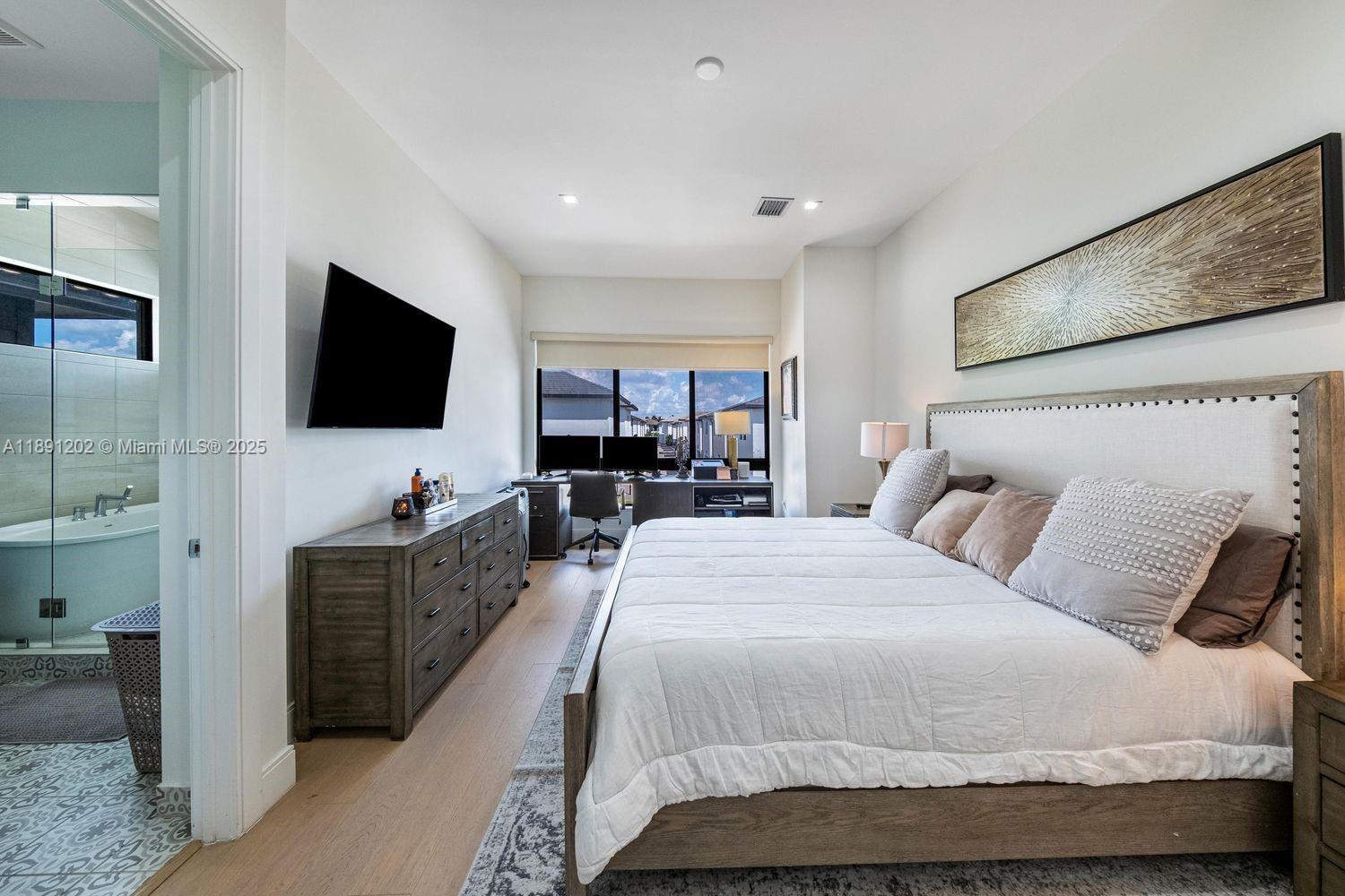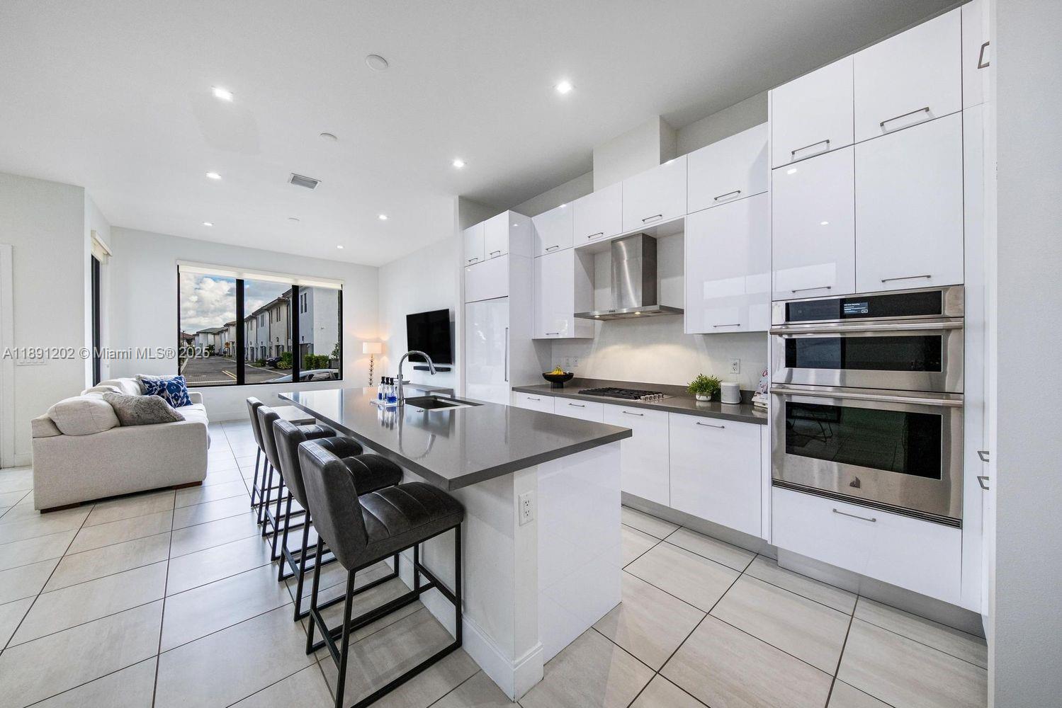 4-bedroom, 4.5-bath home built in 2023 in the Canarias community at Downtown Doral. This spacious and modern residence features an open-concept layout with high ceilings, high impact windows with abundant natural light, and a chef-style kitchen with quartz countertops, Italian cabinetry, stainless steel appliances, and a large island. All bedrooms have ensuite bathrooms, and the laundry room is conveniently located upstairs. The primary suite includes a walk-in closet and spa-inspired bath. A paved private patio and 2-car garage add to the appeal. Located near top-rated schools, major highways, Miami International Airport, shopping, and dining, with access to resort-style amenities including a clubhouse, pool, and fitness center. The property is vacant and ready for immediate occupancy. Easy to show.