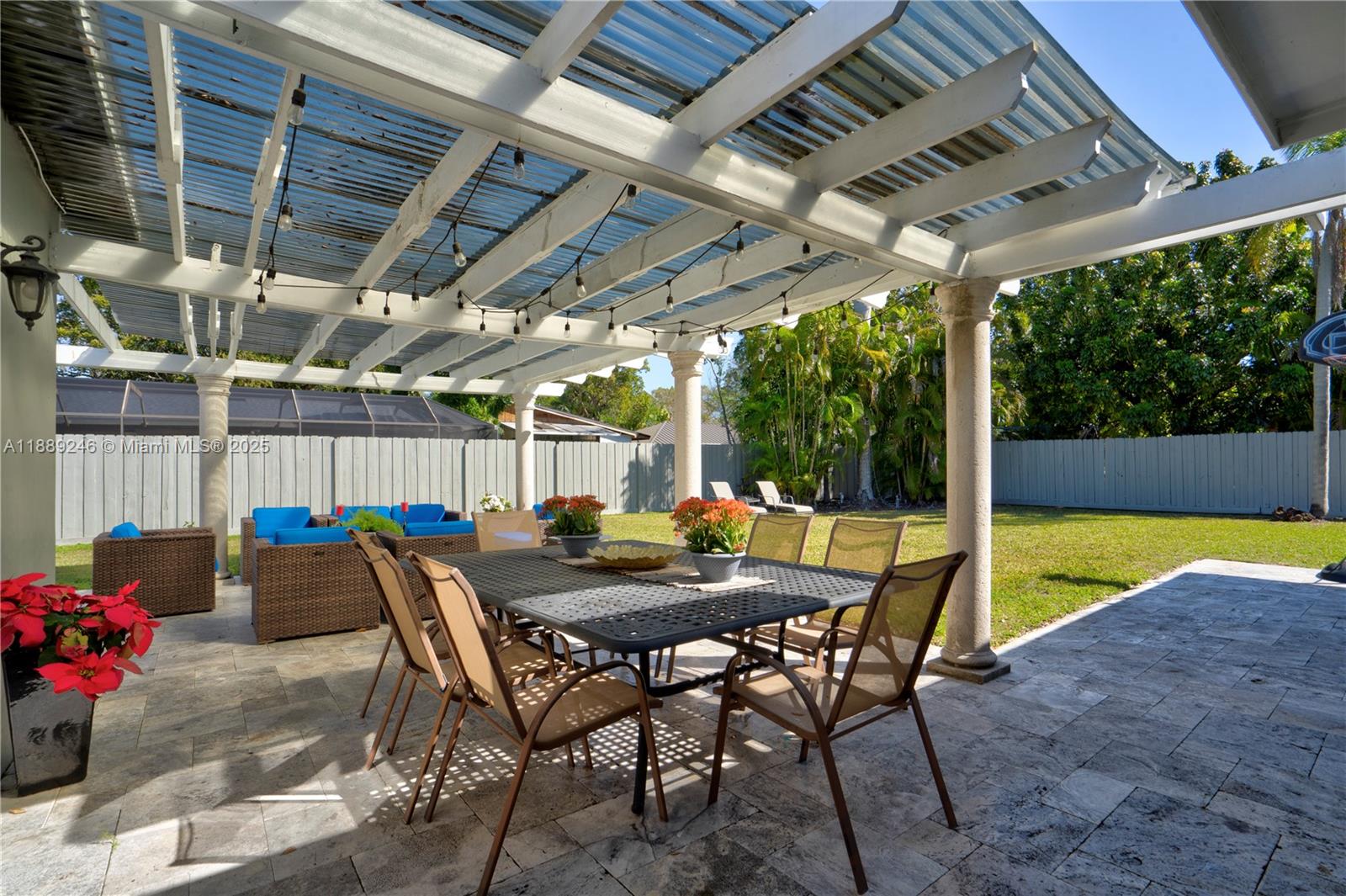 The perfect home at Pine Shores. 3,031 Total square feet home, remodeled with newer roof, A/C system, open kitchen. Beautiful custom courtyard with fountain make the entry a perfect welcome. Amazing space inside with large living room and family room. Fourth bedroom can be a library or in law quarters as it has separate entrance and is located on other side of home. The lot is larger than average and totally gated with mature trees. Wonderful wrap around terrace with various sitting areas. Property is located in top rated public schools area and only minutes from the Falls Shopping Center.