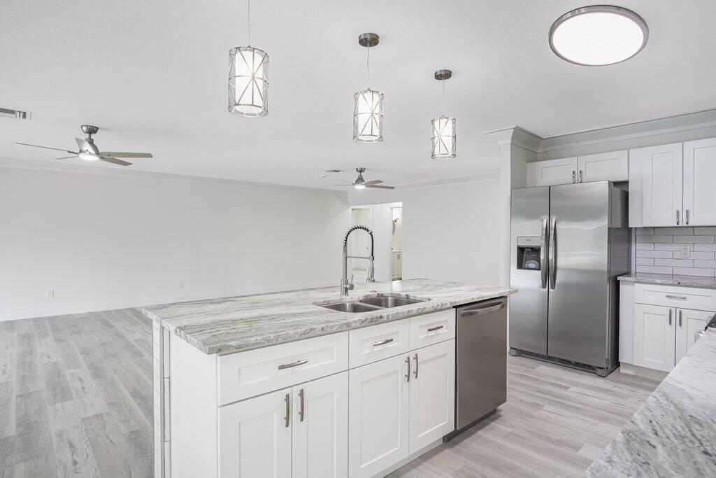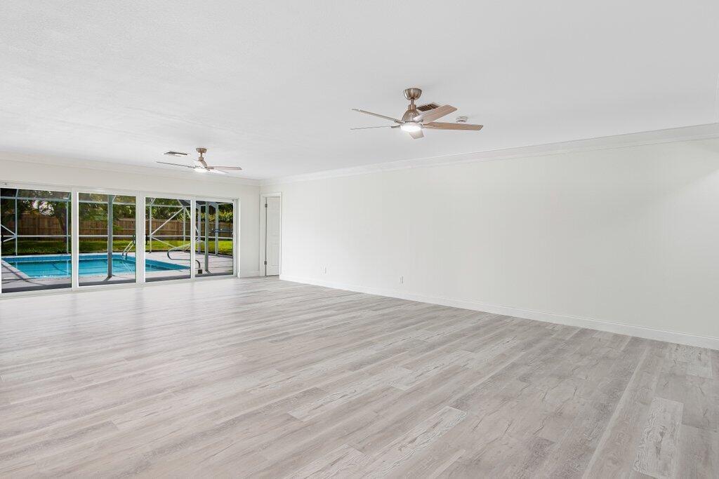 Stunning renovated 3BR/2BA pool home on a large corner lot with fenced yard. Featuring a gourmet kitchen with custom white cabinets, granite countertops & stainless steel appliances, opening to a spacious great room overlooking the pool. The master suite offers a new vanity & luxurious two-person shower, while the guest bath is updated with new vanity, tile & fixtures. Luxury flooring throughout. Roof 2024, new AC, water heater, impact windows & doors. Perfect blend of style, comfort & modern upgrades.