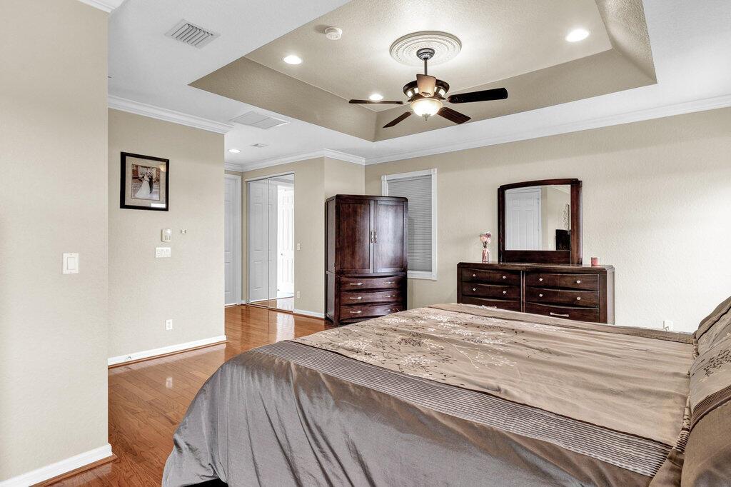 Welcome home to stunning lake views and custom upgrades. Every detail has been carefully curated from the inviting interior to the private outdoor oasis. Inside, you'll find a custom kitchen featuring granite, solid wood cabinetry, tile backsplash, and stainless steel appliances. The family room includes beautiful solid wood built-ins, while both the guest and primary baths showcase designer tile, solid wood vanities, and a stand-alone soaking tub. Step outside to enjoy incredible lake views from your pool situated on an estate-sized lot with 30+ feet between homes. This property offers exceptional space and privacy. Additional features include a whole house repipe, crown molding, chair rails, a custom pantry, hardwood stairs, and so much more. All boxes checked. See Virtual Tour.