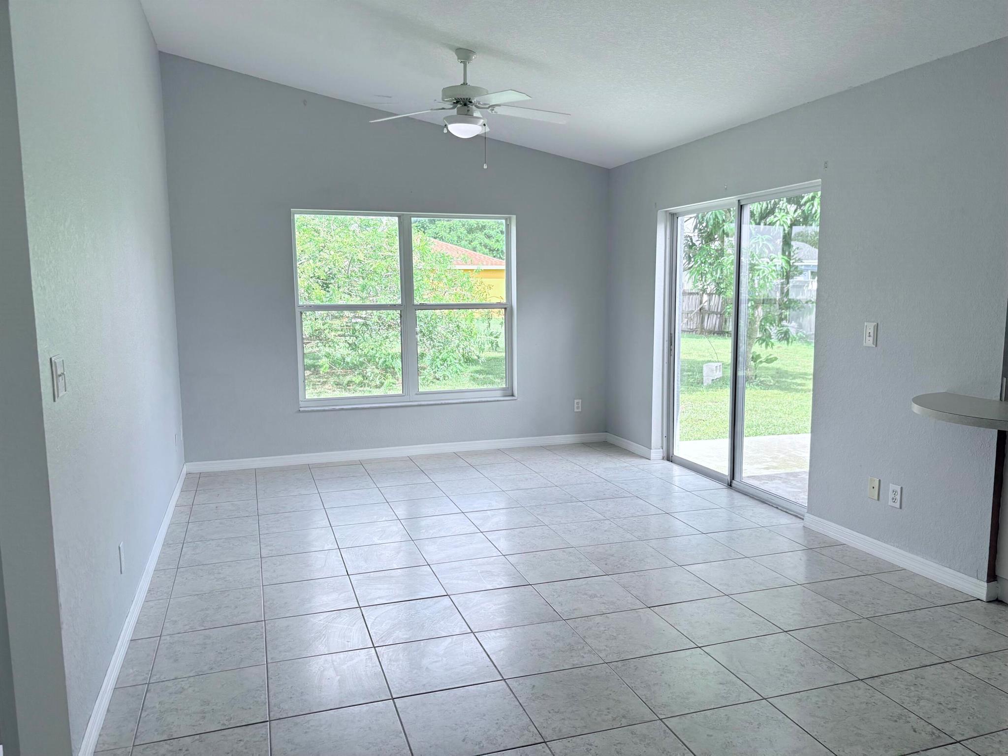 Welcome to this beautifully designed three-bedroom, two-bathroom home with a two-car garage! Built with durable CBS construction, this home features a brand-new roof installed in August 2025. Located in the heart of Port St. Lucie, it offers spacious formal areas including a living room, dining room, and family room--all with tile flooring throughout.One of the standout features of this property is the versatile flex room, perfect for a private office, nursery, workout space, or anything your imagination inspires. Inside, you'll also find an indoor laundry area, a utility closet, and a spacious master bedroom with two closets--one of them a walk-in.With a lush backyard featuring several fruit trees and an open patio, ideal for relaxing or grilling with family. Schedule an Appt. today.