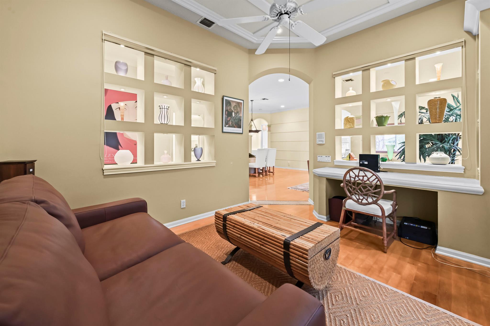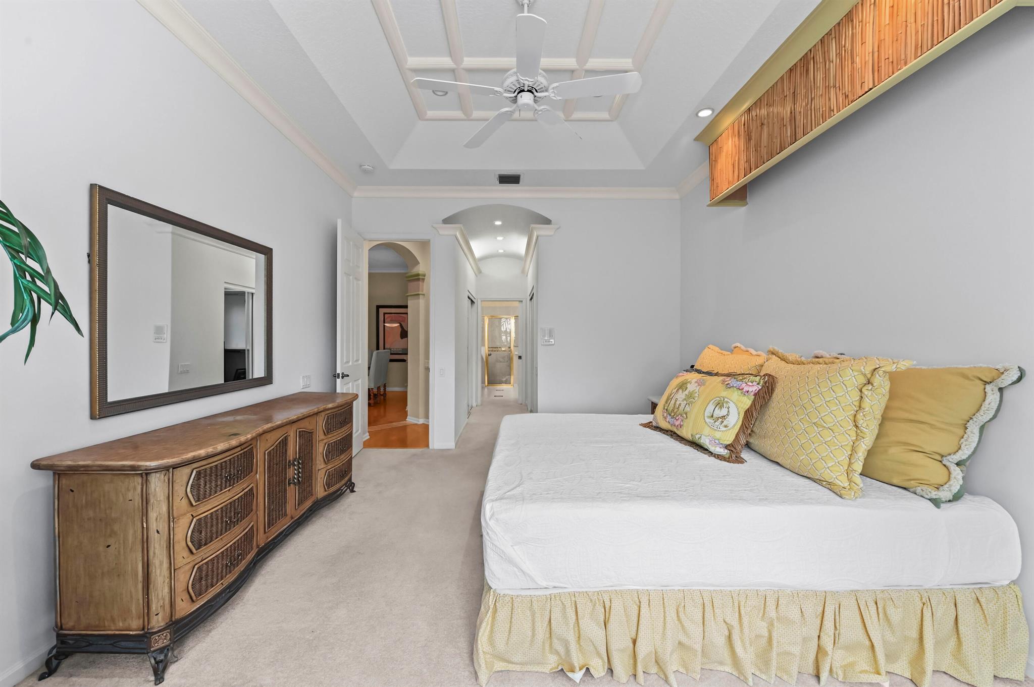 Welcome to this Mediterranean-style home, perfectly situated in the desirable 55+ community of the Cascades in Boynton Beach. The original owner residence offers striking curb appeal, featuring a tile roof, a paver driveway, and lush, tropical landscaping. Step through the elegant etched-glass double entry doors into a grand foyer defined by polished wood-look flooring, architectural archways, and decorative niches. The spacious main living areas are ideal for entertaining, boasting formal dining and sitting rooms, with an elegant flow and built in Bose sound system. One of the communities model homes, details include a sophisticated built-in aquarium and custom display shelving that add to the home's distinctive charm.
