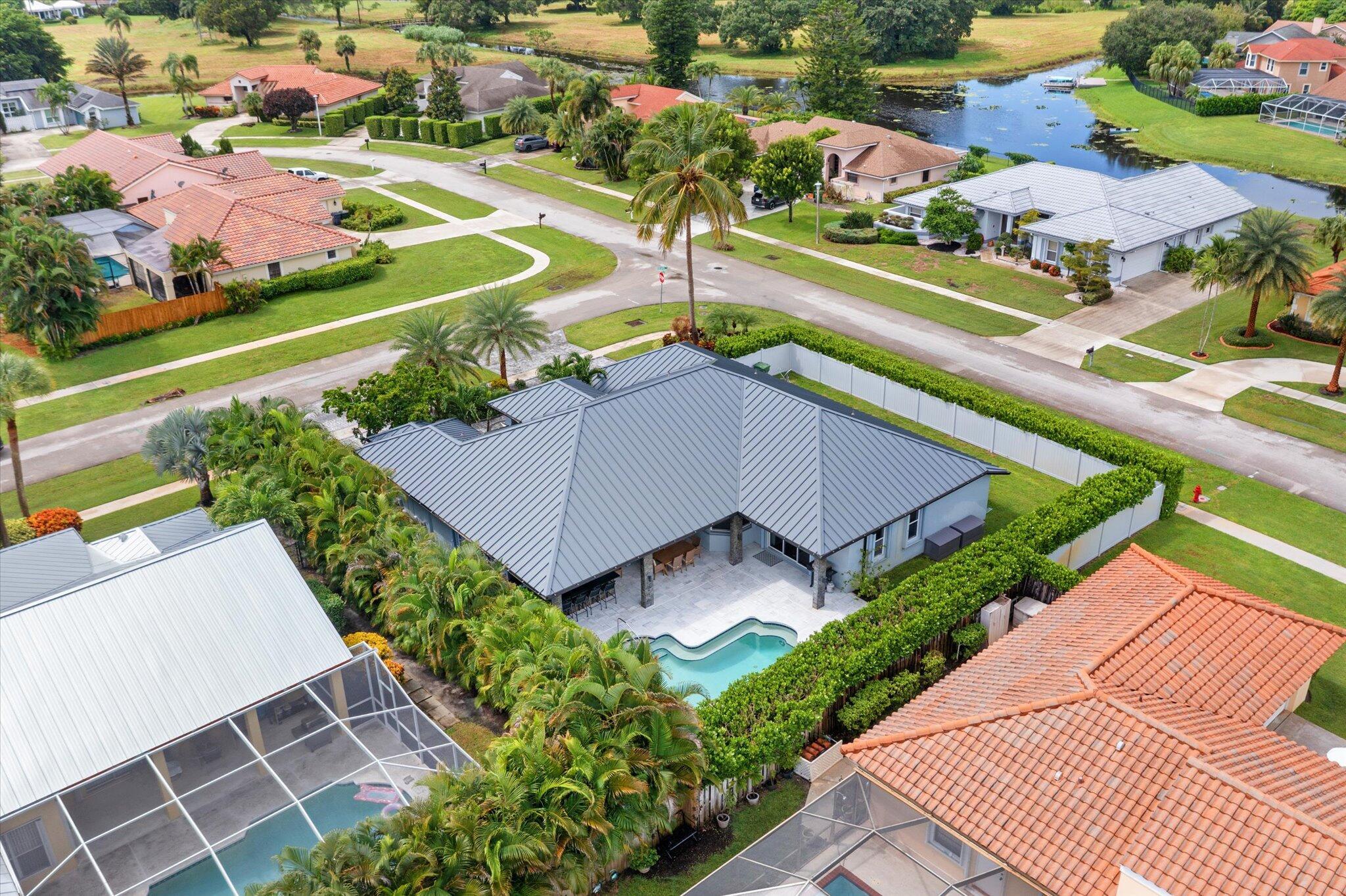 Claim your piece of paradise with this Wellington Charmer. No HOA. New Luxury Metal Roof in 2022. Renovated with 4 main bedrooms and 3.5 bathrooms + a bonus room/den with side entry door. The fully fenced-in backyard is a private oasis with mature clusia hedges, renovated stone pavered deck, crisp aqua blue pool, fully equipped custom patio bar. Large covered lanai with LED lights to brighten up your evening entertaining. 2 car garage with rubber flooring, and custom storage. Extended circular driveway the maximize guest parking spots. Open split floor plan. Offering an open kitchen to the family room and a formal living room connected to a formal dining room. Accordion storm shutters. Private corner lot with spacious back & side yard.