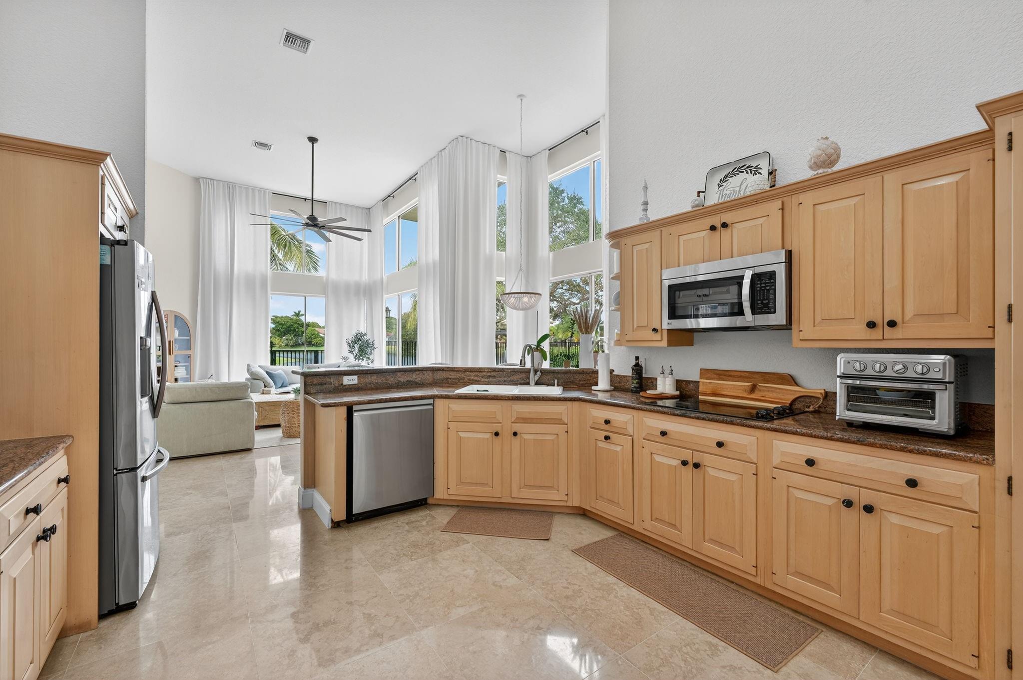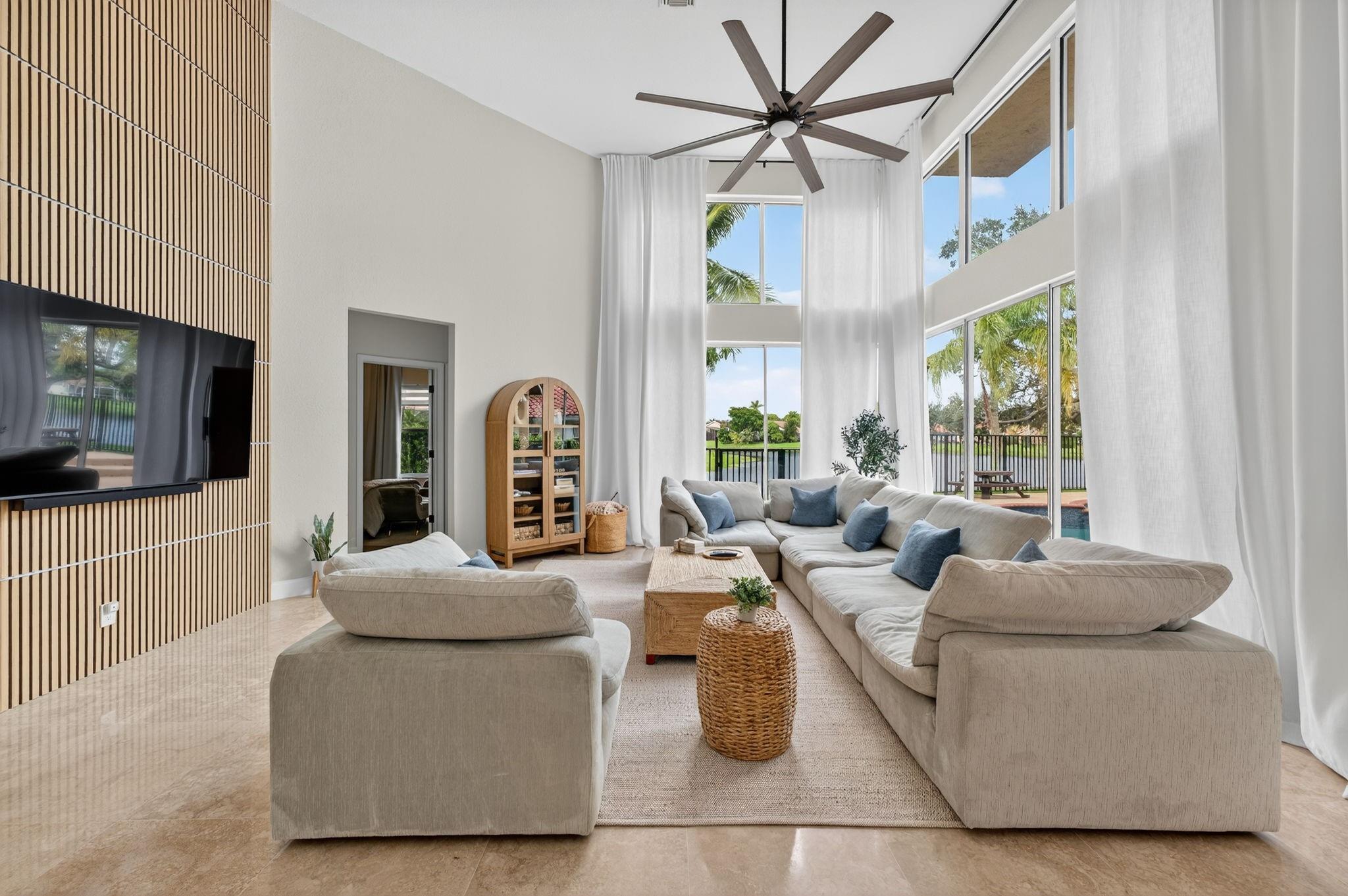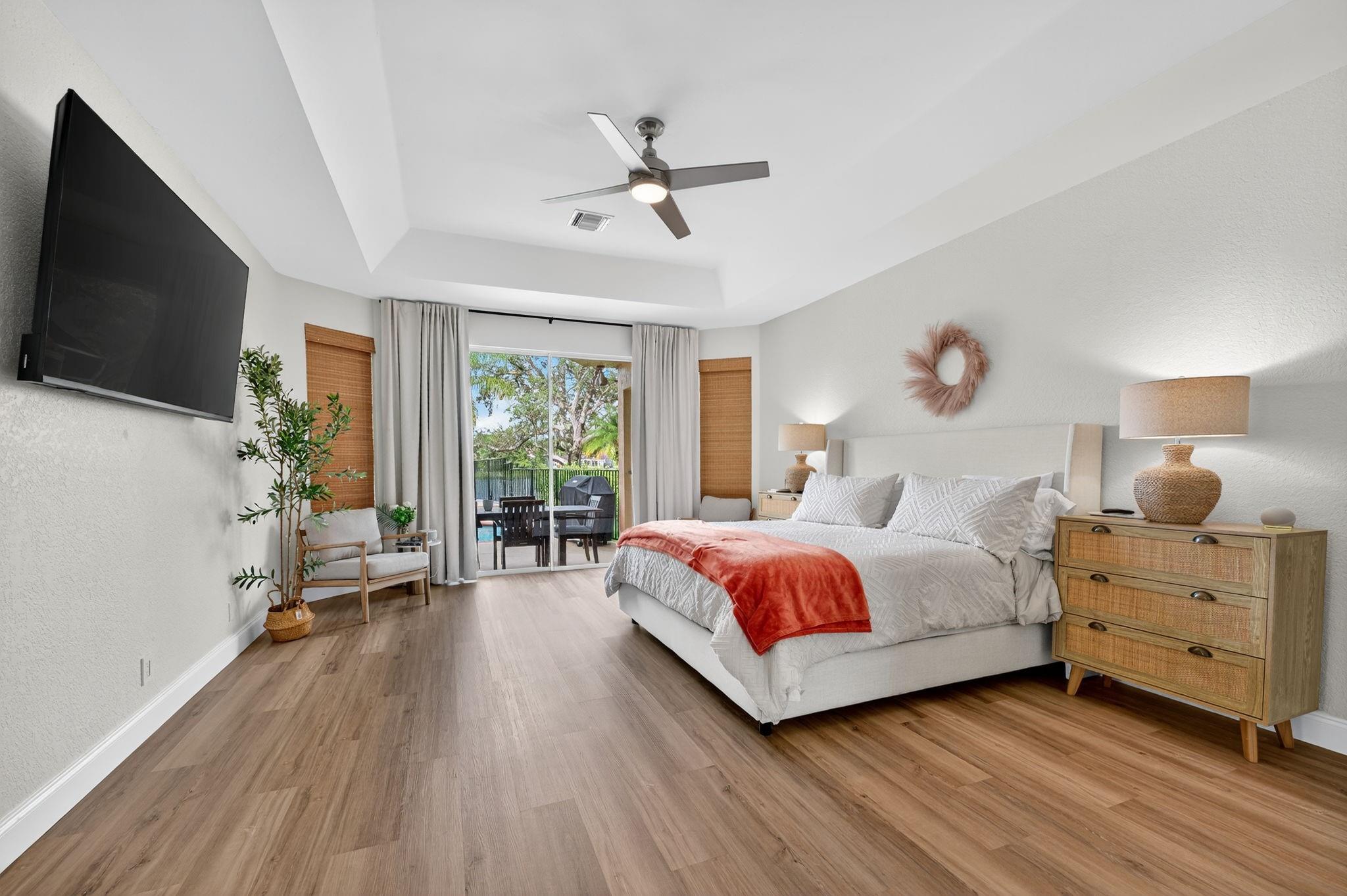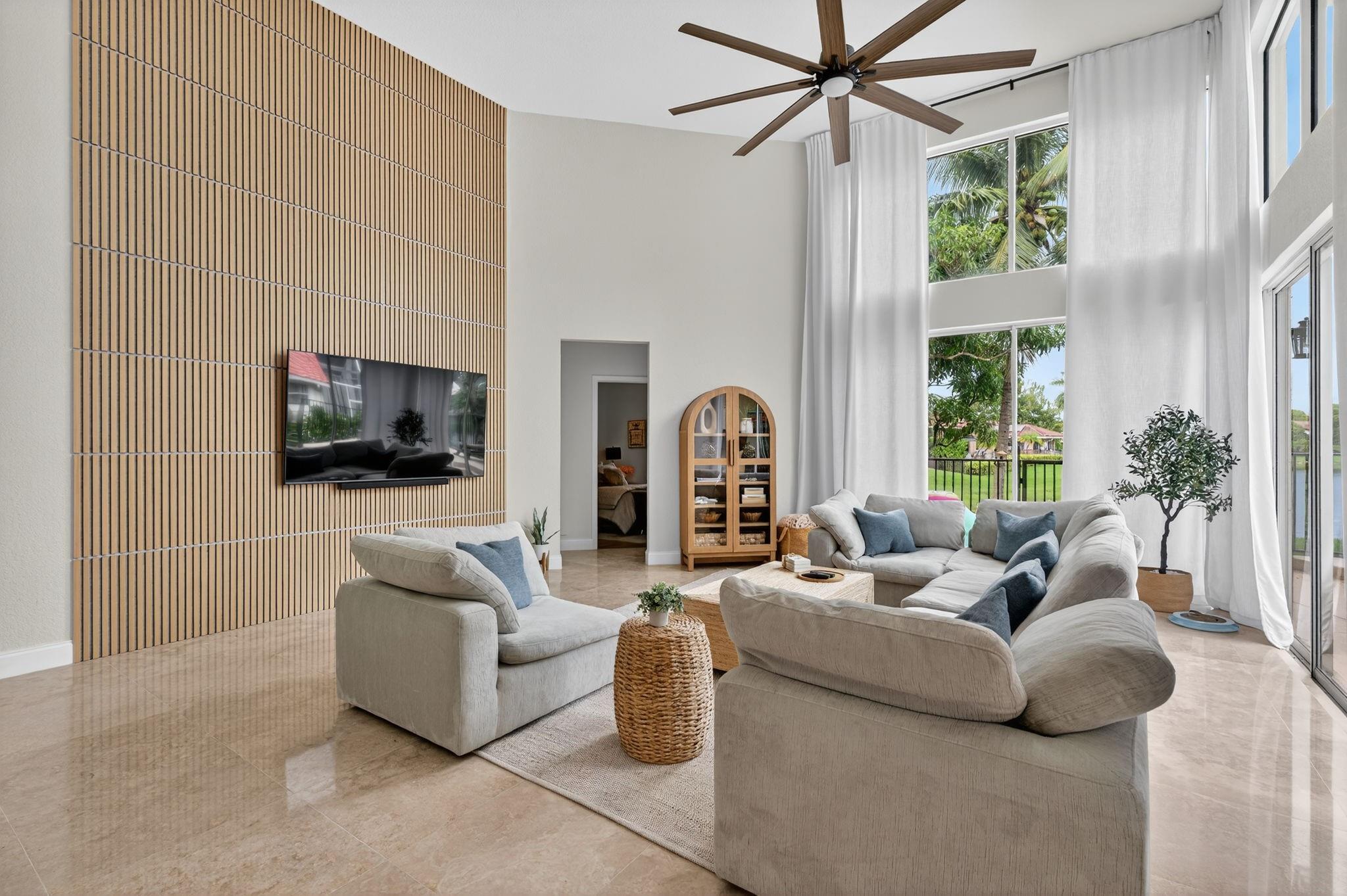 Beautifully maintained one-story home in the sought-after Brookside Grove community. Enjoy stunning lakefront views and a spacious layout ideal for modern living. Upgrades: New floating floors in all bedrooms, renovated bathrooms, built-out closets, and new curtains and blinds. Newer washer, dryer, fridge, new pool heater, and updated sprinkler systems. Master Suite: Features a separate tub, glass-enclosed shower, dual sinks, and a walk-in closet. Living Space: Expansive living area flows into a separate dining room, with a well-appointed kitchen showcasing a large island, snack bar, and ample cabinetry with granite countertops. Set on a 1/3-acre lot with mango and coconut trees, private hedges, and picturesque lake views.