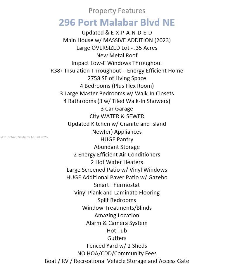 Updated & EXPANDED! Main House w/ MASSIVE ADDITION (2023)! Large OVERSIZED Lot .35 Acres! New Metal Roof! Impact Low-E Windows Throughout! R38+ Insulation - Energy Efficient! 2758 SF of Living Space! 4 Bedrooms (Plus Flex Room)! 3 Master Bedrooms w/ Walk-in Closets! 4 Bathrooms! 3 Car Garage! City WATER & SEWER! Updated Kitchen w/ Granite and Island! New(er) Appliances! HUGE Pantry! Abundant Storage! 2 Energy Efficient Air Conditioners! 2 Water Heaters! Large Screened Patio w/ Vinyl Windows! HUGE Additional Paver Patio w/ Gazebo! Boat / RV / Recreational Vehicle Storage and Access Gate! Vinyl Plank and Laminate Flooring! Split Bedrooms! Window Treatments/Blinds! Alarm & Camera System! Hot Tub! Gutters! 2 Large Sheds! NO HOA/CDD/Community Fees!