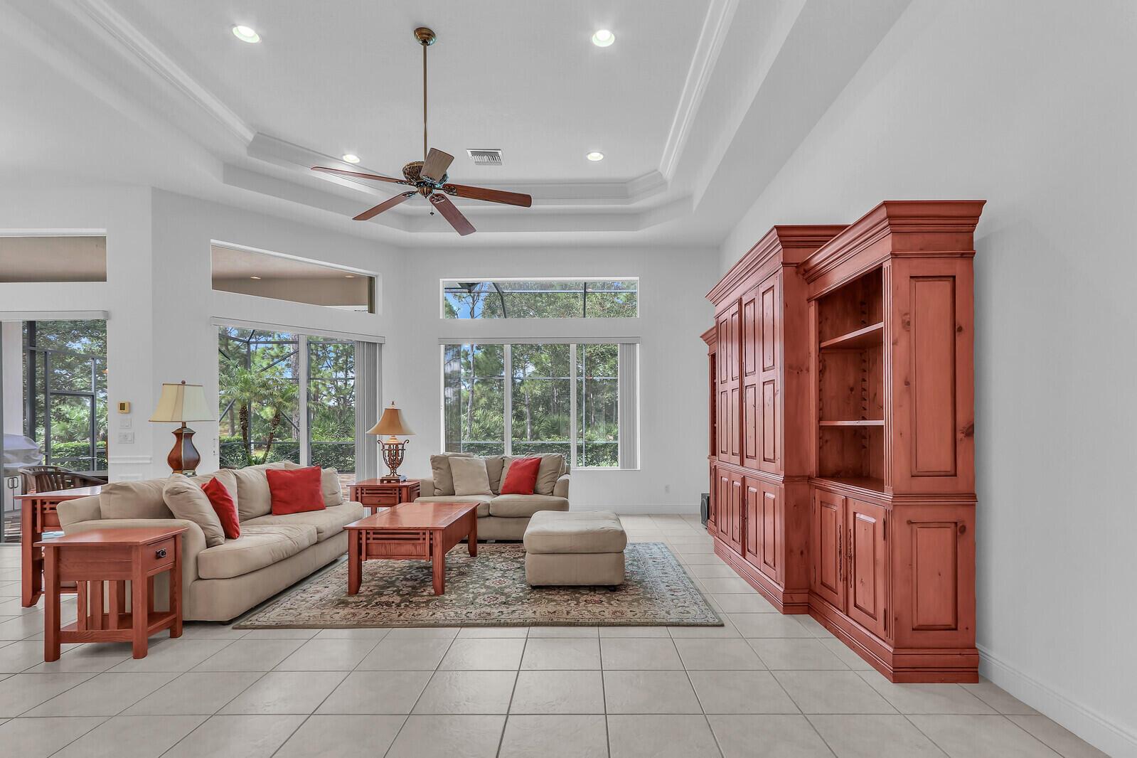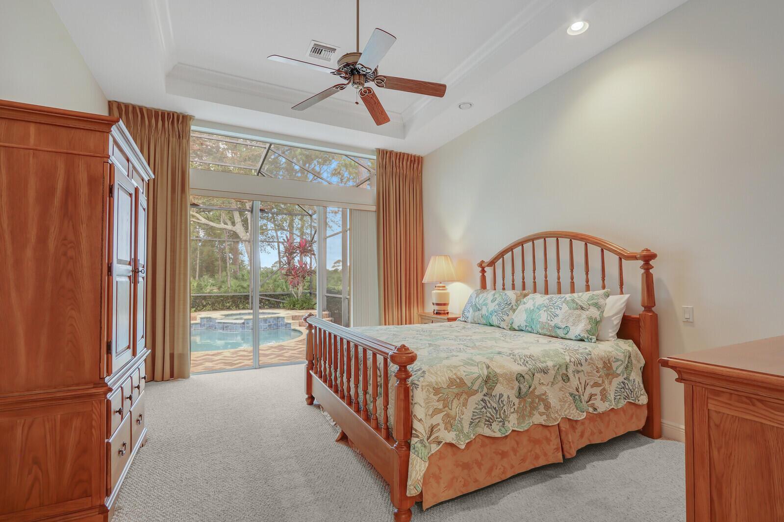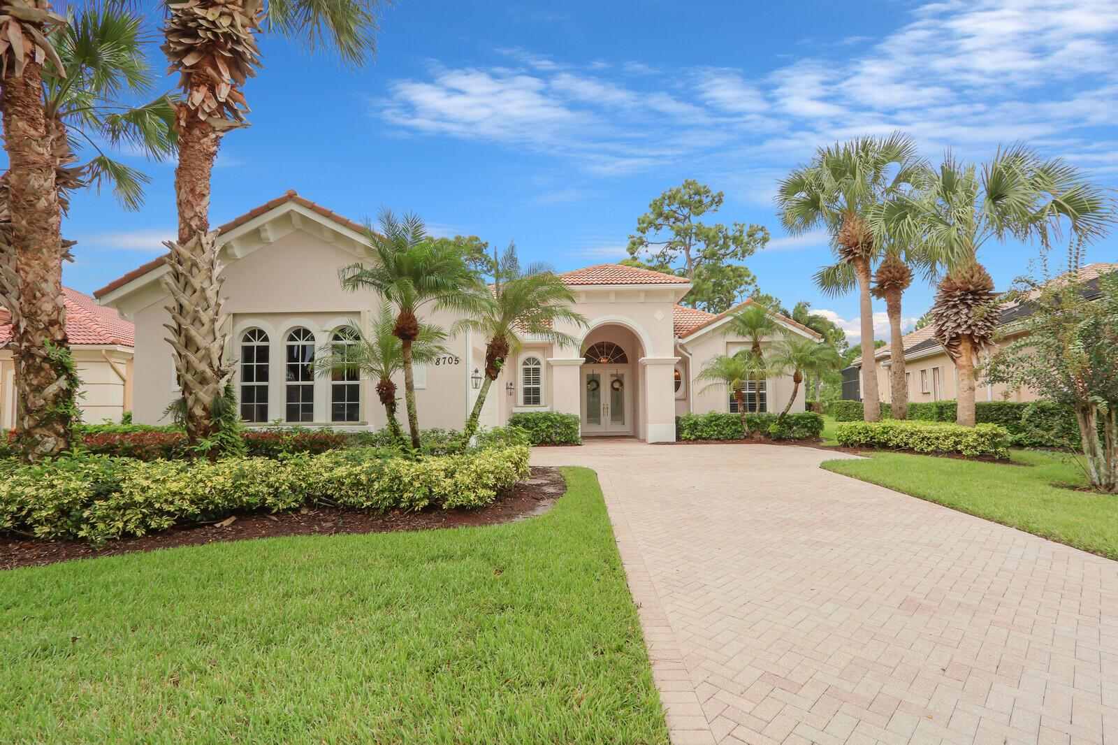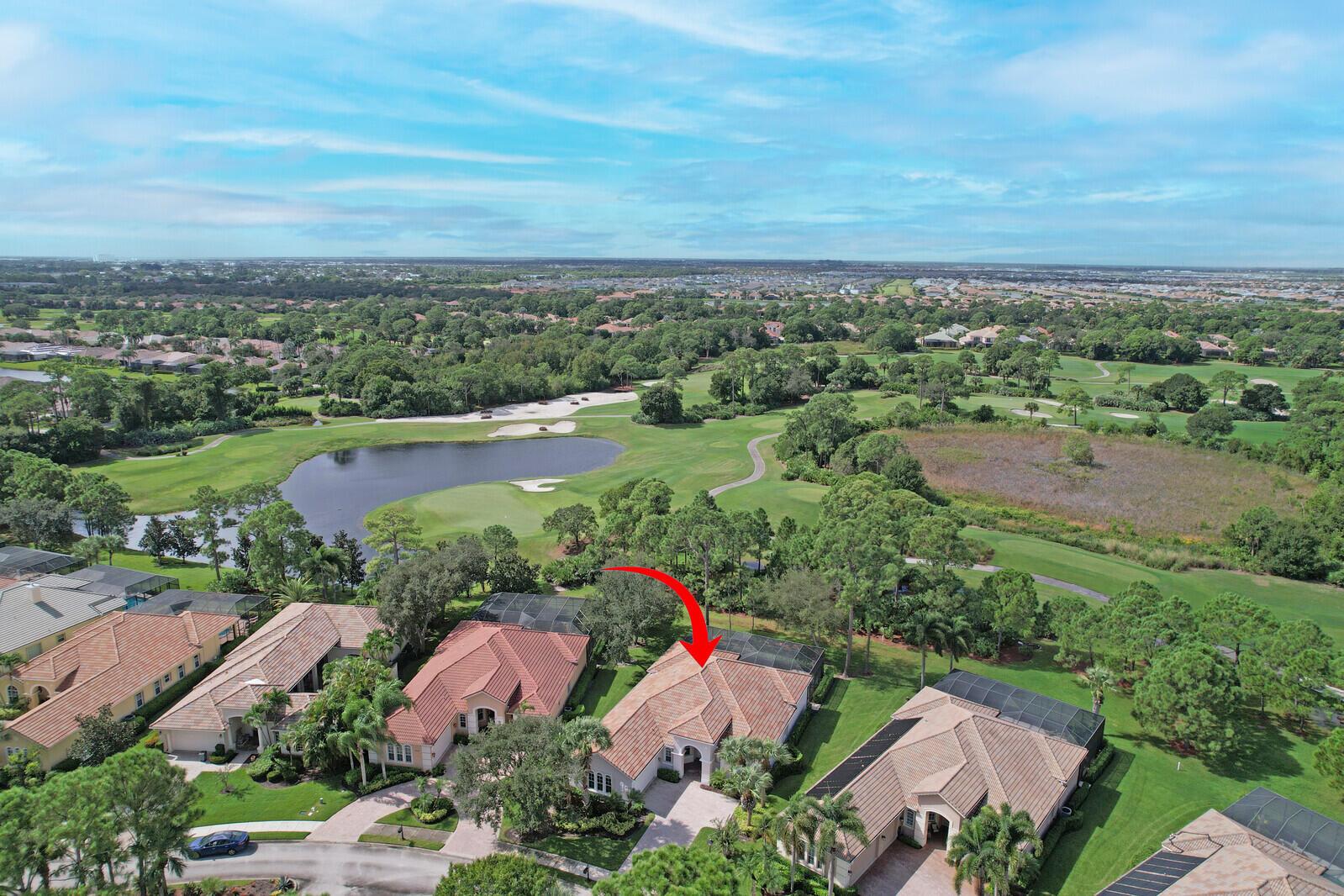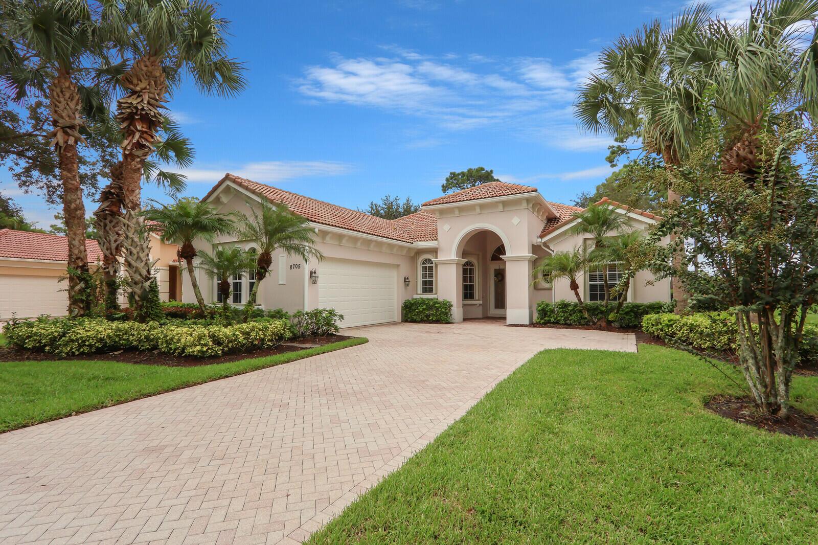 PERFECTLY POSITIONED ON THE GOLF COURSE! Exquisite 3-bedroom plus den in desirable PGA Village. This 2,700 sq ft residence features a sought-after great room floor plan with 3 ensuite-bedrooms & powder room. Enjoy elegant finishes including white cabinetry, granite countertops, SS appliances, wood detailing & a custom bar. The outdoor oasis offers a resurfaced pool & spa (2024), summer kitchen & covered lanai-ideal for entertaining. Meticulously maintained with newer A/Cs, whole house generator & accordion shutters, nearly all major systems replaced within 5 years. Freshly painted inside & out, offered partially furnished-move-in ready with comfort, style & peace of mind! PGA Village is a golfer's paradise with 4 golf courses & the Island club with pool, fitness, pickleball & more!