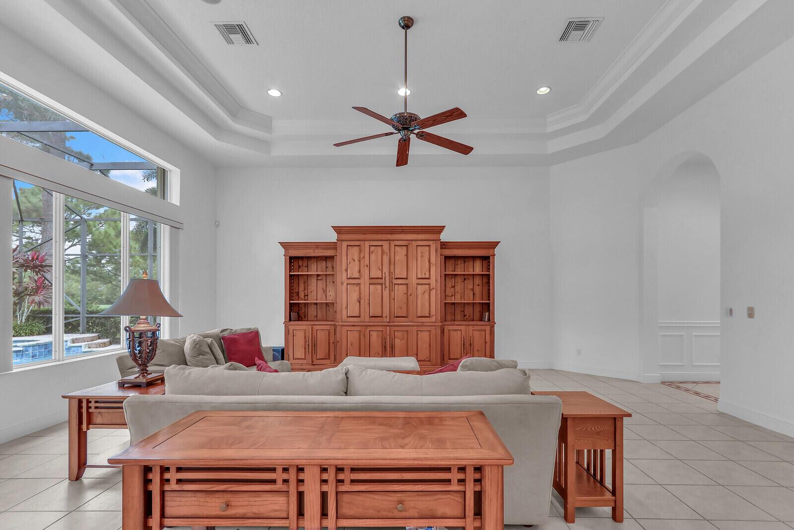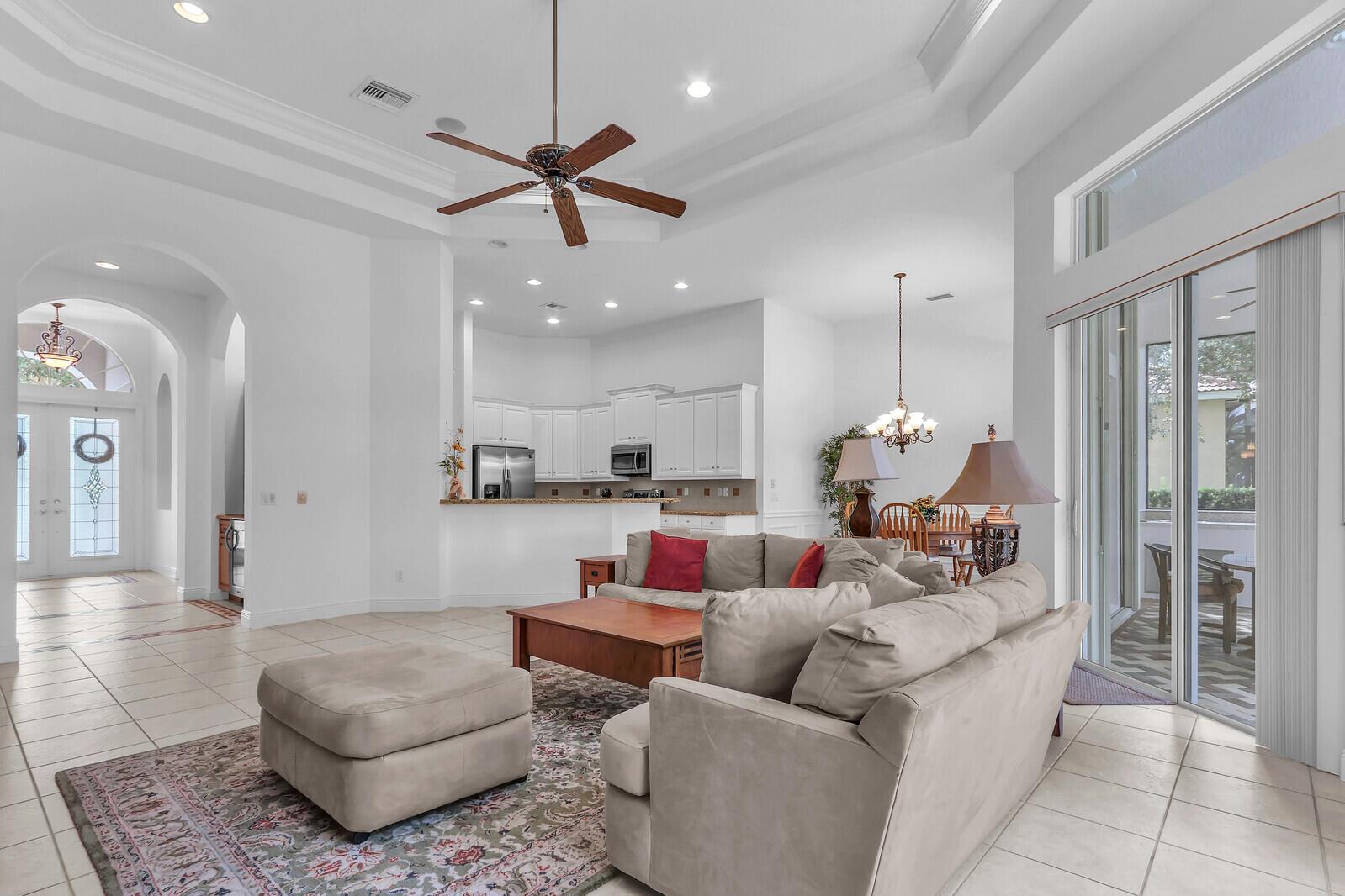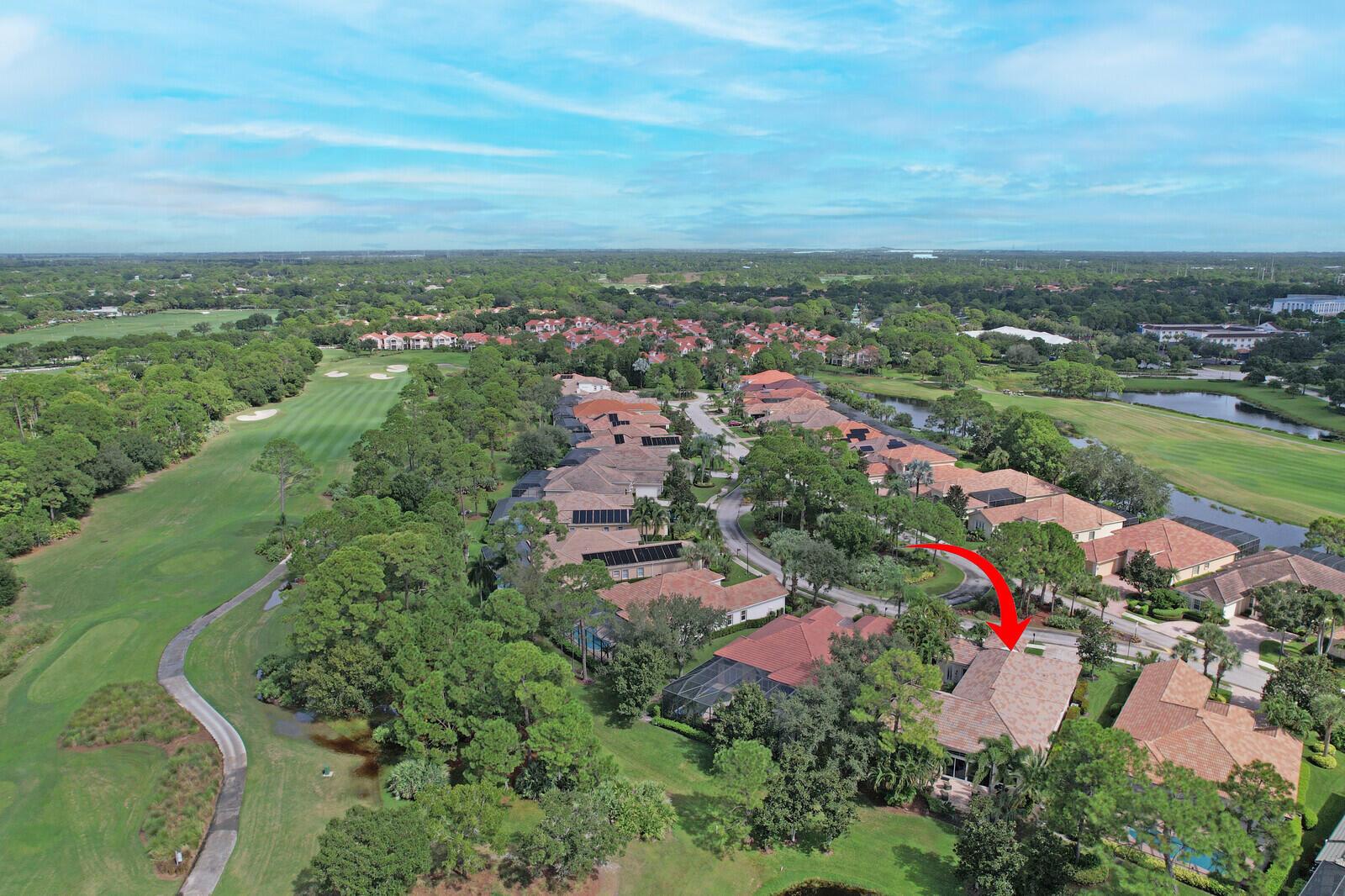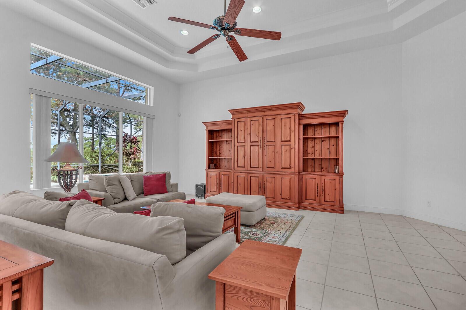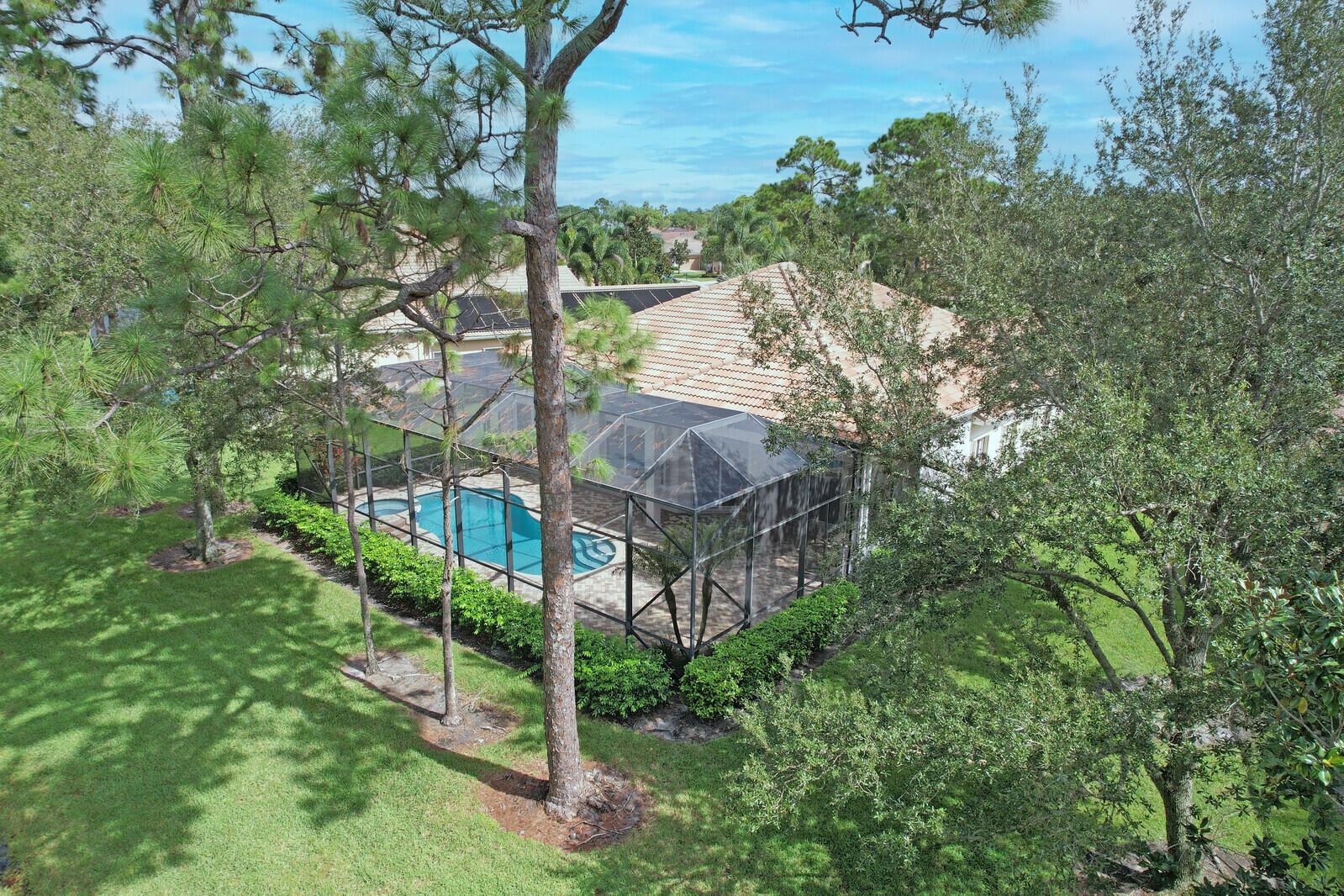 PERFECTLY POSITIONED ON THE GOLF COURSE! Exquisite 3-bedroom plus den in desirable PGA Village. This 2,700 sq ft residence features a sought-after great room floor plan with 3 ensuite-bedrooms & powder room. Enjoy elegant finishes including white cabinetry, granite countertops, SS appliances, wood detailing & a custom bar. The outdoor oasis offers a resurfaced pool & spa (2024), summer kitchen & covered lanai-ideal for entertaining. Meticulously maintained with newer A/Cs, whole house generator & accordion shutters, nearly all major systems replaced within 5 years. Freshly painted inside & out, offered partially furnished-move-in ready with comfort, style & peace of mind! PGA Village is a golfer's paradise with 4 golf courses & the Island club with pool, fitness, pickleball & more!
