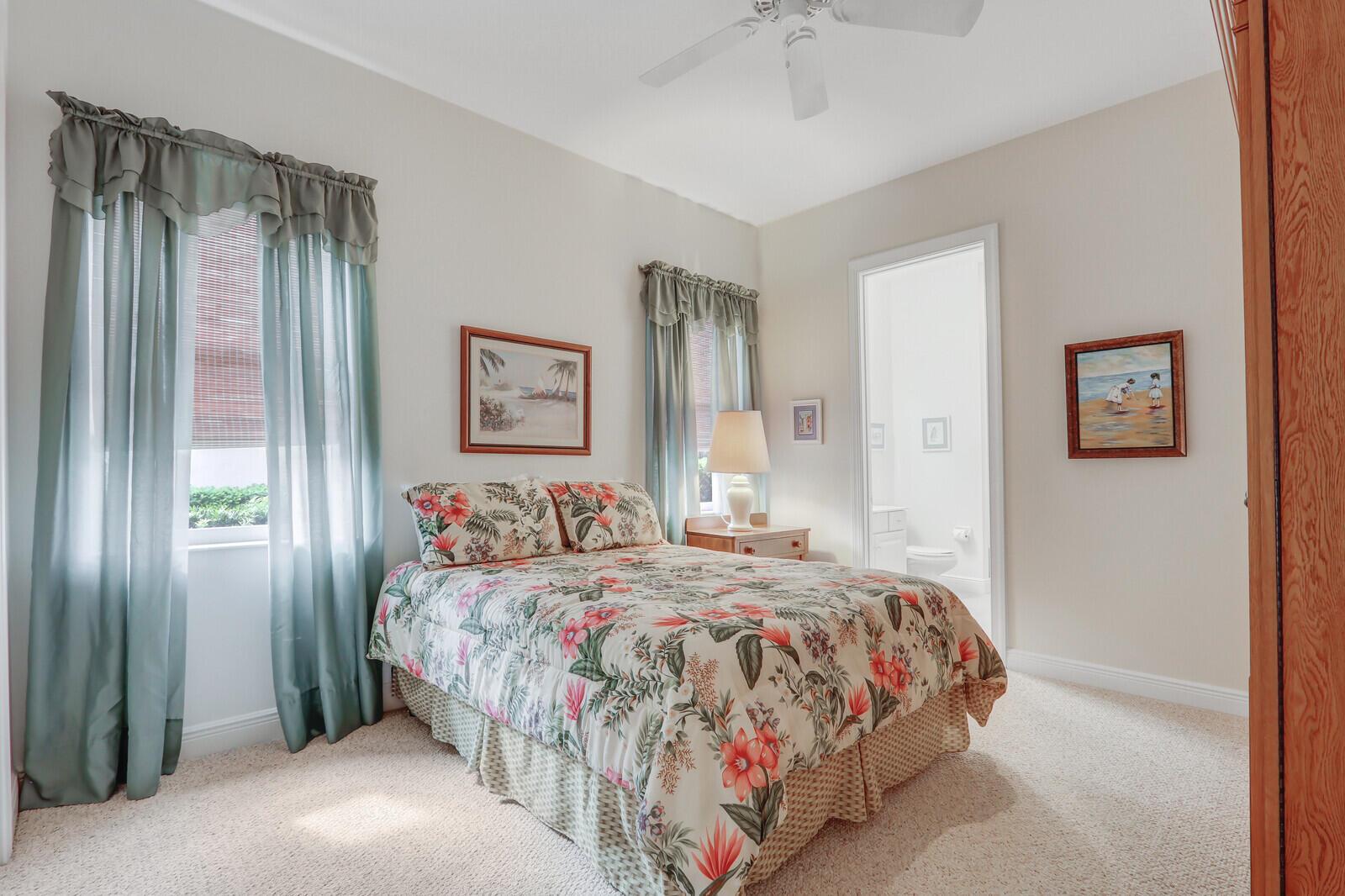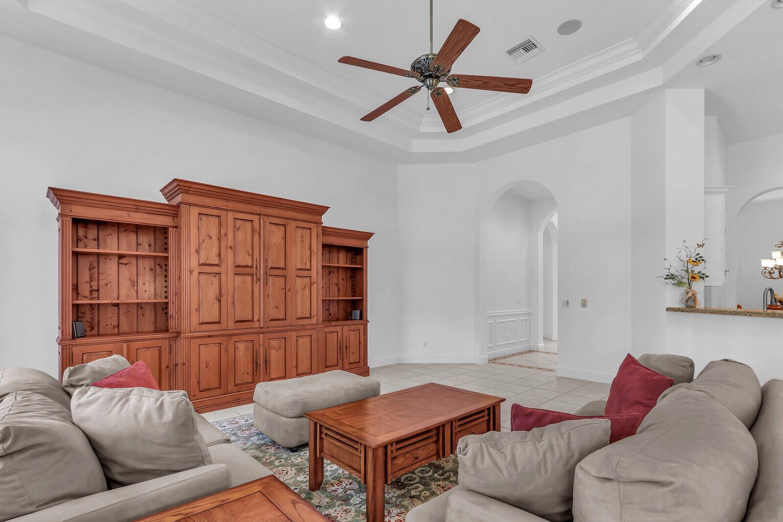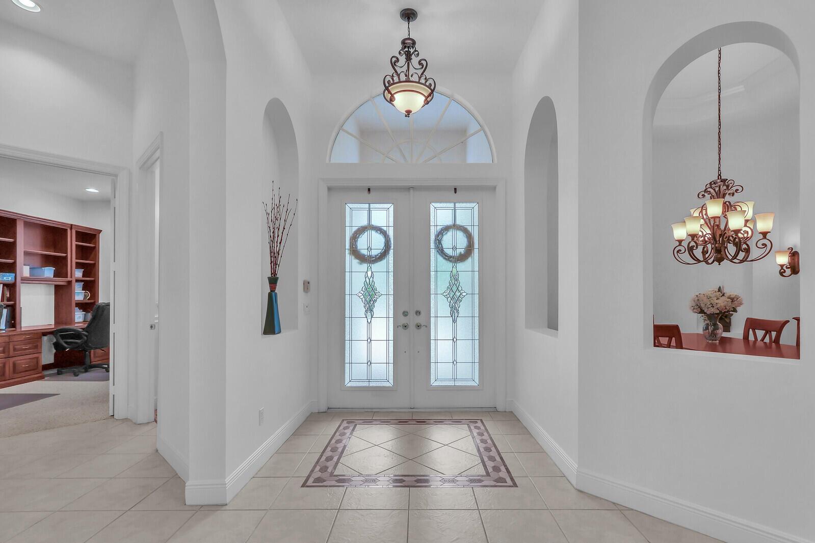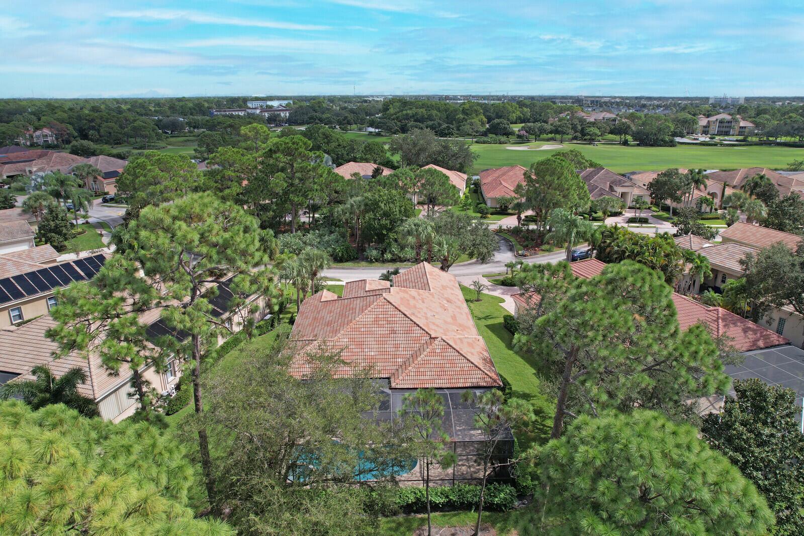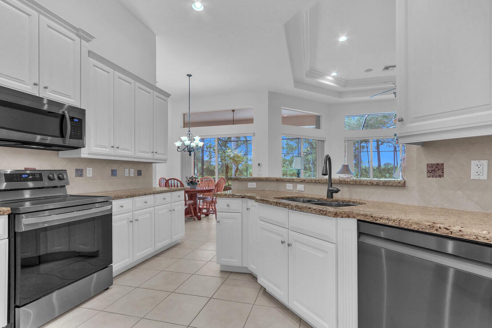 PERFECTLY POSITIONED ON THE GOLF COURSE! Exquisite 3-bedroom plus den in desirable PGA Village. This 2,700 sq ft residence features a sought-after great room floor plan with 3 ensuite-bedrooms & powder room. Enjoy elegant finishes including white cabinetry, granite countertops, SS appliances, wood detailing & a custom bar. The outdoor oasis offers a resurfaced pool & spa (2024), summer kitchen & covered lanai-ideal for entertaining. Meticulously maintained with newer A/Cs, whole house generator & accordion shutters, nearly all major systems replaced within 5 years. Freshly painted inside & out, offered partially furnished-move-in ready with comfort, style & peace of mind! PGA Village is a golfer's paradise with 4 golf courses & the Island club with pool, fitness, pickleball & more!