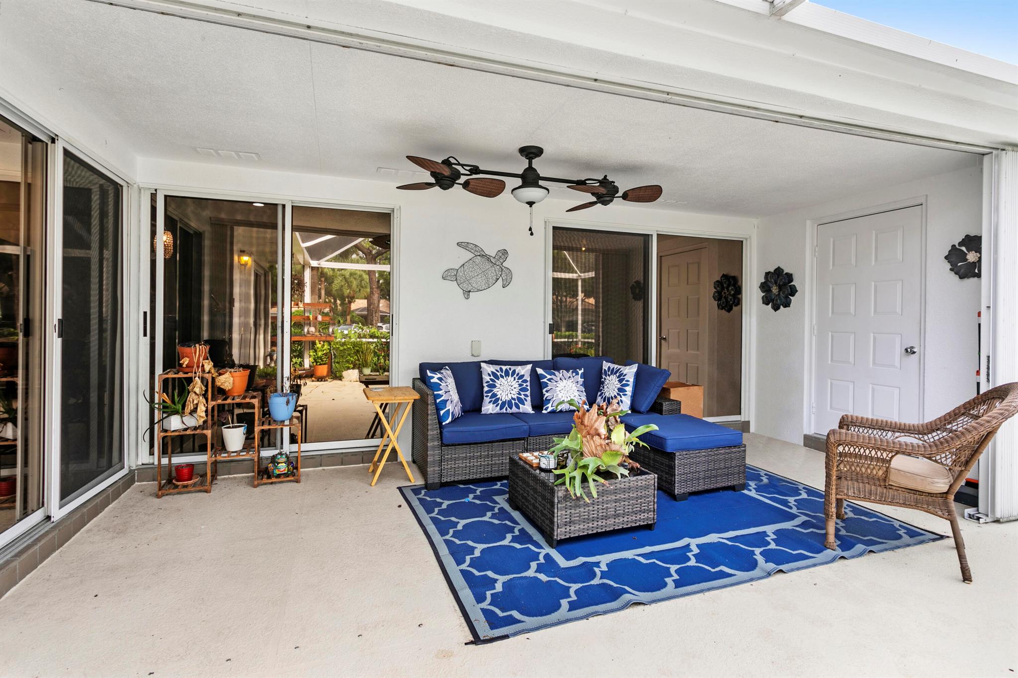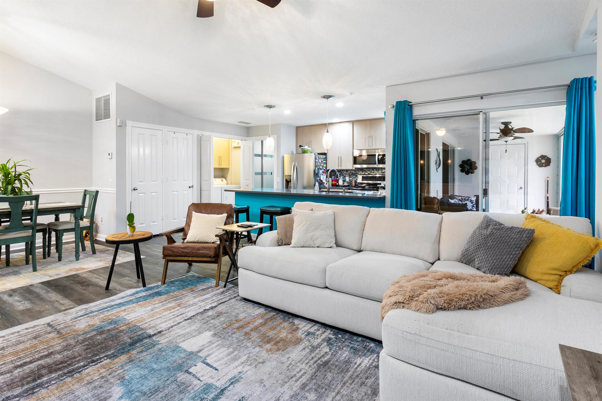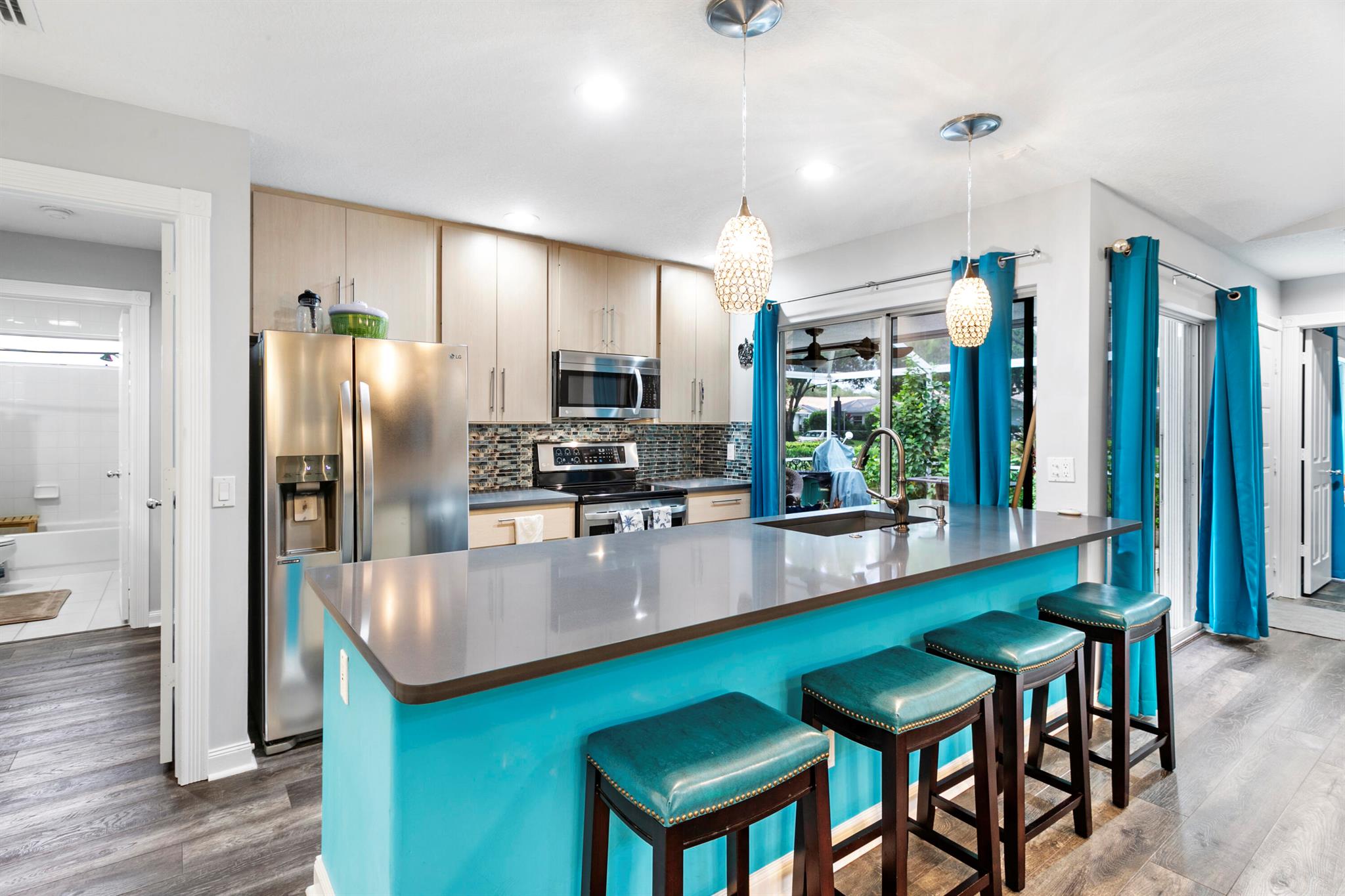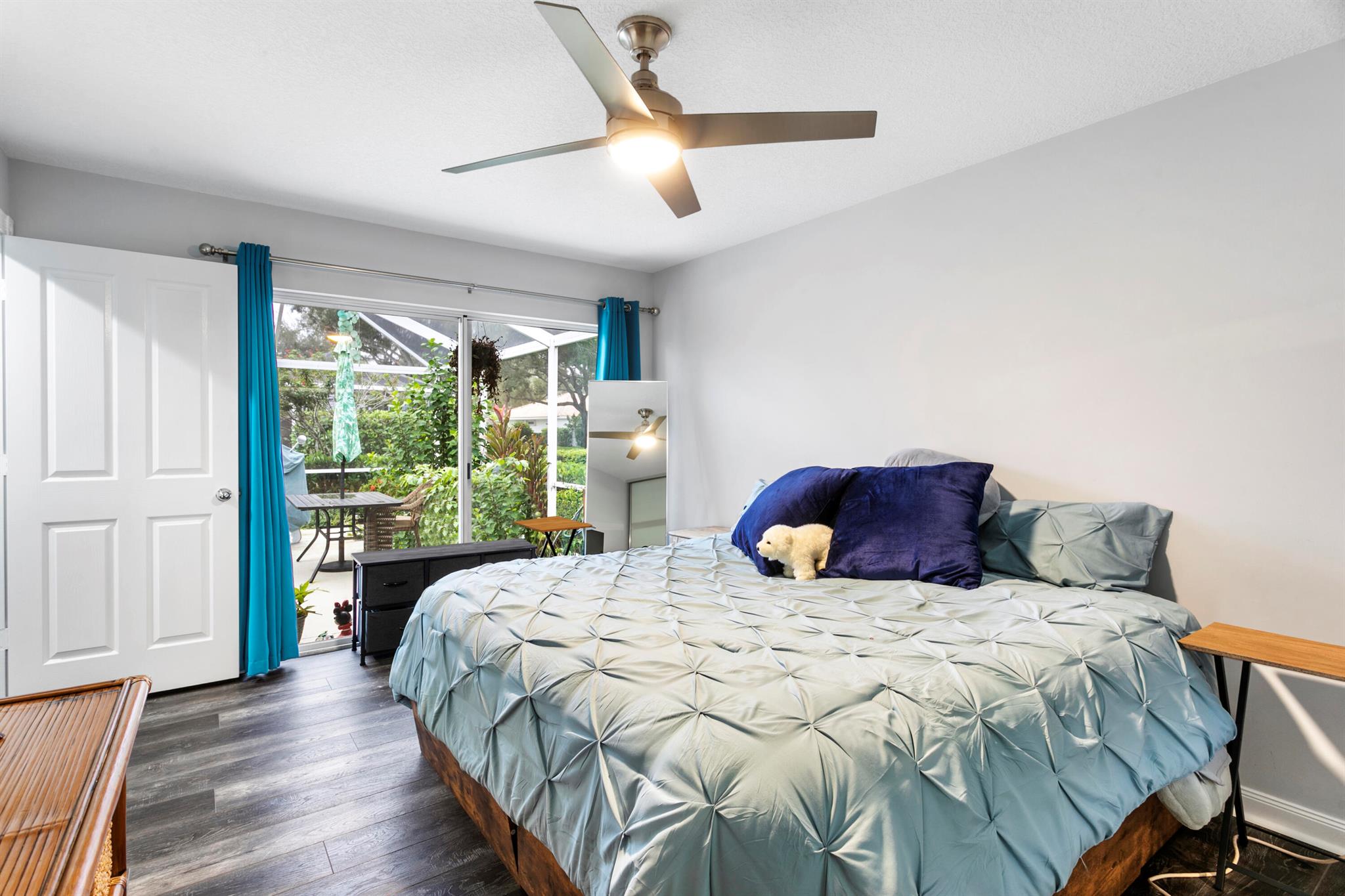 Desirable and updated Divosta built townhome in the heart of Palm Beach Gardens. The home has been updated with luxury wood vinyl plank waterproof flooring throughout the living area, kitchen and bedrooms. Other features in the living area include a full custom wall unit for additional storage, updated lighting, ceiling fan, and a vaulted ceiling. The kitchen has been upgraded with stainless steel appliances, quartz countertops, large under mount stainless steel sink, and a cheery coastal backsplash. The bathrooms have been updated with quartz countertops, above the counter sinks with waterfall faucets, and penny tile in the master bath walk in shower. A washer and dryer are conveniently located within the unit. Seller replaced poly piping in 2024!