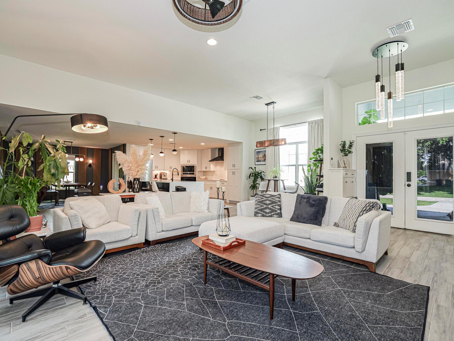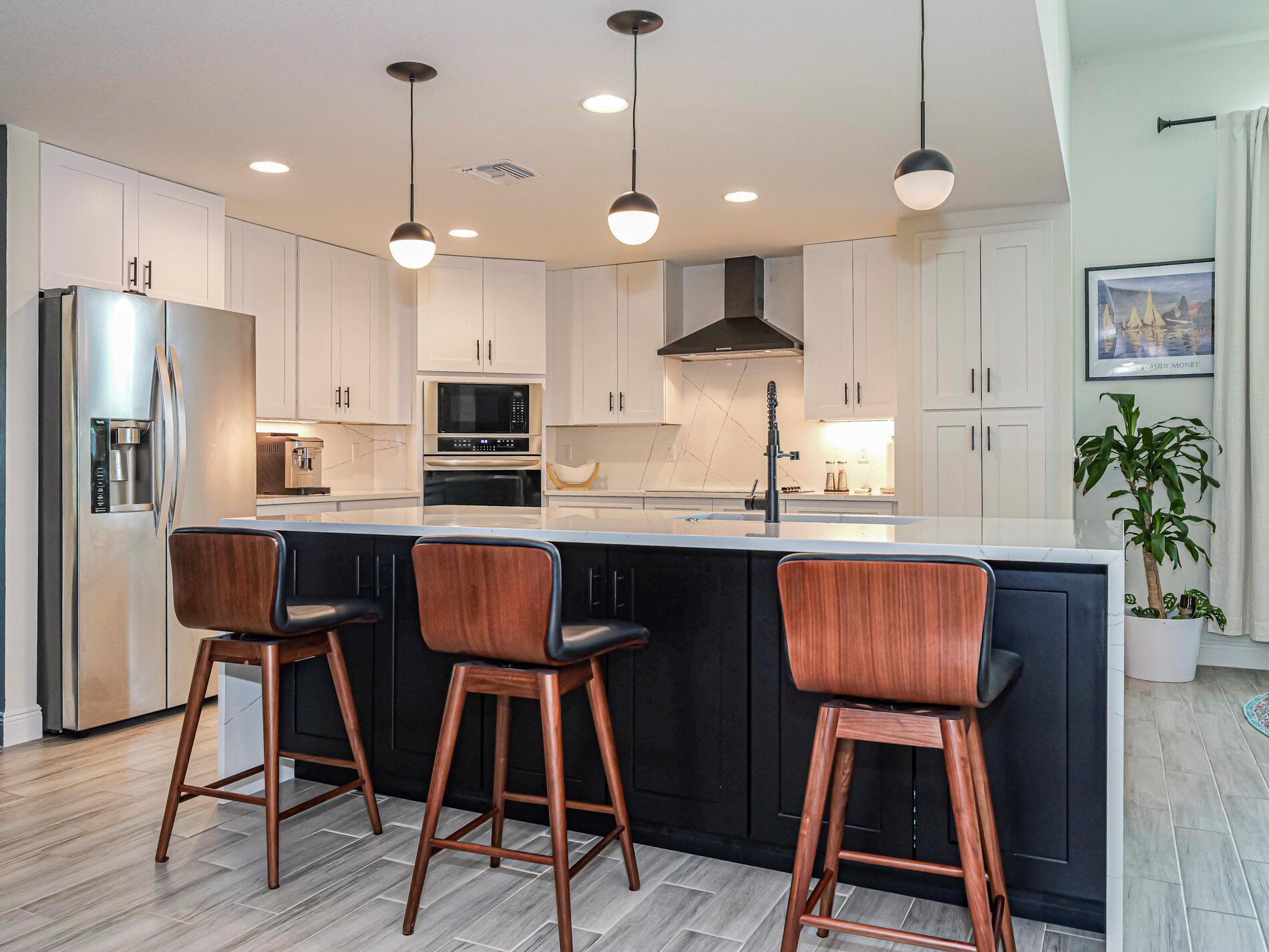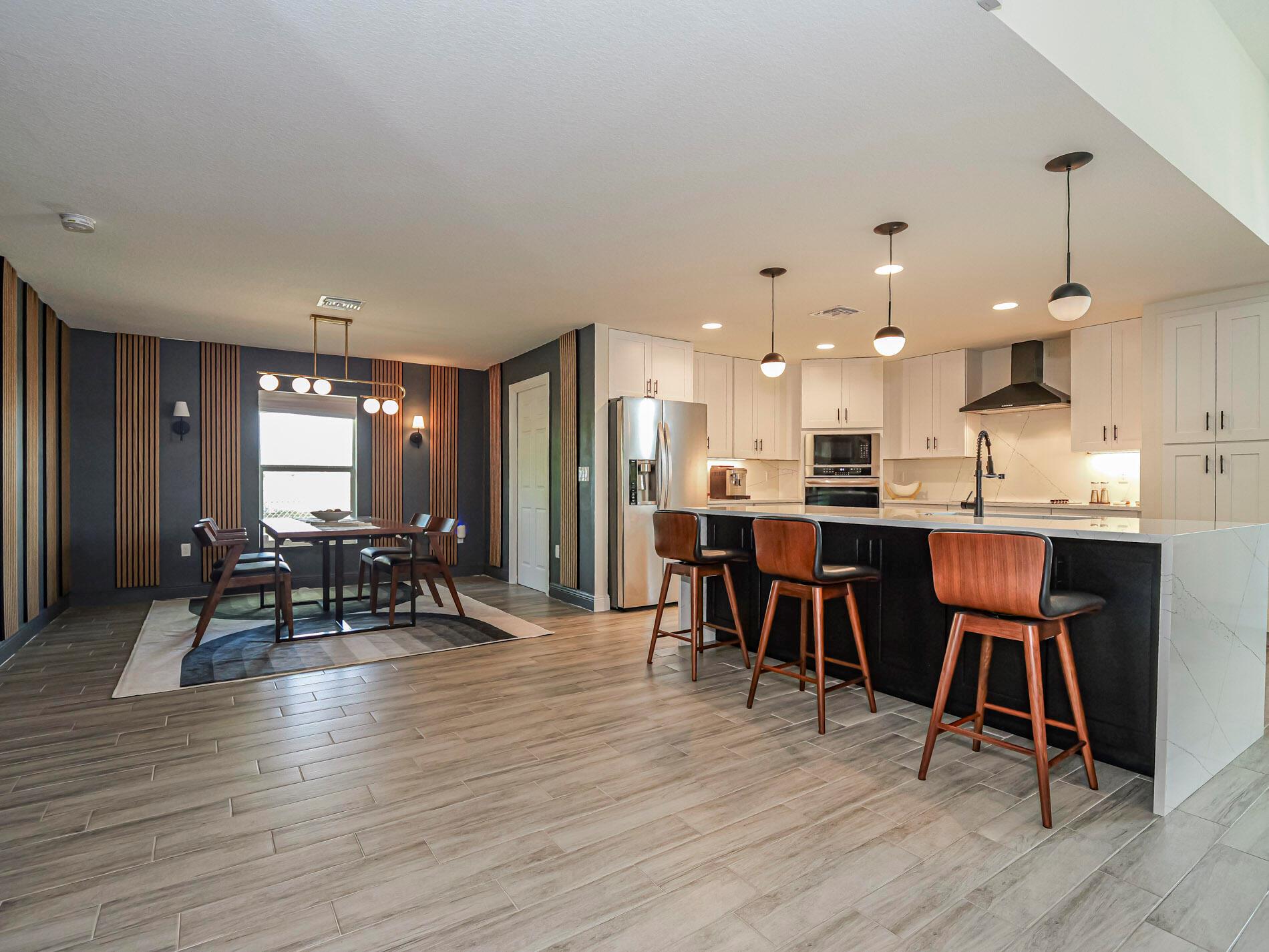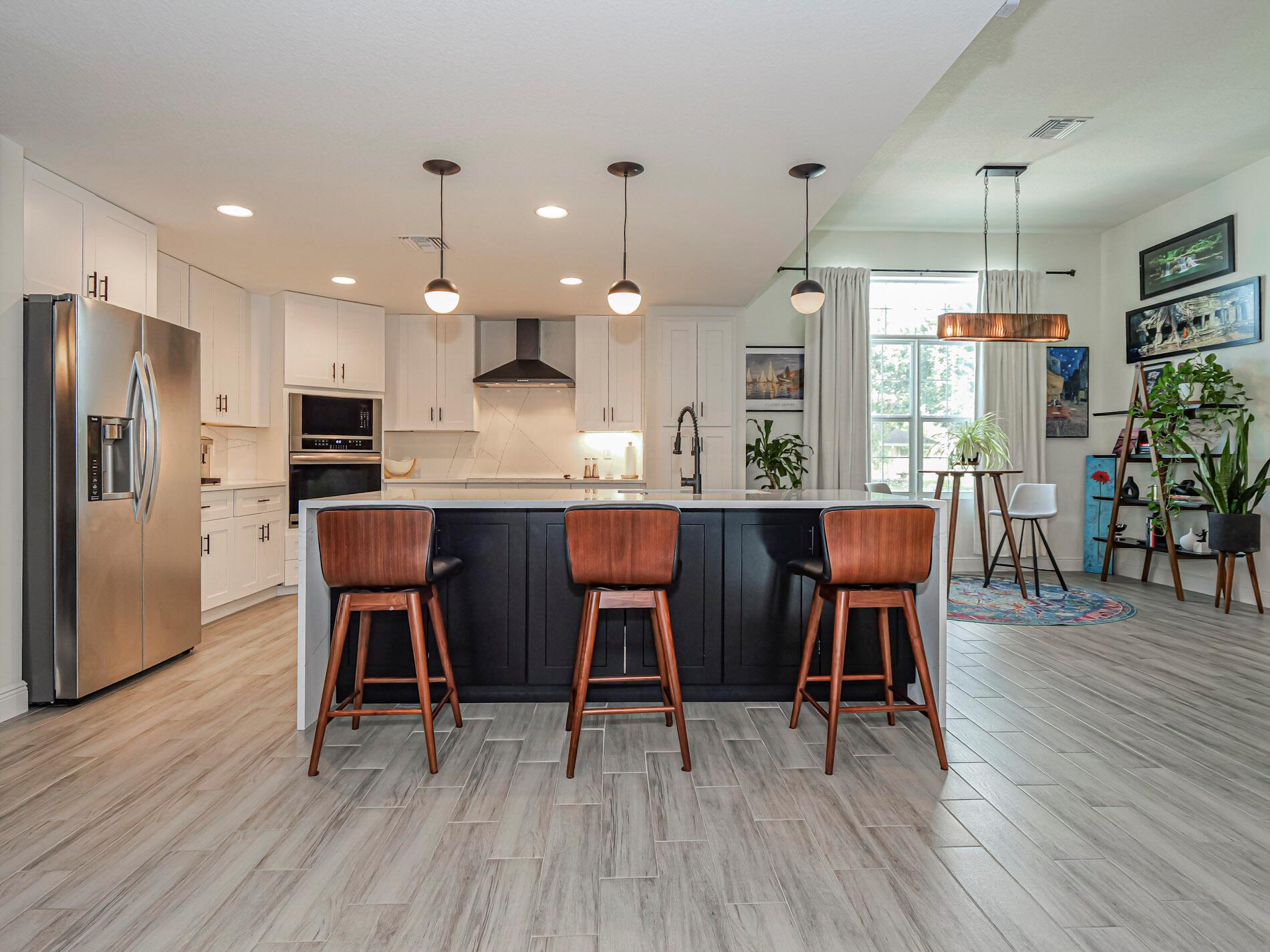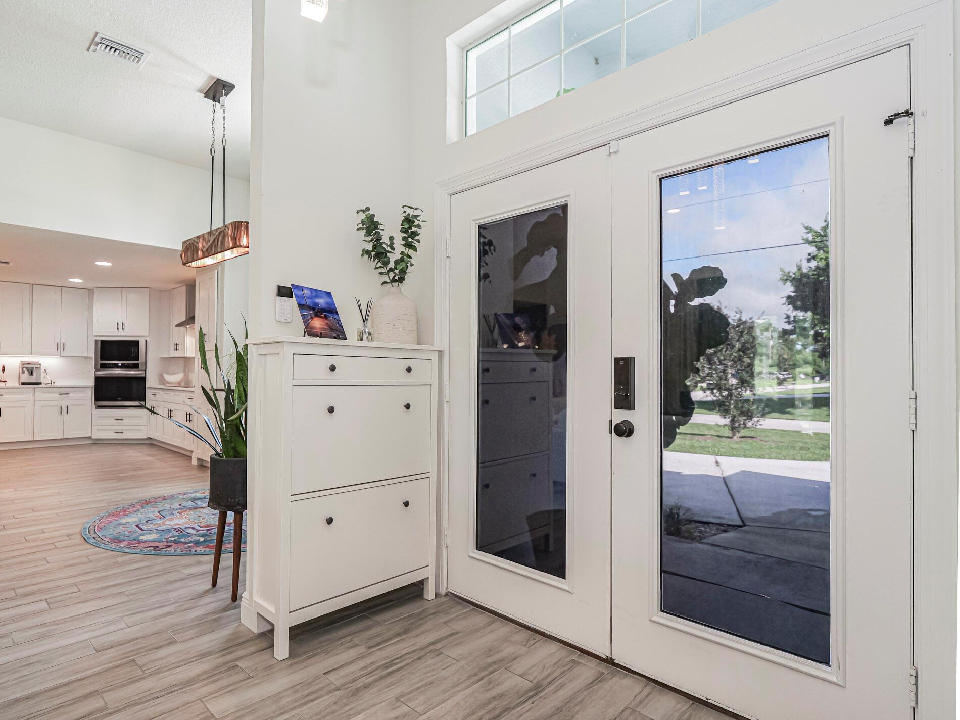 Like new, move-in ready, stunning WATERFRONT home is like an advertisement for HOME & DESIGN! This 3BR/2BA CBS home features a metal roof, impact windows & doors & modern plank wood tile throughout. Enjoy a gorgeous recently renovated chef's kitchen with waterfall quartz countertops, wall oven & microwave plus ample workspace- perfect for entertaining. The open floor plan flows beautifully, offering bright, spacious living areas featuring gorgeous modern light fixtures & accent walls. The split bedroom layout includes guest rooms w walk in closets & beautifully updated bathroom. The owner's suite features a tray ceiling & huge updated en suite w soaking tub. Relax outside on the covered patio w tranquil water & preserve views for ultimate privacy.