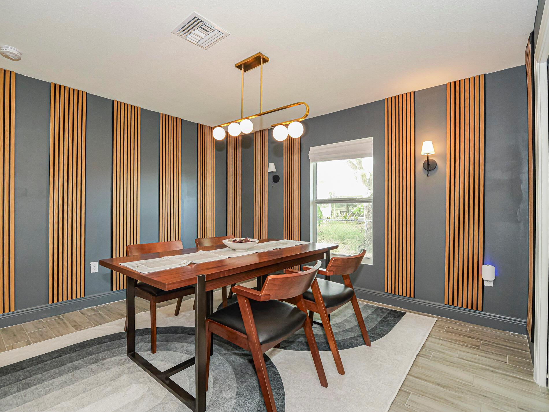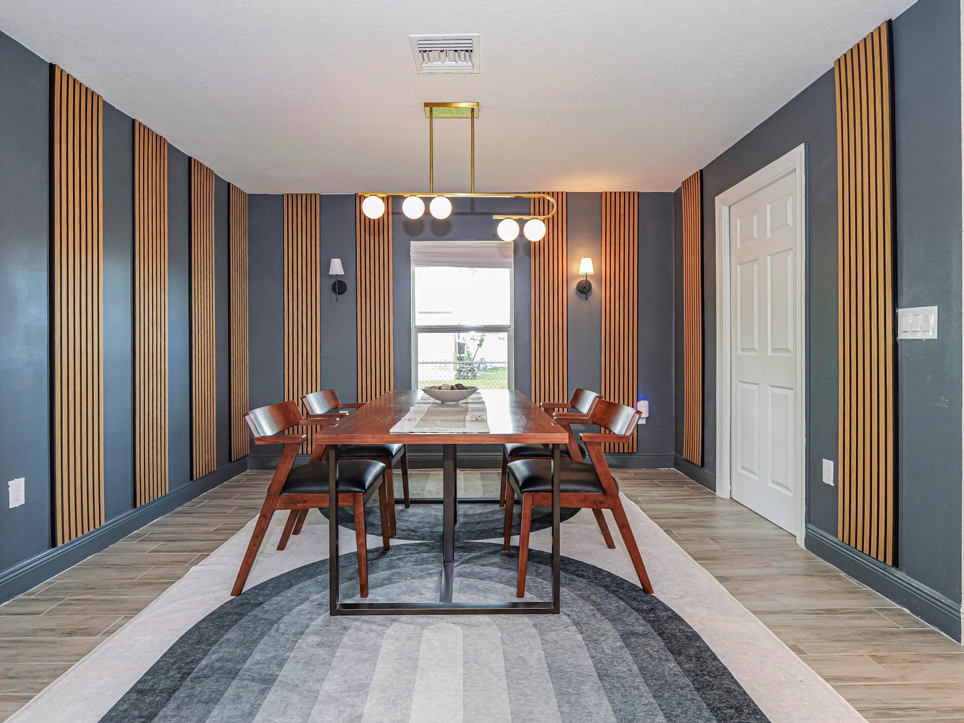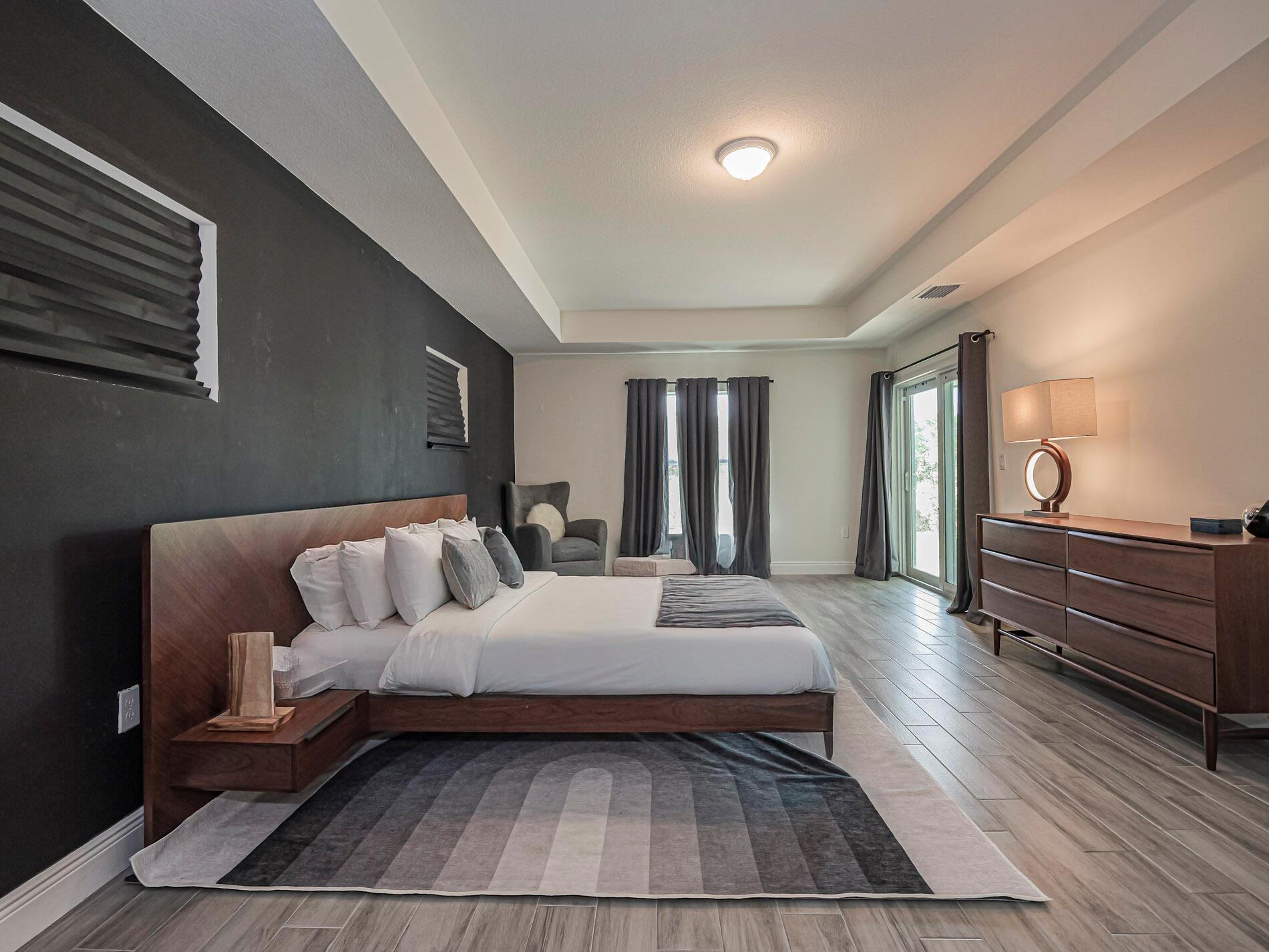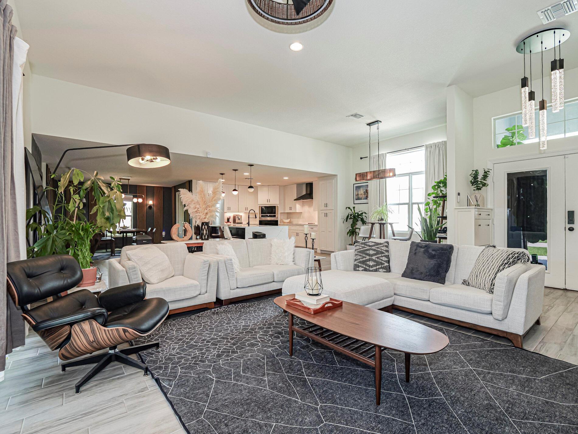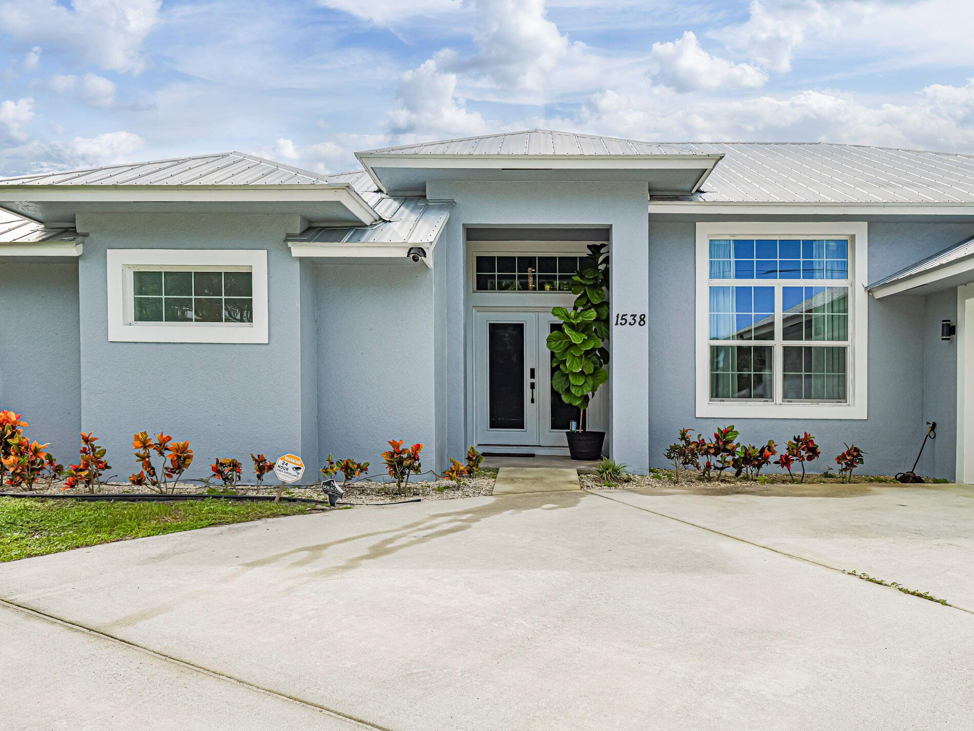 Like new, move-in ready, stunning WATERFRONT home is like an advertisement for HOME & DESIGN! This 3BR/2BA CBS home features a metal roof, impact windows & doors & modern plank wood tile throughout. Enjoy a gorgeous recently renovated chef's kitchen with waterfall quartz countertops, wall oven & microwave plus ample workspace- perfect for entertaining. The open floor plan flows beautifully, offering bright, spacious living areas featuring gorgeous modern light fixtures & accent walls. The split bedroom layout includes guest rooms w walk in closets & beautifully updated bathroom. The owner's suite features a tray ceiling & huge updated en suite w soaking tub. Relax outside on the covered patio w tranquil water & preserve views for ultimate privacy.