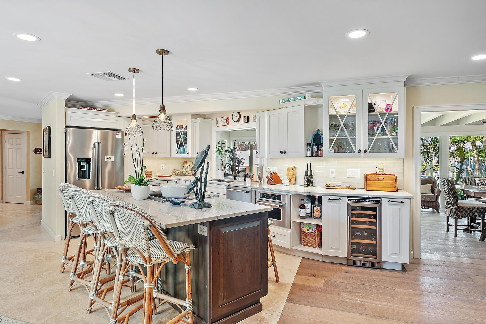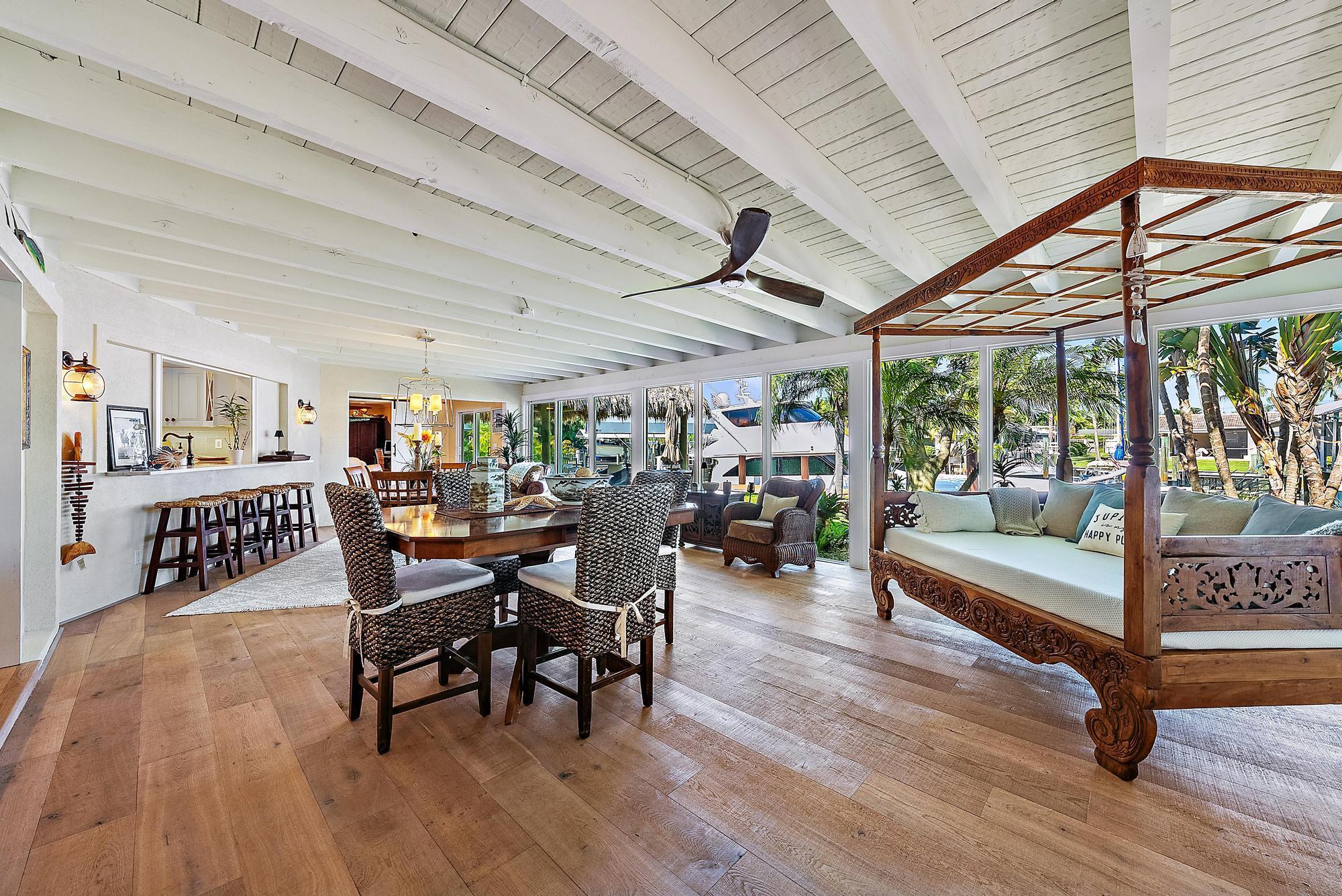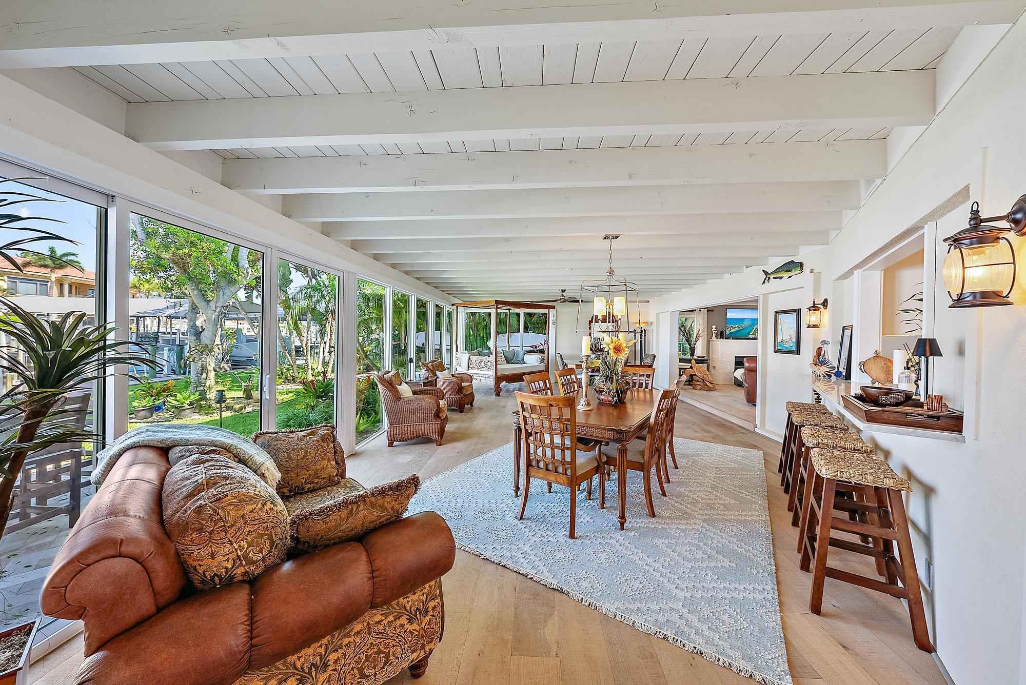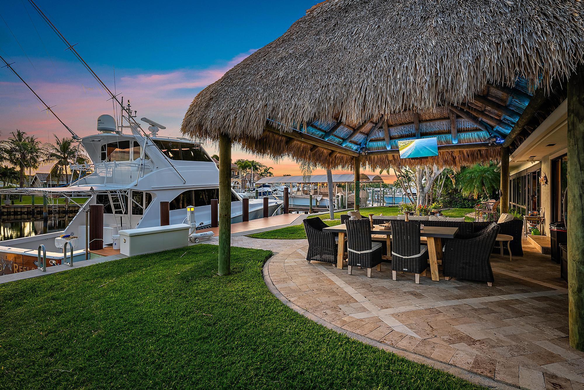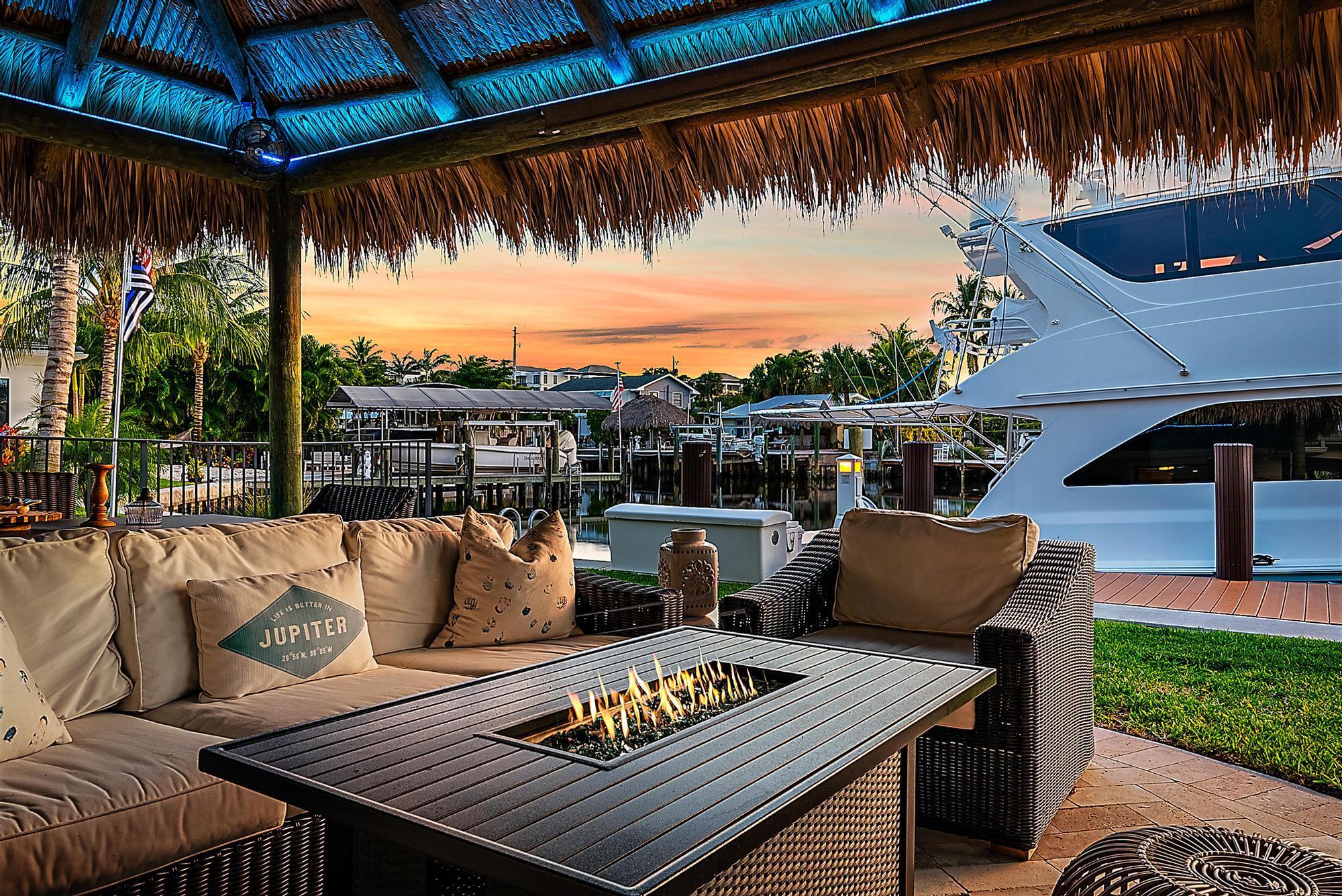 A boater's paradise - over 100 feet of deep-water frontage with no fixed bridges and direct ocean access. Dock currently configured for a 61' Viking plus two 30' sport boats on lifts. Located in Paradise Point, an unincorporated area of Palm Beach Gardens with lower taxes and no HOA. This Bermuda-style home on a one-third acre lot has been thoughtfully updated with a new kitchen, newer roof, and impact windows throughout. The open, light-filled floorplan includes two bedrooms, two baths, and a flex room currently used as a third bedroom. Outdoors, enjoy spectacular sunset views and a new tiki hut - perfect for entertaining and relaxed Florida living.