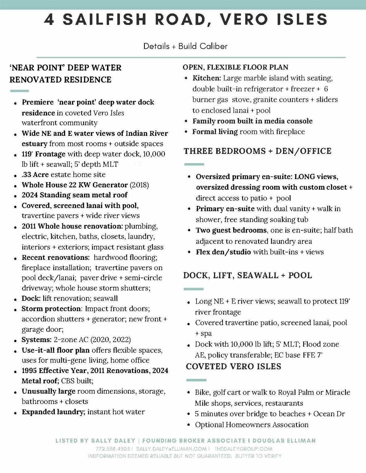 Vero's best move-in ready river buy under $2M! Deep water 'near point' lot w/dock, lift, seawall w/WIDE views + 2024 standing seam metal roof! 119' frontage! Modern seaside indoor/outdoor living! 2011 Reno: electric/plumbing, partial impact w/accordions + generator! Wood floors, travertine pool deck, paver drive. Flex plan: 3B+ den w/enormous island kitchen w/gas range; Walls of glass, LR w/FP. The ICW is your most prominent neighbor!X flood zone! Ideal Vero Isles locale: bike/golf cart to Royal Palm eateries, Miracle Mile across st! 5 mins to island, Ocean Dr!An absolute gem! Possible 2nd fl!