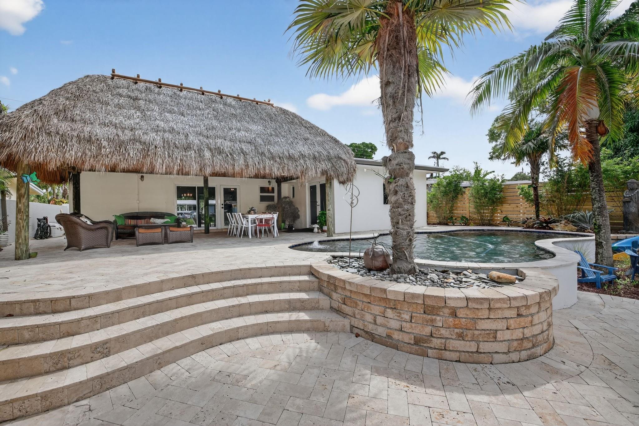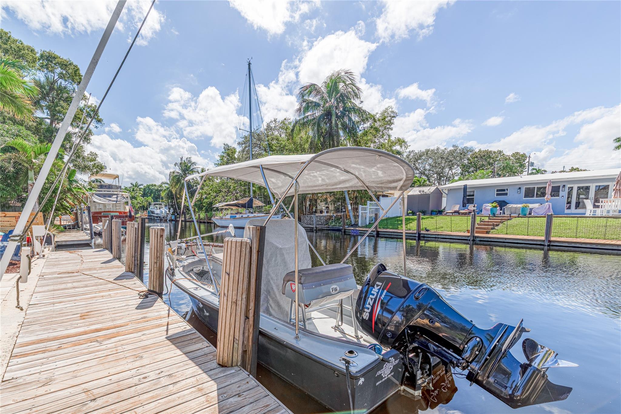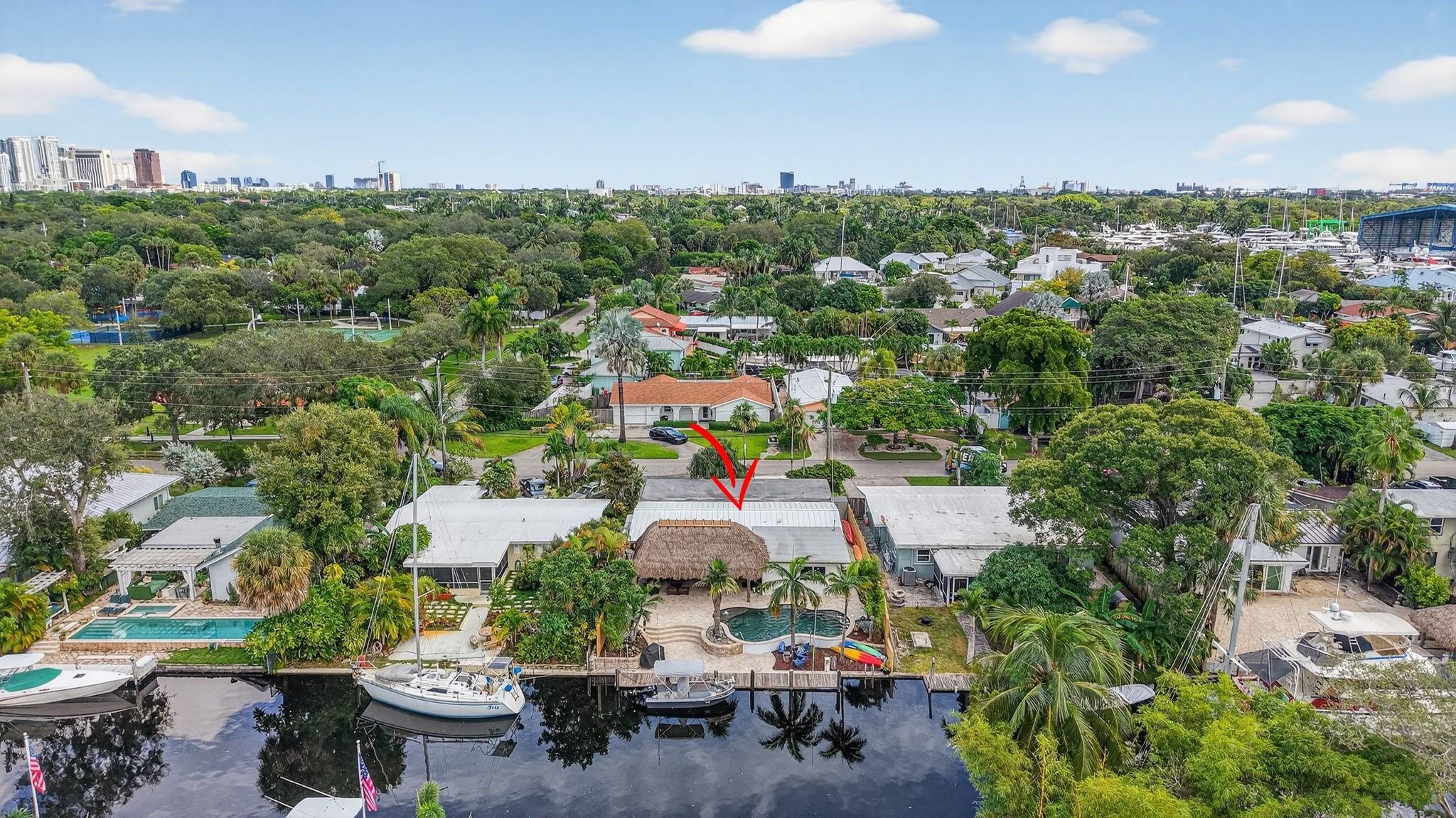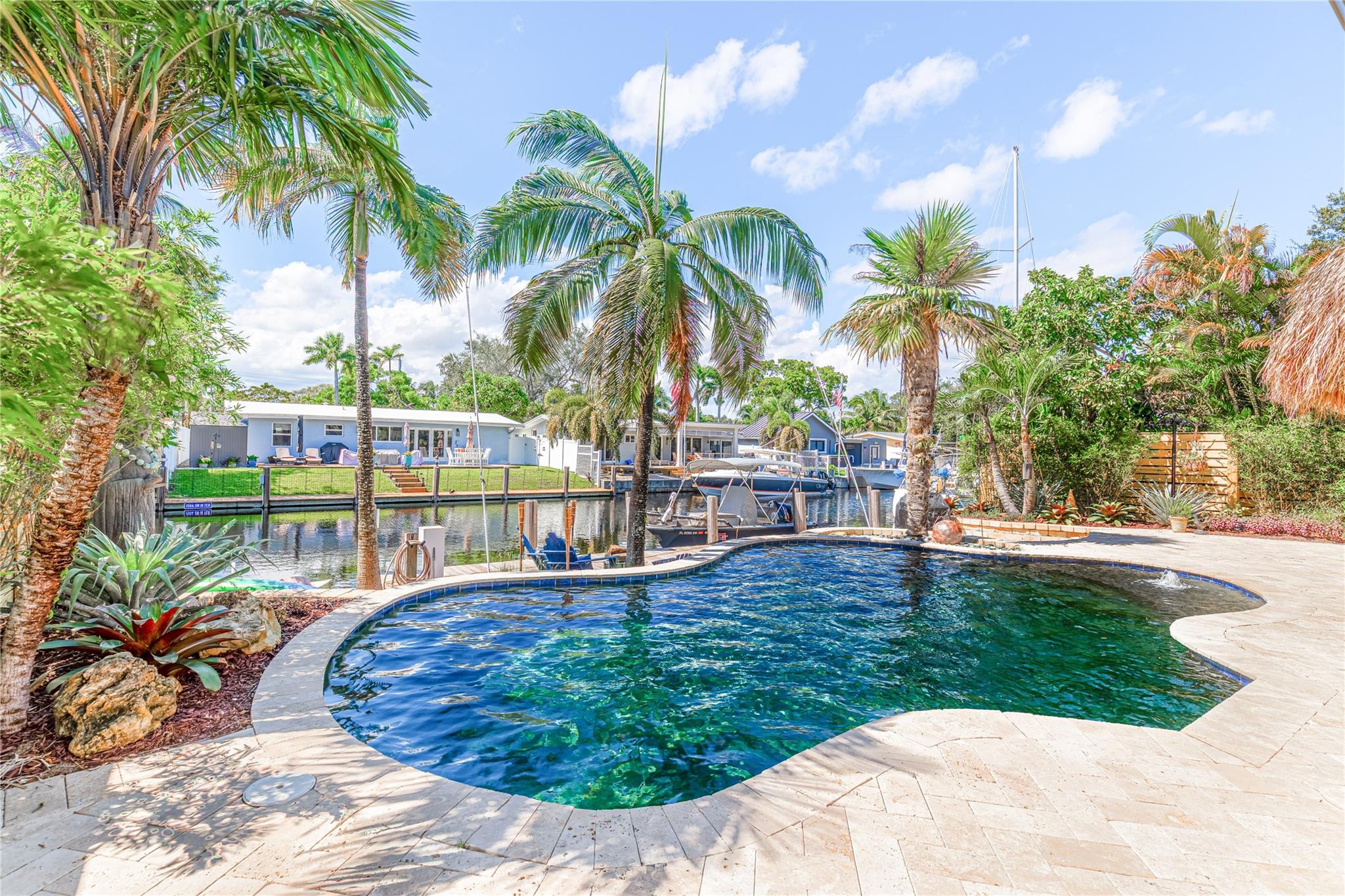 Relax by the sparkling pool, unwind under the large tiki hut, entertain on the waterfront travertine patio-True South Florida living at its best. Inside enjoy a bright, open layout w/ vaulted ceilings & a Chef’s Kitchen w/ a Custom Island. 3 bedrooms & 2 new designer baths, Guest bath w/ zero entry wet-room. Primary bath finished in limestone w/ a new soaking tub. Recent 240 sq ft addition expands the back bedroom & captures wide water views —Outside- horticulturist-designed, tropical landscaping provides beauty, privacy & zero-scape yard Located in highly desirable Shady Banks, walk to 2 neighborhood parks. Minutes to downtown, Las Olas, beaches, waterfront dining & the airport, Turnkey, move-in ready, this deepwater pool home delivers a rare combination of lifestyle, location,& luxury.
