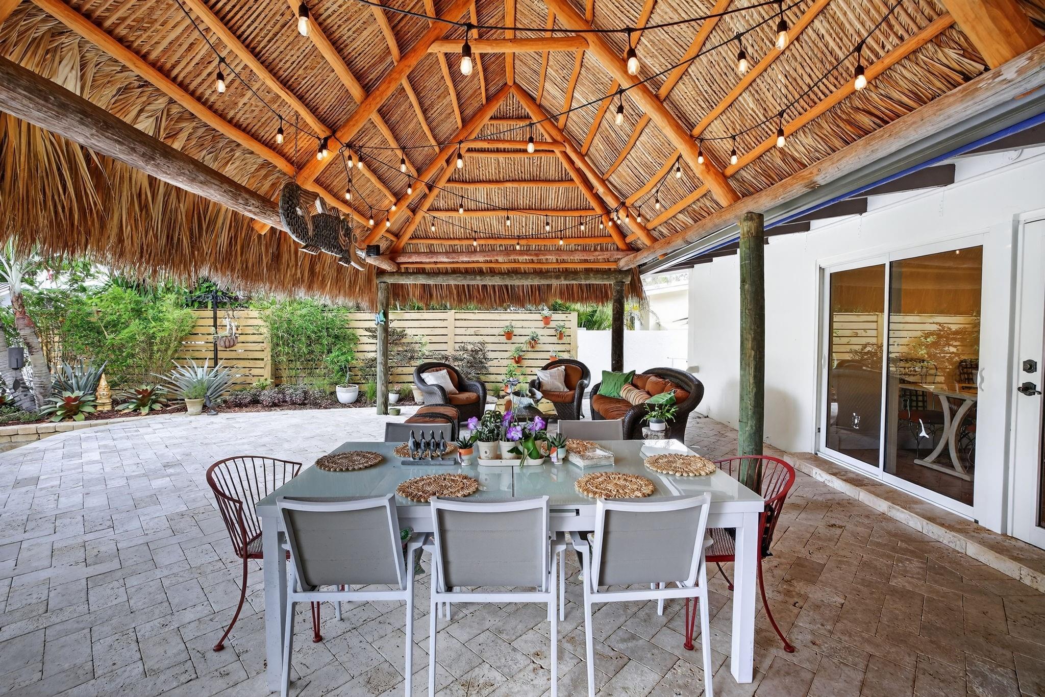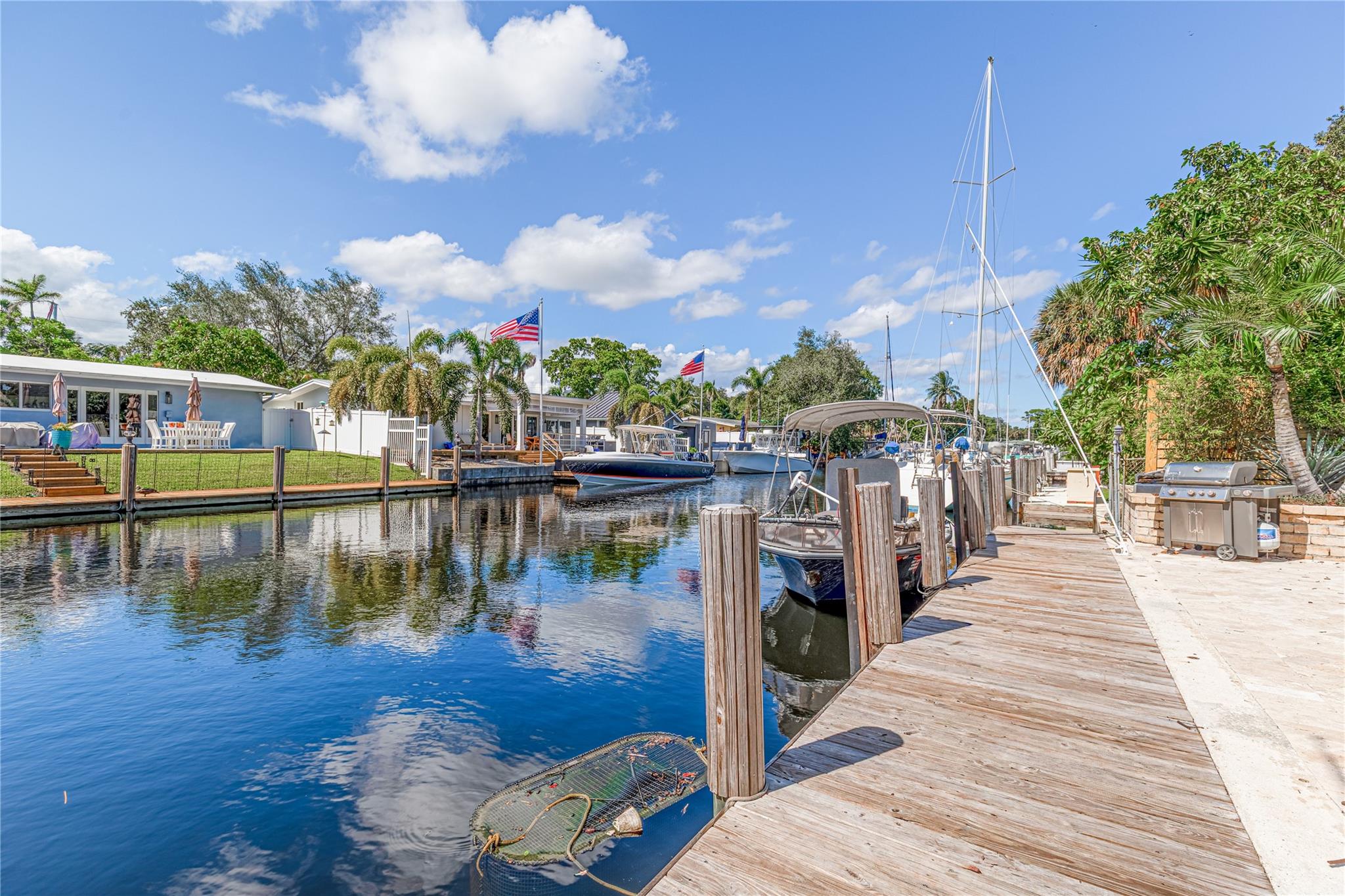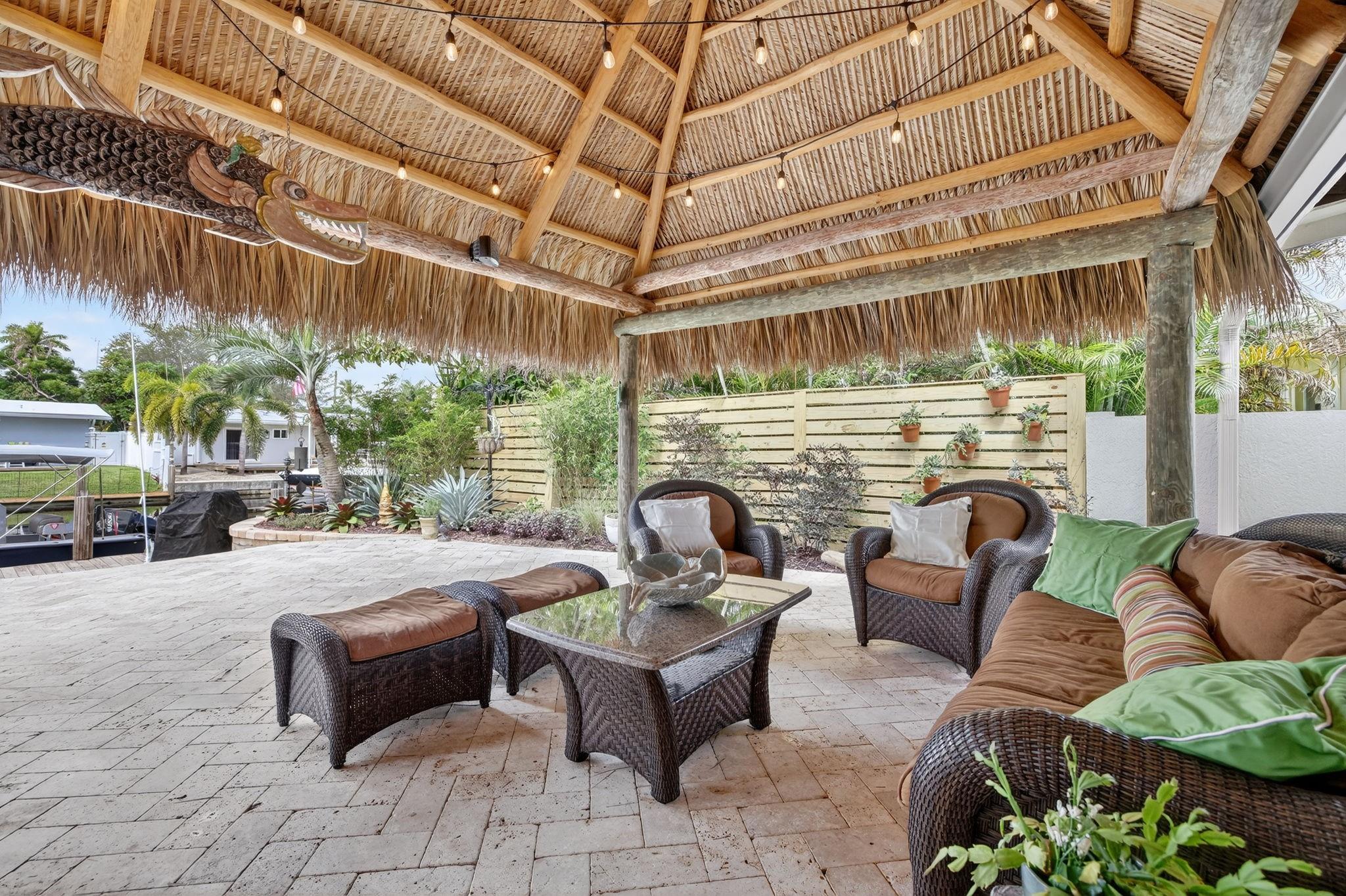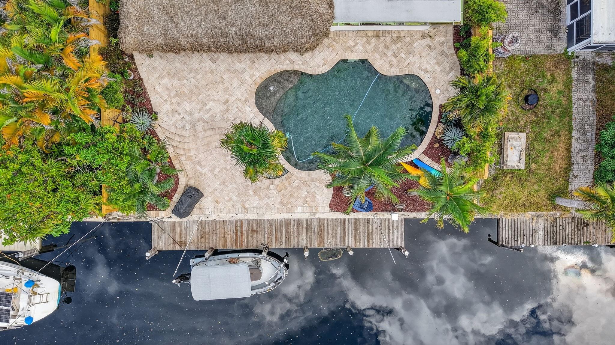 Relax by the sparkling pool, unwind under the large tiki hut, entertain on the waterfront travertine patio-True South Florida living at its best. Inside enjoy a bright, open layout w/ vaulted ceilings & a Chef’s Kitchen w/ a Custom Island. 3 bedrooms & 2 new designer baths, Guest bath w/ zero entry wet-room. Primary bath finished in limestone w/ a new soaking tub. Recent 240 sq ft addition expands the back bedroom & captures wide water views —Outside- horticulturist-designed, tropical landscaping provides beauty, privacy & zero-scape yard Located in highly desirable Shady Banks, walk to 2 neighborhood parks. Minutes to downtown, Las Olas, beaches, waterfront dining & the airport, Turnkey, move-in ready, this deepwater pool home delivers a rare combination of lifestyle, location,& luxury.