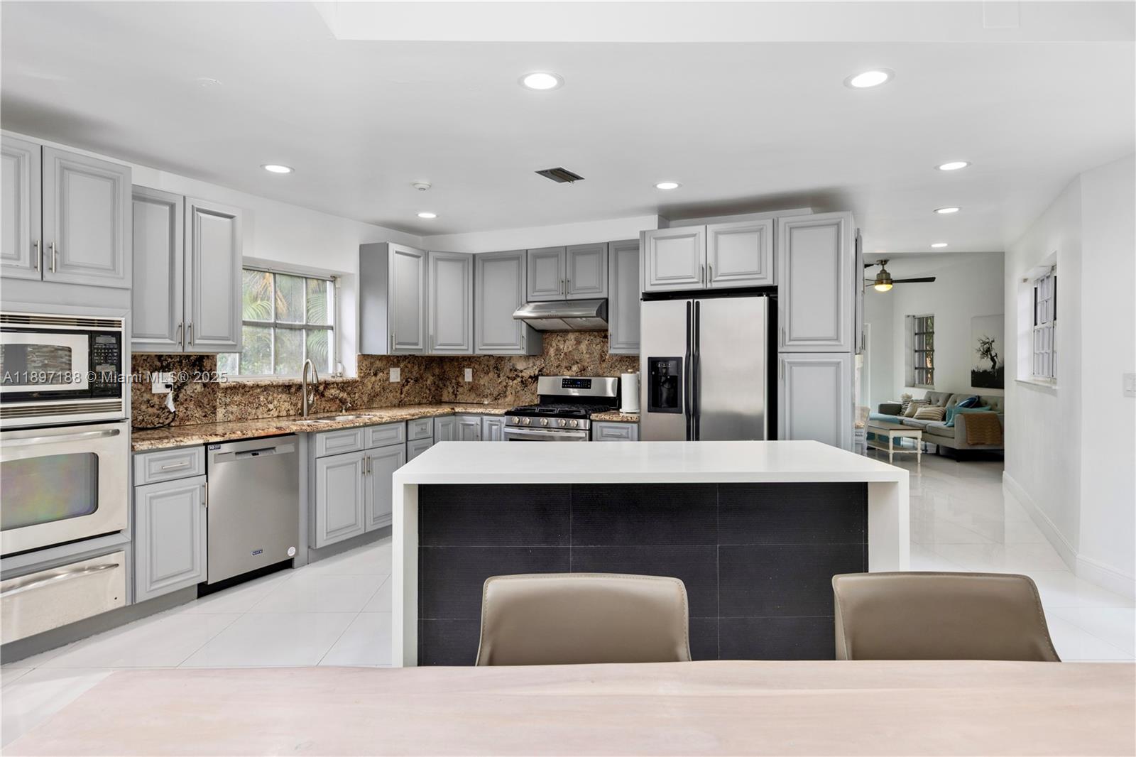 Welcome to this stunning two-story, corner home showcasing soaring vaulted ceilings and a seamless flow between the living room, dining area, gourmet kitchen, and family room. Featuring one bedroom and one bathroom downstairs, along with a heated pool with a salt system, an outside shower, an outdoor fireplace, and a car garage, this home offers both luxury and practicality. Upstairs, the home features three spacious bedrooms, including an updated master suite! This elegant Spanish home filled with natural light is situated in the highly sought-after City of Coral Gables. Just half a block from the Granada Country Club and Golf Course, this enviable location offers unparalleled convenience, with the Biltmore Hotel, Salvadore Park, and the Venetian Pool just minutes away.