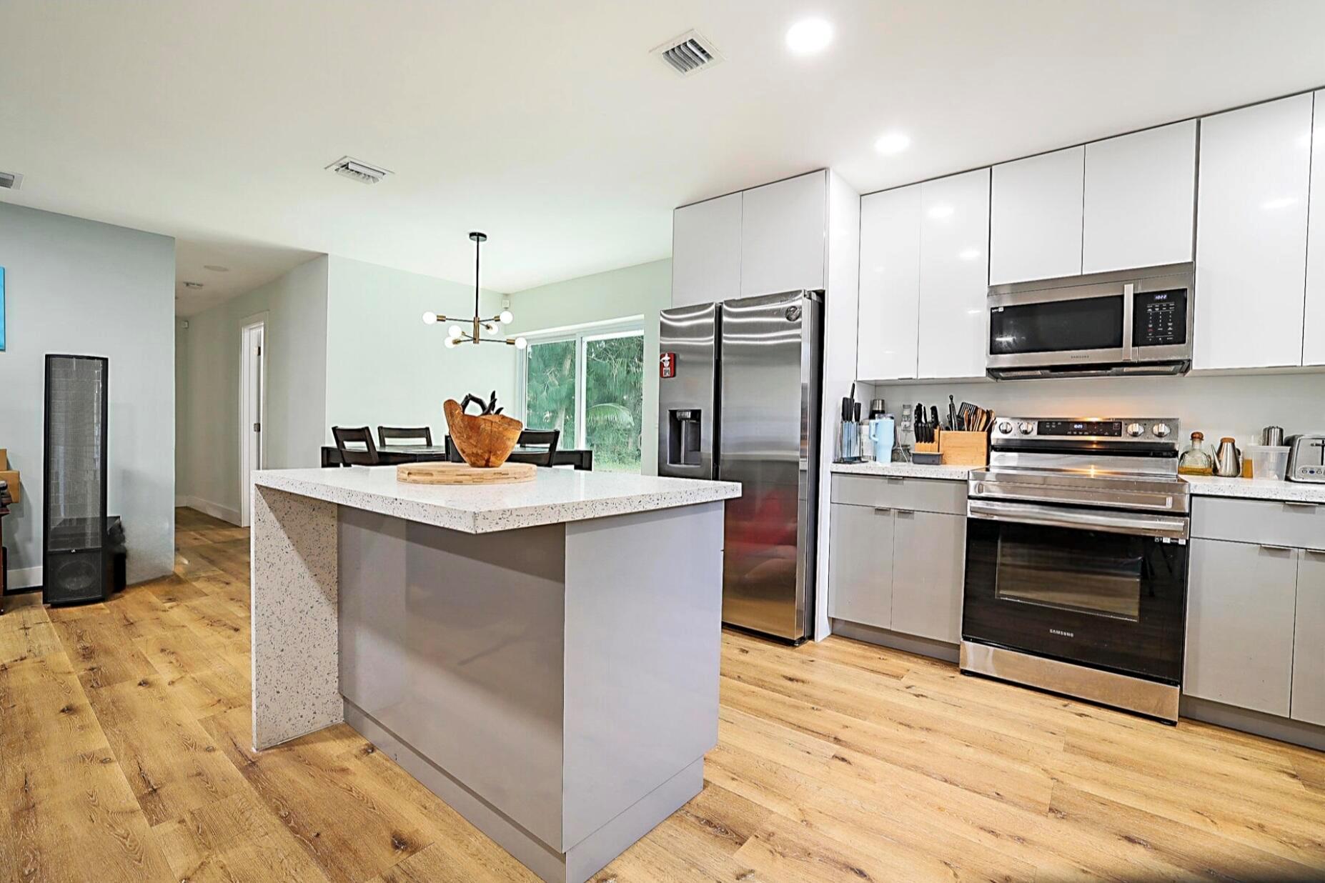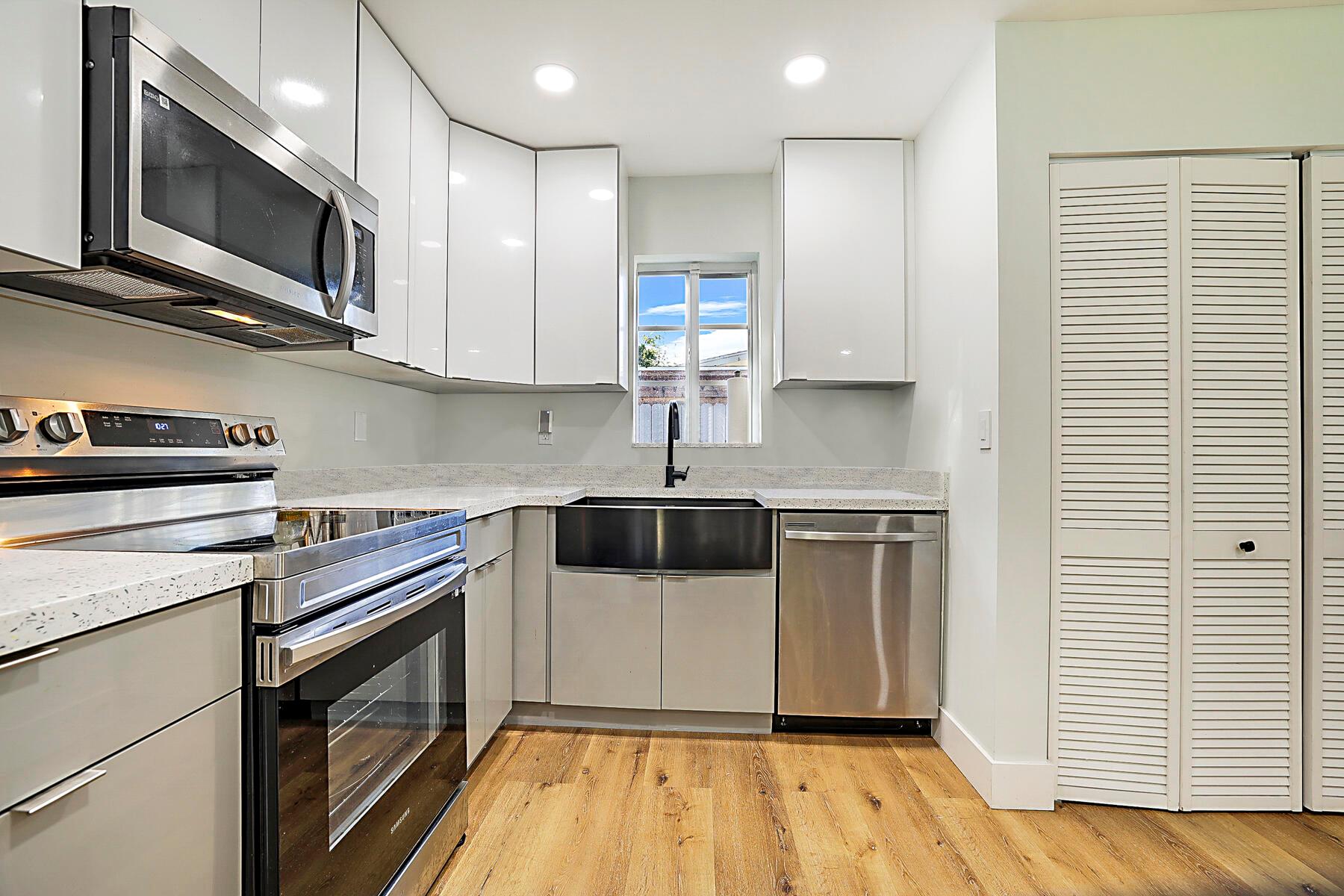 Beautifully remodeled 3-bed, 2-bath home offering the perfect blend of modern design & everyday comfort! Step inside to an open-concept floor plan filled with natural light, highlighting the sleek finishes throughout. The contemporary kitchen features quartz countertops, top-of-the-line stainless-steel Samsung appliances, a touchless faucet, and an oversized modern farm sink -- ideal for cooking & entertaining.Both bathrooms are tastefully updated with water-efficient fixtures and elegant porcelain tile. The home is energy-efficient, equipped with LED lighting, a tankless water heater & a brand-new Samsung washer and dryer set.