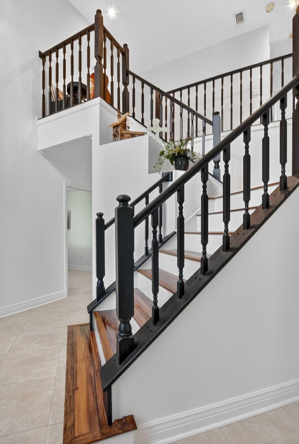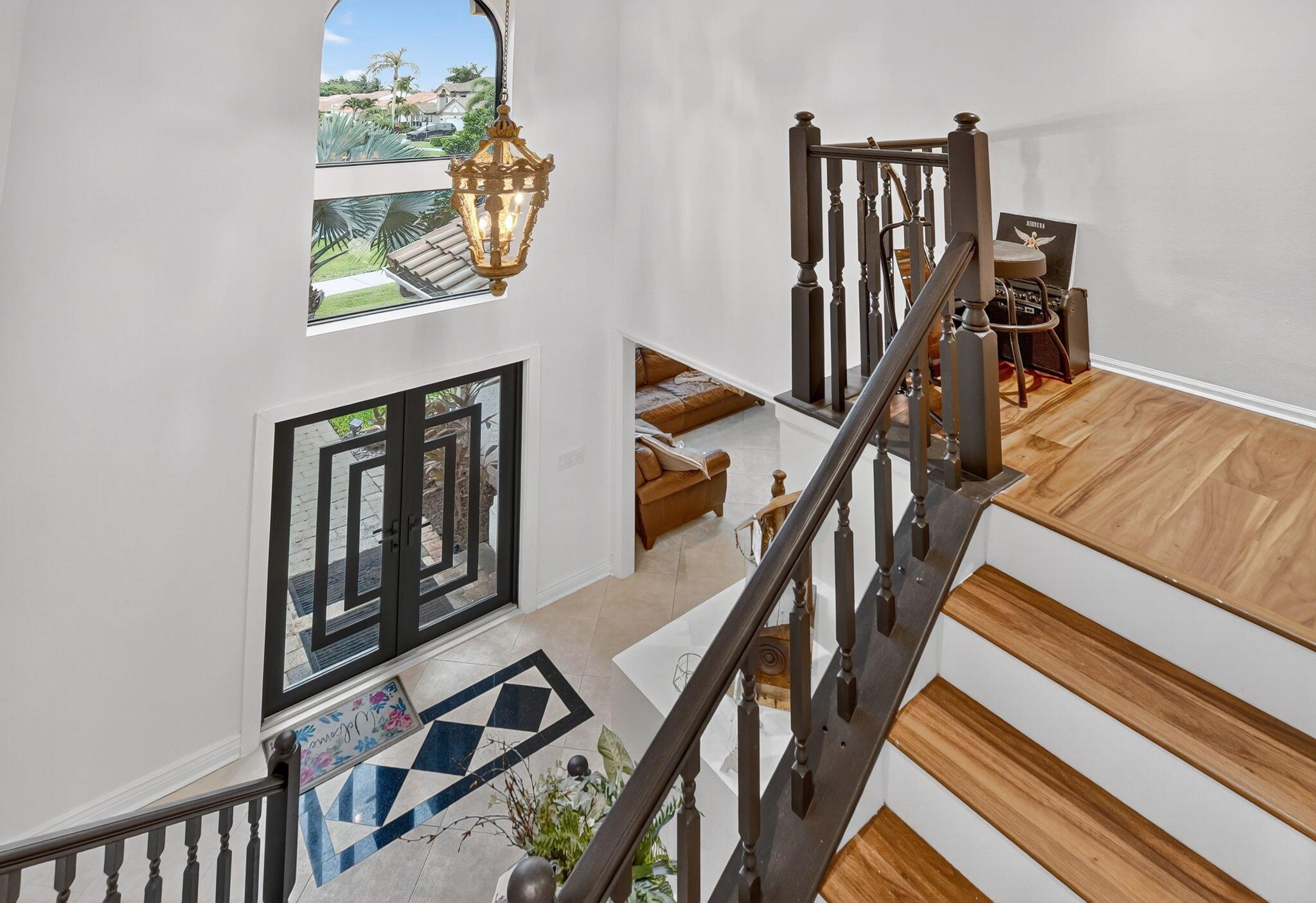Beautiful waterfront home on a quiet cul-de-sac with a rare, spacious 2-story layout that must be seen in person to fully appreciate. Primary bedroom on the first floor, plus a den, media room, full dining room, and large great room all on the main level with seamless outdoor access. The huge gourmet chef's kitchen is perfect for cooking and entertaining. Upper level offers 3 additional bedrooms. Features include: full impact windows/doors, a heated pool, wide lake views and tropical landscaping on a private corner lot with large yard. Energy-efficient, well maintained, no HOA wait time, and quick closing available.