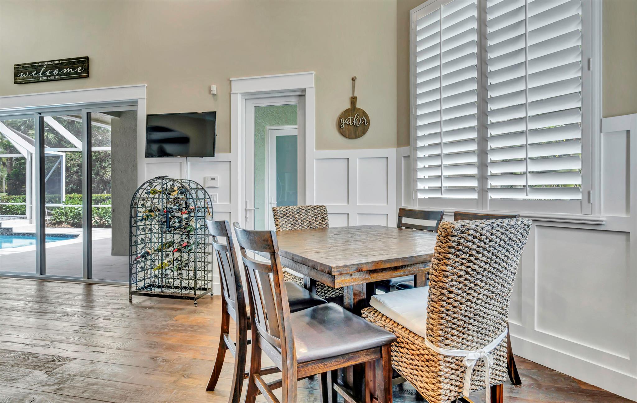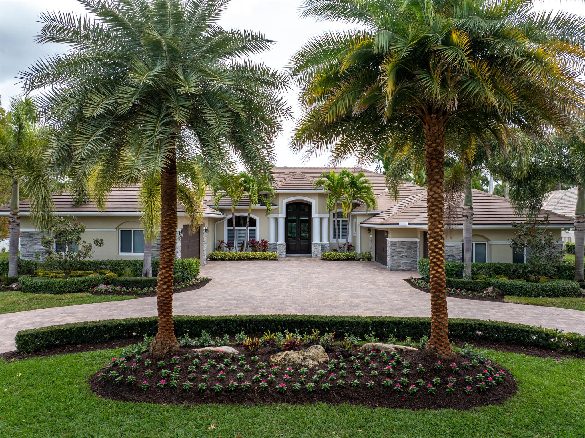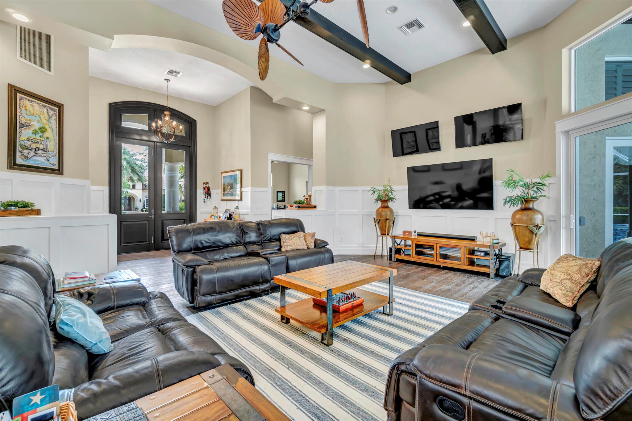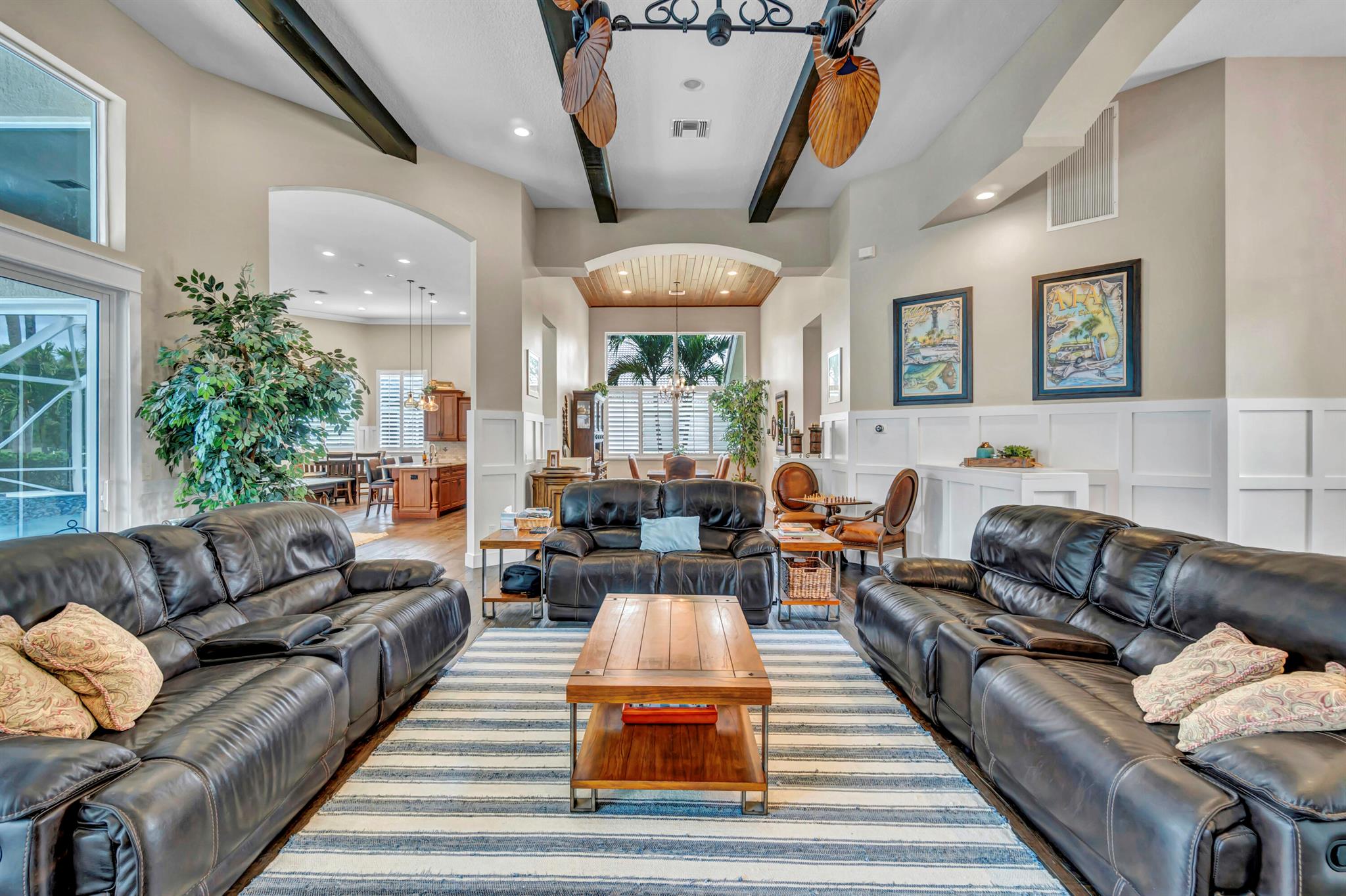 Over 5600 sq ft of perfection with a 5 car garage!! Newly renovated (2025) home offers 4 bedrooms, 5 bathrooms, PLUS office, GUEST HOUSE (Mother in Law suite) with kitchenette and mini split AC! Beautiful custom wood floors in living areas plus tongue and groove wood ceilings in several areas as well as wood beams in the living room. The entire home is protected by hurricane rated impact glass windows and doors, updated and refreshed marble patio/pool with screen enclosure, updated bathrooms, custom closets, gutters, garage space for 5 cars with circular paver drive, batten board throughout living areas, extra fridge in the laundry room and backs to the 4th green of Mayacoo Lakes CC (optional membership). Enjoy the golf course view while lounging in your heated pool and spa.