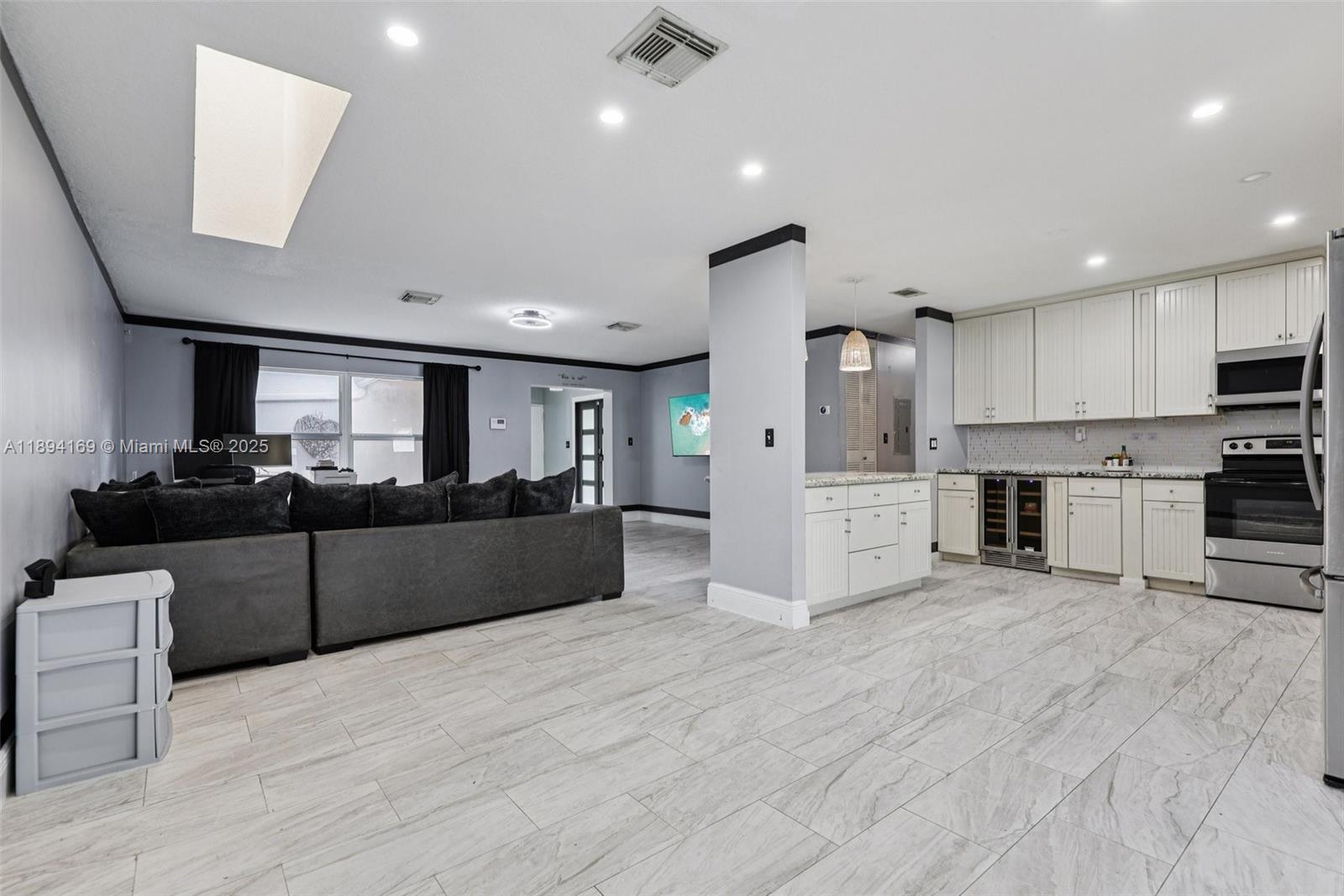 Experience this beautifully updated pool home in Welleby South, featuring a circular driveway and tropical curb appeal. Step into the foyer leading to a bright courtyard and an airy atrium filled with natural light from skylights in the new roof (under 1 year old). The open layout flows to a modern kitchen with custom white shaker cabinets, granite counters, farmhouse sink, smart refrigerator, and wine cooler. Tile floors throughout complement impact windows and doors with plantation shutters. Enjoy lush landscaping, a screened patio, oversized hot tub, and sparkling pool—perfect for relaxing or entertaining. Ideally located near Sawgrass Mills, Markham Park, I-595, I-75, and the Sawgrass Expressway, medical centers and schools.