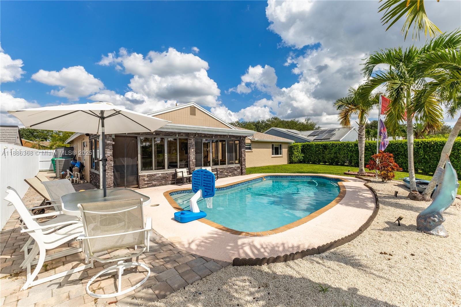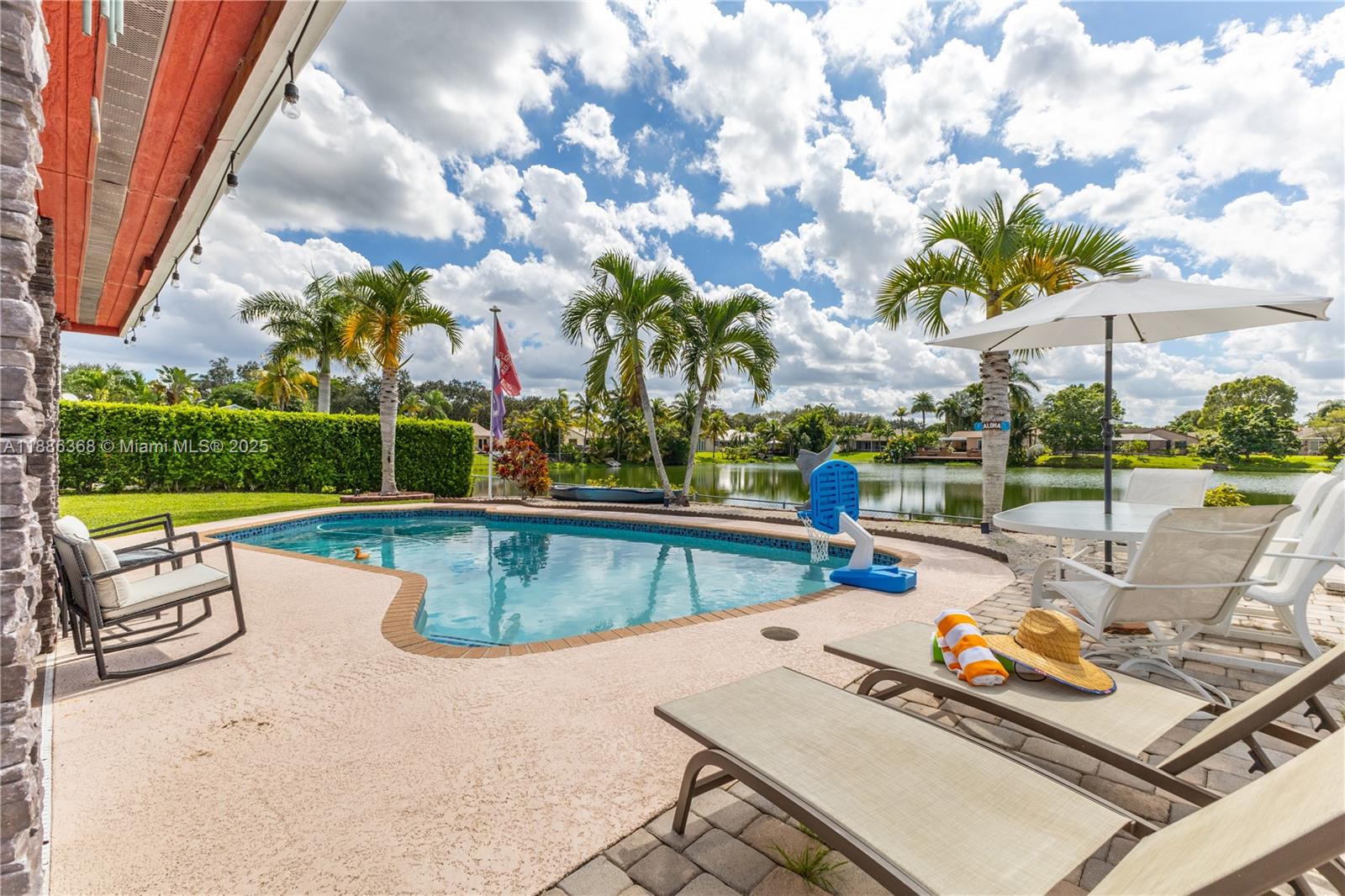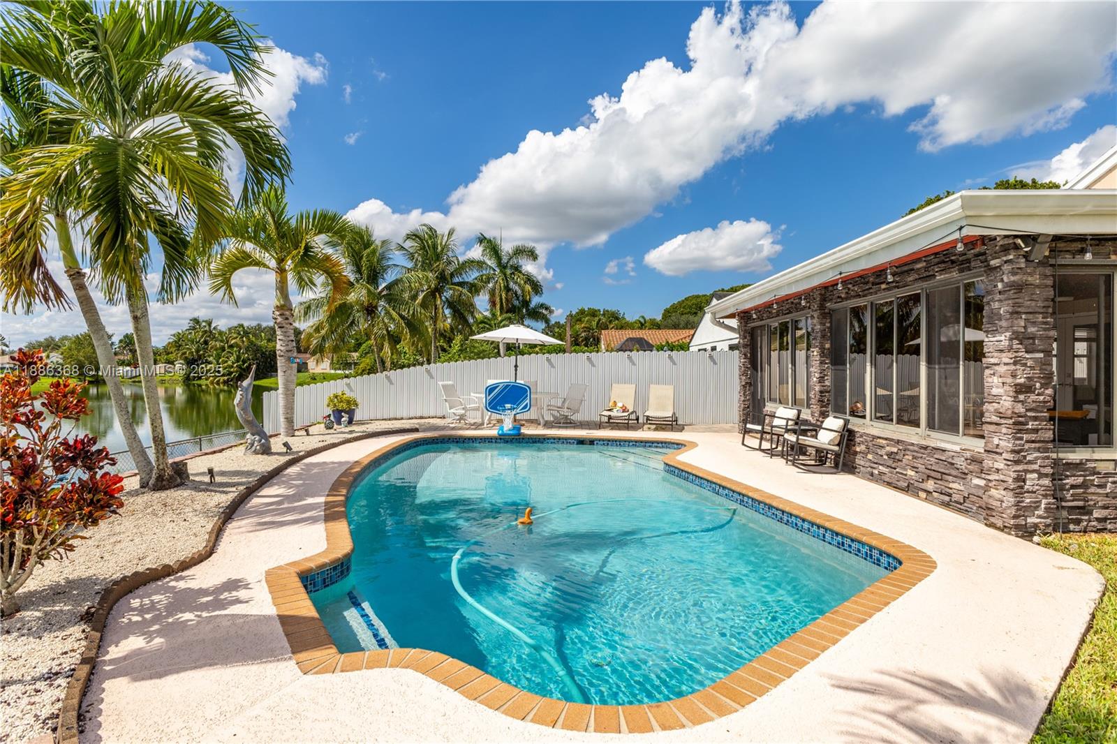 Beautiful home in one of Cooper City’s most desirable neighborhoods! This spacious layout features vaulted ceilings, a formal living room, and a dining area with a breakfast bar overlooking the kitchen. The bright Florida room opens to a pool and large backyard with peaceful lake views—ideal for relaxing or entertaining. Upgrades include a 2023 roof, 2025 pool pump, 2022 water heater, 2019 A/C, partial impact windows, and window shutters. No HOA and walking distance to Griffin Elementary, with top-rated Pioneer Middle and Cooper City High nearby. Close to family-friendly restaurants, parks like Tree Tops and Flamingo Gardens, and the Hard Rock for dining and events.
