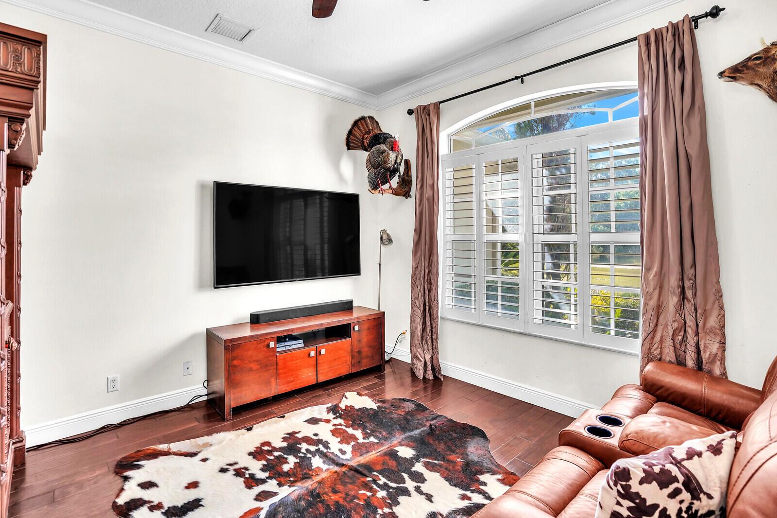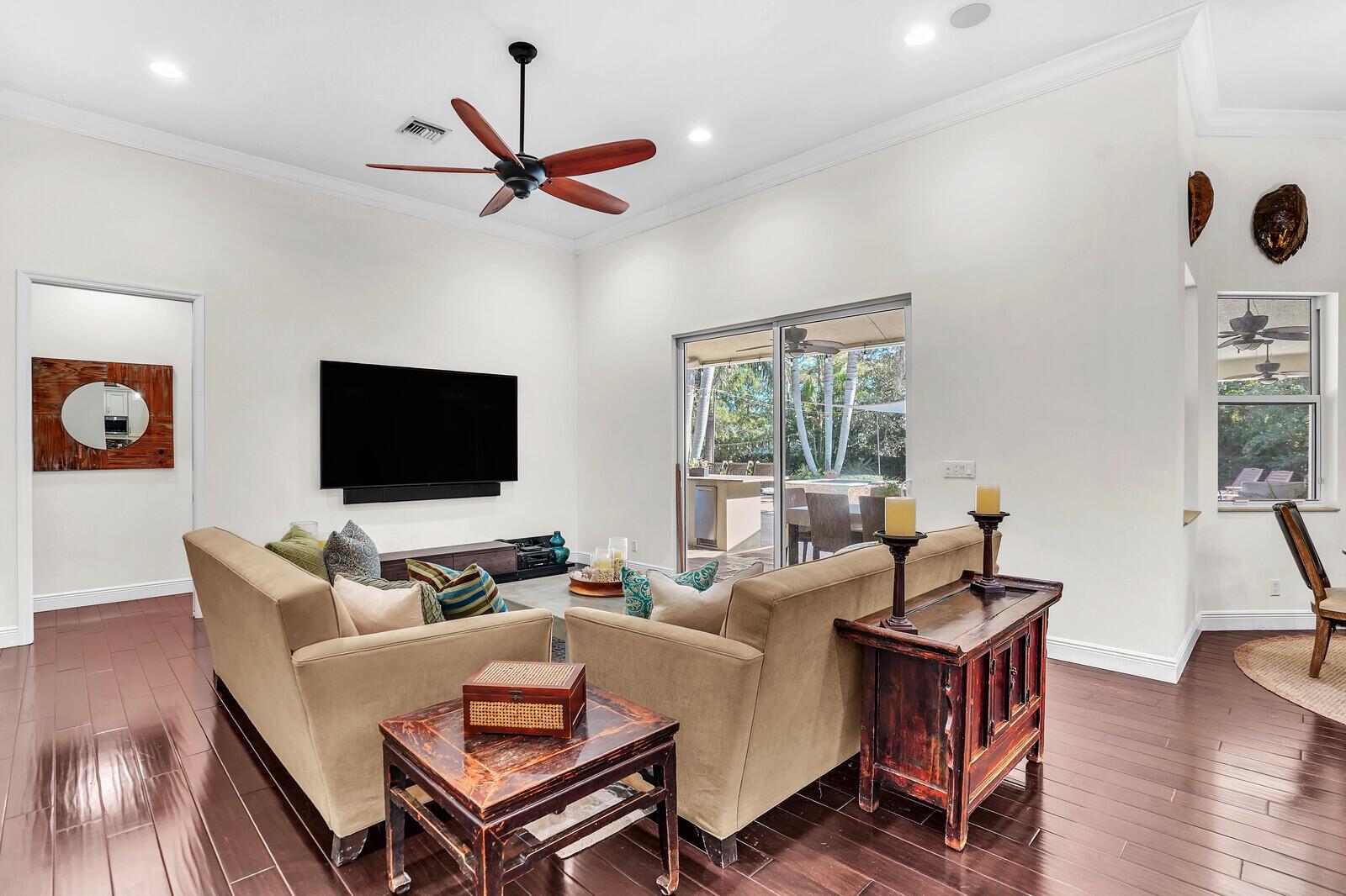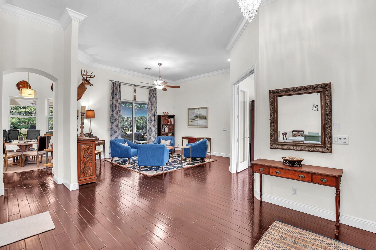 Beautiful family home in Palm Beach Country Estates with 3,132 square feet under air. 4 bedroom, 3 bath plus den. Impact glass throughout except primary bathroom. Main AC 2024. Gorgeous park like backyard with salt water pool, fire pit and plenty of space for a boat, RV or swing set. 3 car garage with parking for 8 extra cars. City water. Enjoy the serene life just minutes away from 95. All room sizes are approximate.