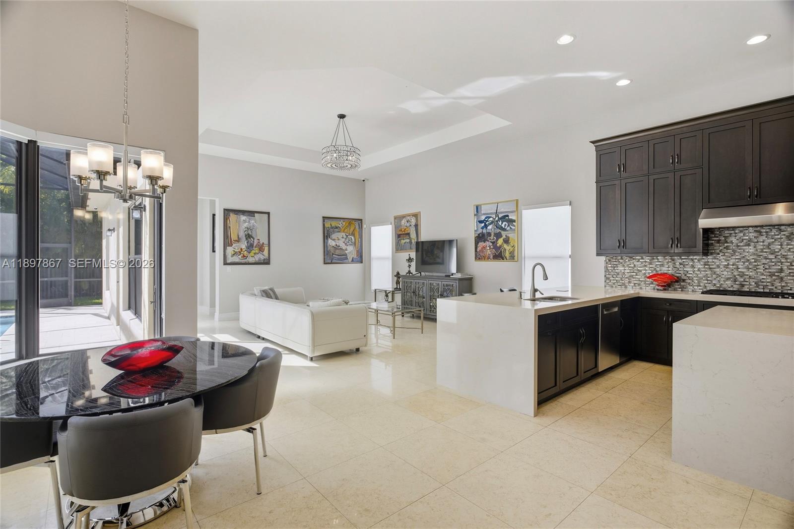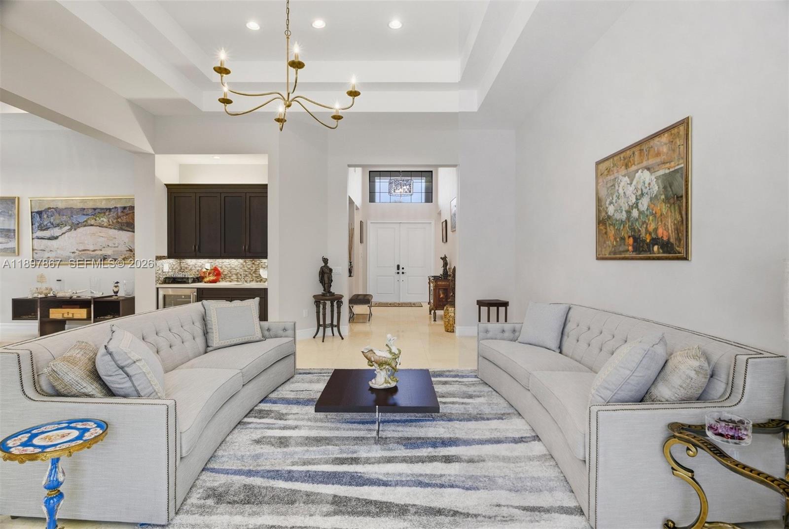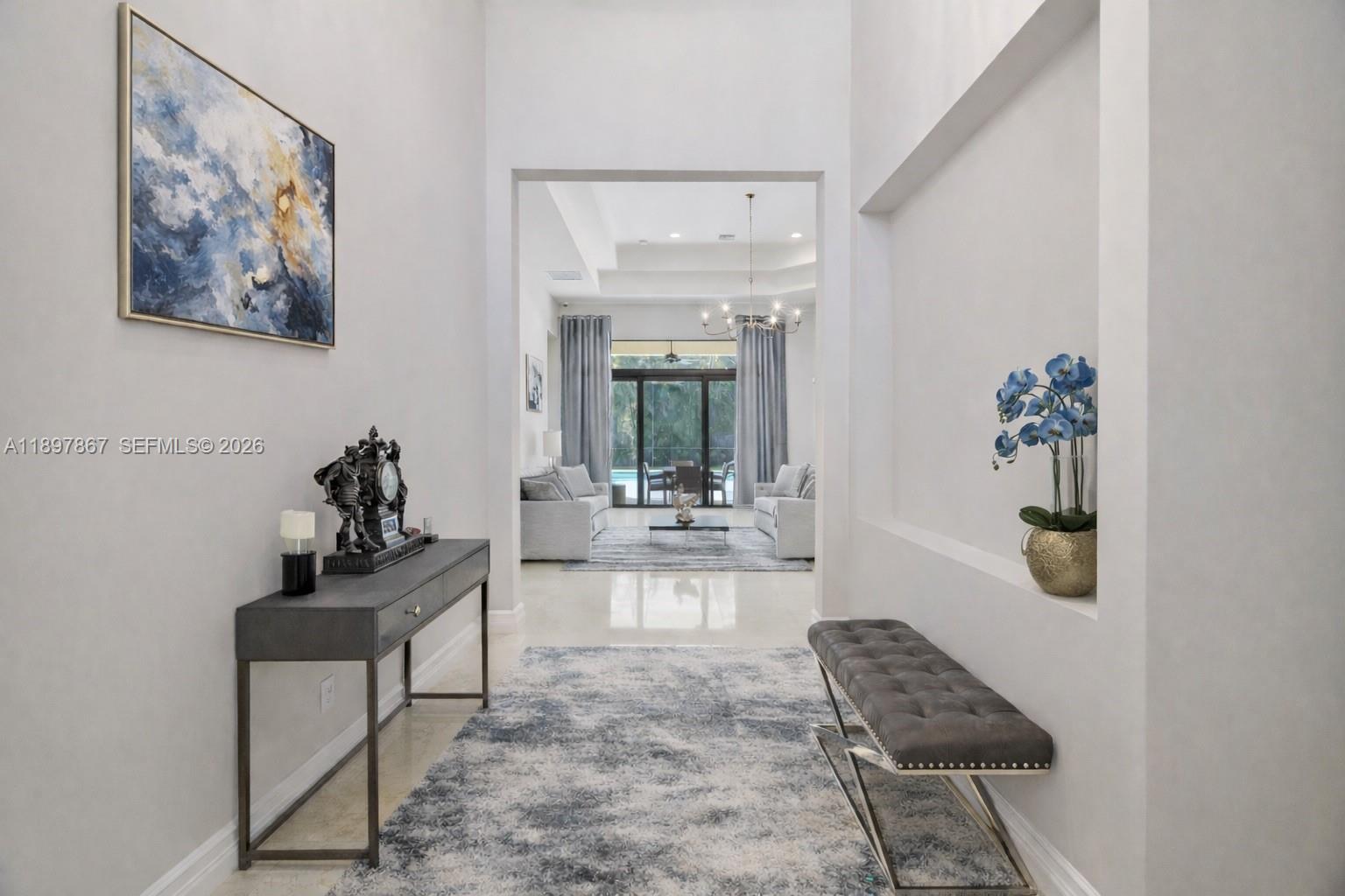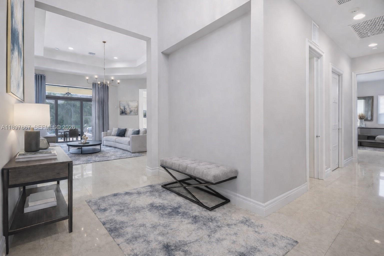 Motivated seller, price reduced by $50,000. Beautiful Charleston Grande model in Seven Bridges! This one-story 5BR/5BA home offers nearly 4,000 sq. ft. on one of the largest corner lots, providing complete privacy with no homes or roads directly facing the property. Just a short walk to the 30,000 sq. ft. clubhouse. Features include a gourmet kitchen with high-end stainless steel gas appliances, formal dining room, wet bar, impact glass windows, spacious ensuite bedrooms, and a circular driveway. The primary suite boasts a coffered ceiling, dual walk-in closets, and a luxurious bathroom with dual sinks. Enjoy the screened saltwater pool with heater and outdoor kitchen. Additional upgrades include a whole-house generator, camera system, and full-home water filtration. Meticulously maintained and move-in ready—this home is a must-see!