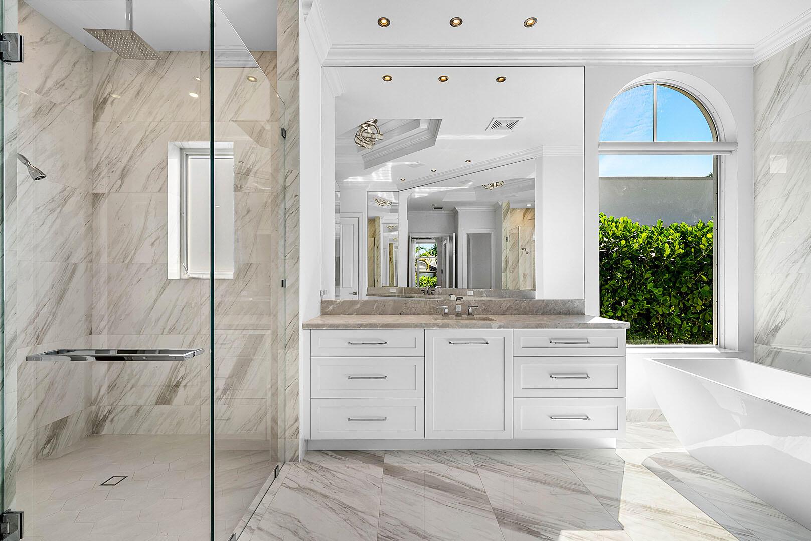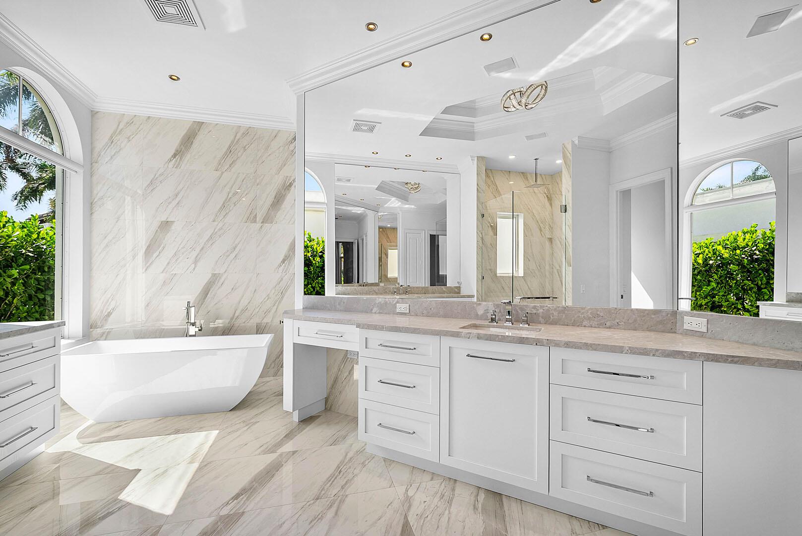Welcome to 2124 West Maya Palm Drive, a beautifully renovated transitional estate in Boca Raton's Royal Palm Yacht & Country Club. Designed with elegance and comfort, this home offers a light-filled layout and refined finishes. The formal living room features a marble fireplace and serene backyard views. The first-floor primary suite is a luxurious retreat with new hardwood floors, dual custom closets, a spa-like bath with marble vanities, separate water closets, a soaking tub, and motorized shades. The main level also has a private office with built-ins, an elegant powder room, and a guest suite with new flooring and an updated bath. The gourmet kitchen has been reimagined with ample storage, sleek countertops, and dual dishwashers, opening a spacious family room perfect for