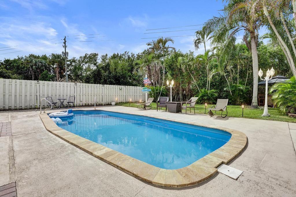 Welcome to your private paradise in Strawberry Lakes! This 3-bed, 2-bath, 2 car garage pool home is designed for entertaining. The backyard is the star, 1 of only 7 in the community with a sparkling pool, tiki hut, & plenty of space to host unforgettable gatherings. Enjoy a covered, screened patio, lush landscaping, & one of the largest lots in the neighborhood. Inside, you’ll find vaulted ceilings with crown molding, recessed lighting, luxury vinyl plank flooring, a modern kitchen & white granite counters, a skylight, & stainless appliances. All windows, doors & sliders are hurricane impact. The primary suite features a double door entrance, an upgraded bathroom with white and blue subway tile, a rain shower, & dual vanities. This home is move-in-ready, ready to host your first party!