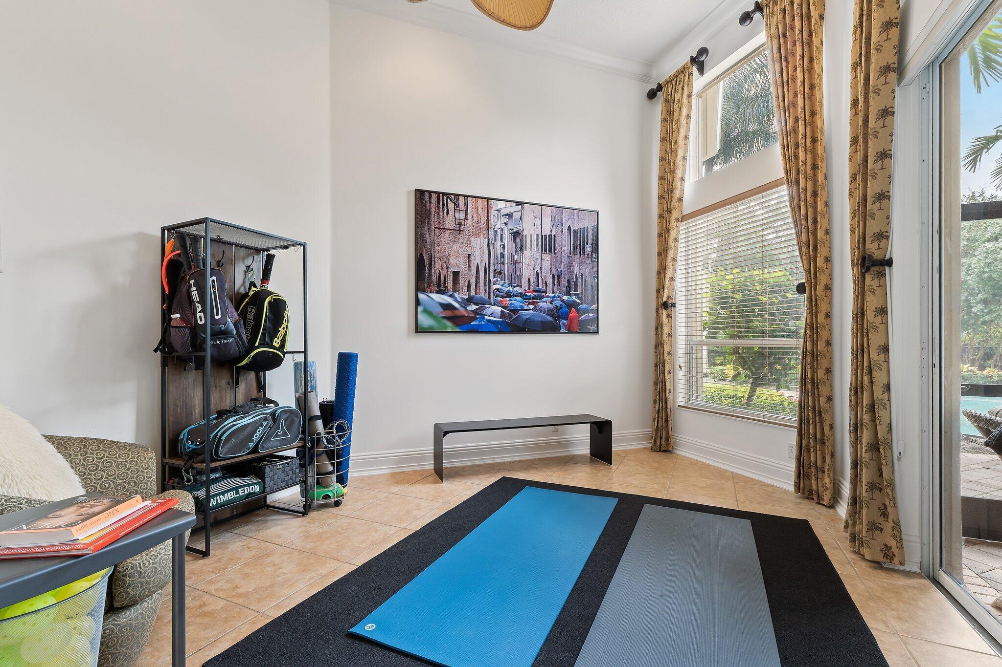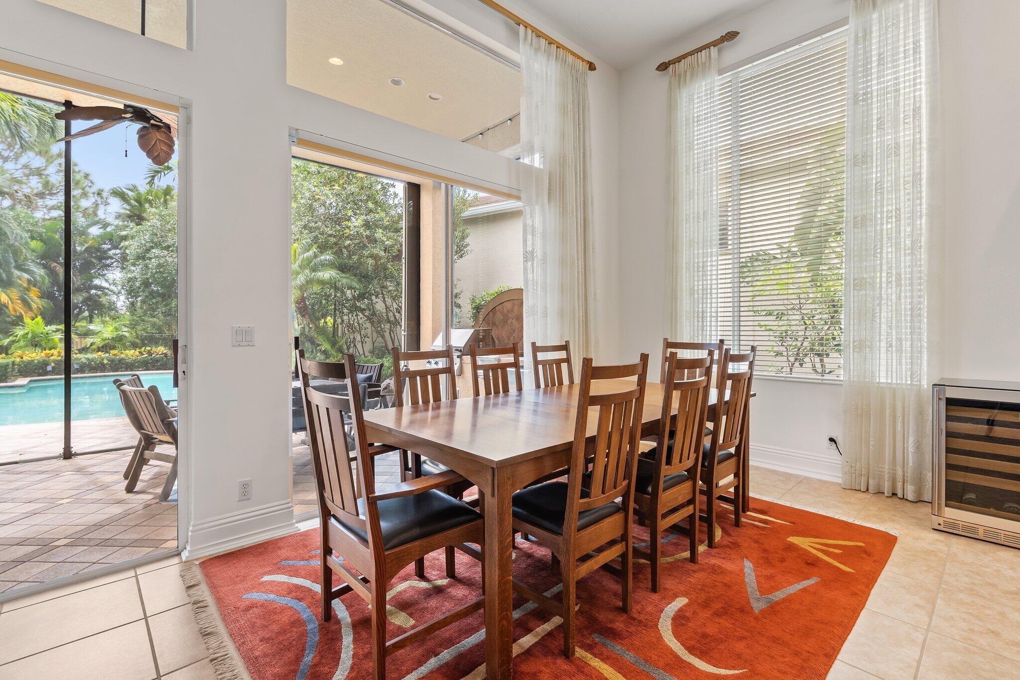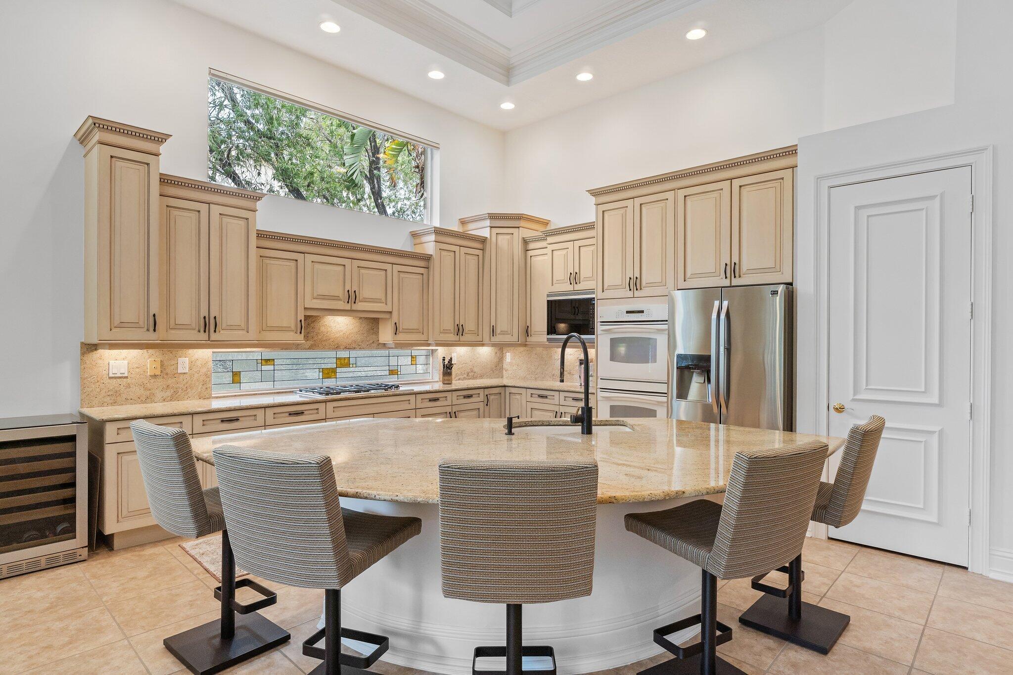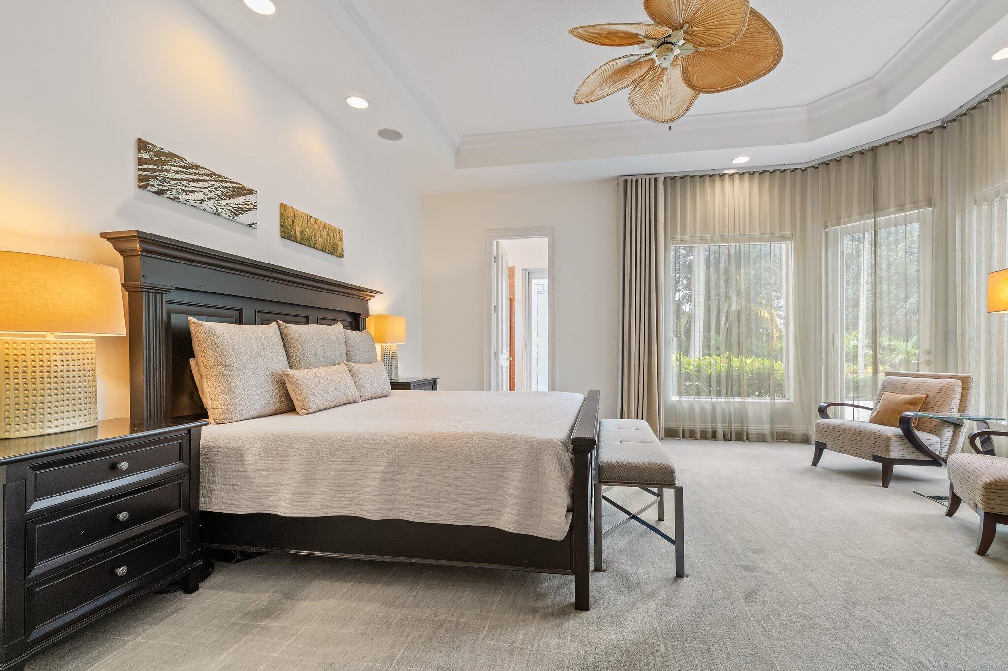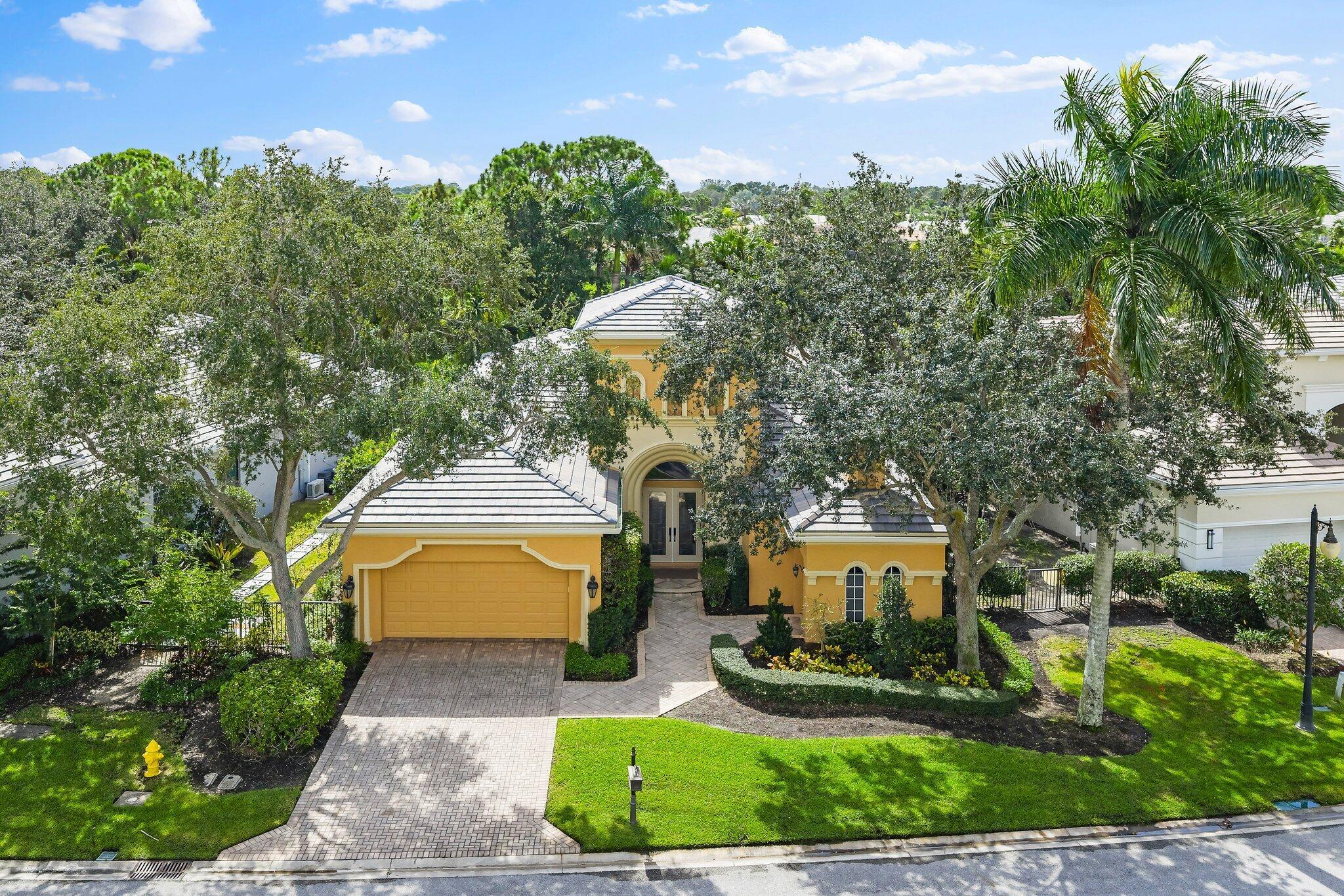 Beautiful single-story home on desirable Via Paradisio in Mirasol Country Club, a short walk to all of the club's amenities (including soon-to-open indoor pickleball facility) and a quick drive to the community entrance/exit. This immaculate Bernini II floorplan has over 3,000 SF of living space boasting a light-filled great room, 3 bedrooms plus an office, 4.5 bathrooms, formal dining/bonus room, a 2.5 car garage, and a new roof (2024). Upon entry, you'll be greeted by an expansive foyer with beautiful architectural archways, custom stained glass impact door, a 24-foot ceiling, and garden views on display through the wall of windows on the back of the house. The entertaining space features an open-concept kitchen with island bar seating, eat-in kitchen area, and seamless