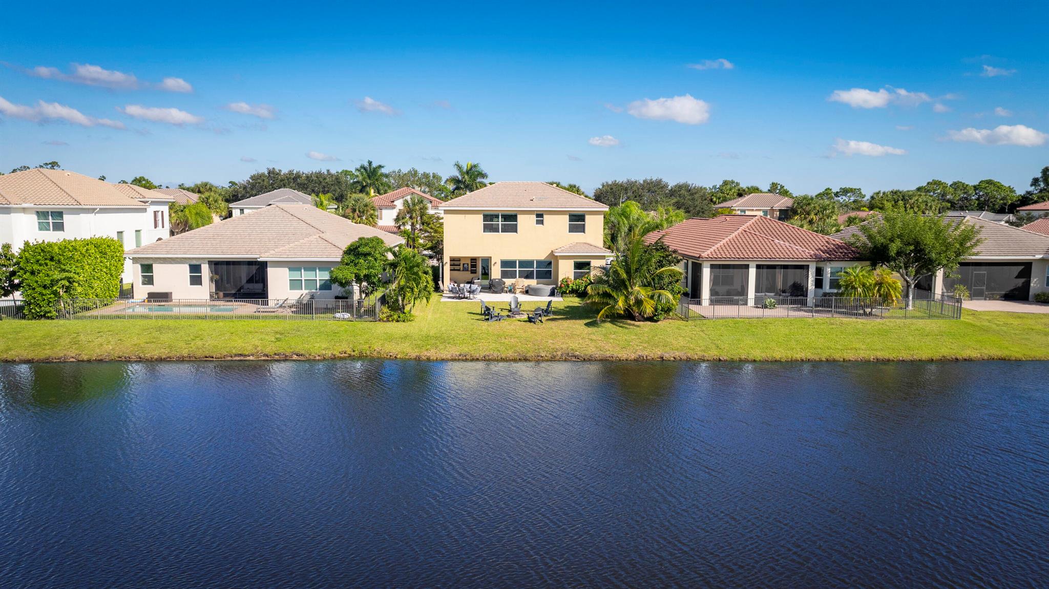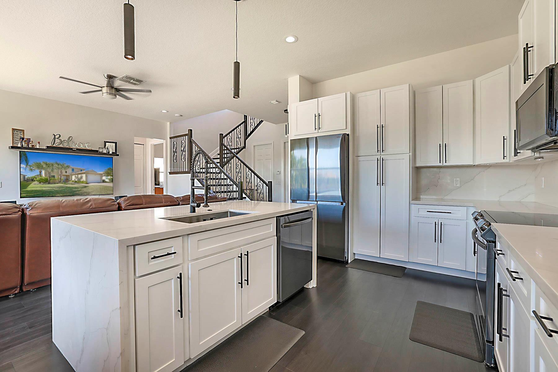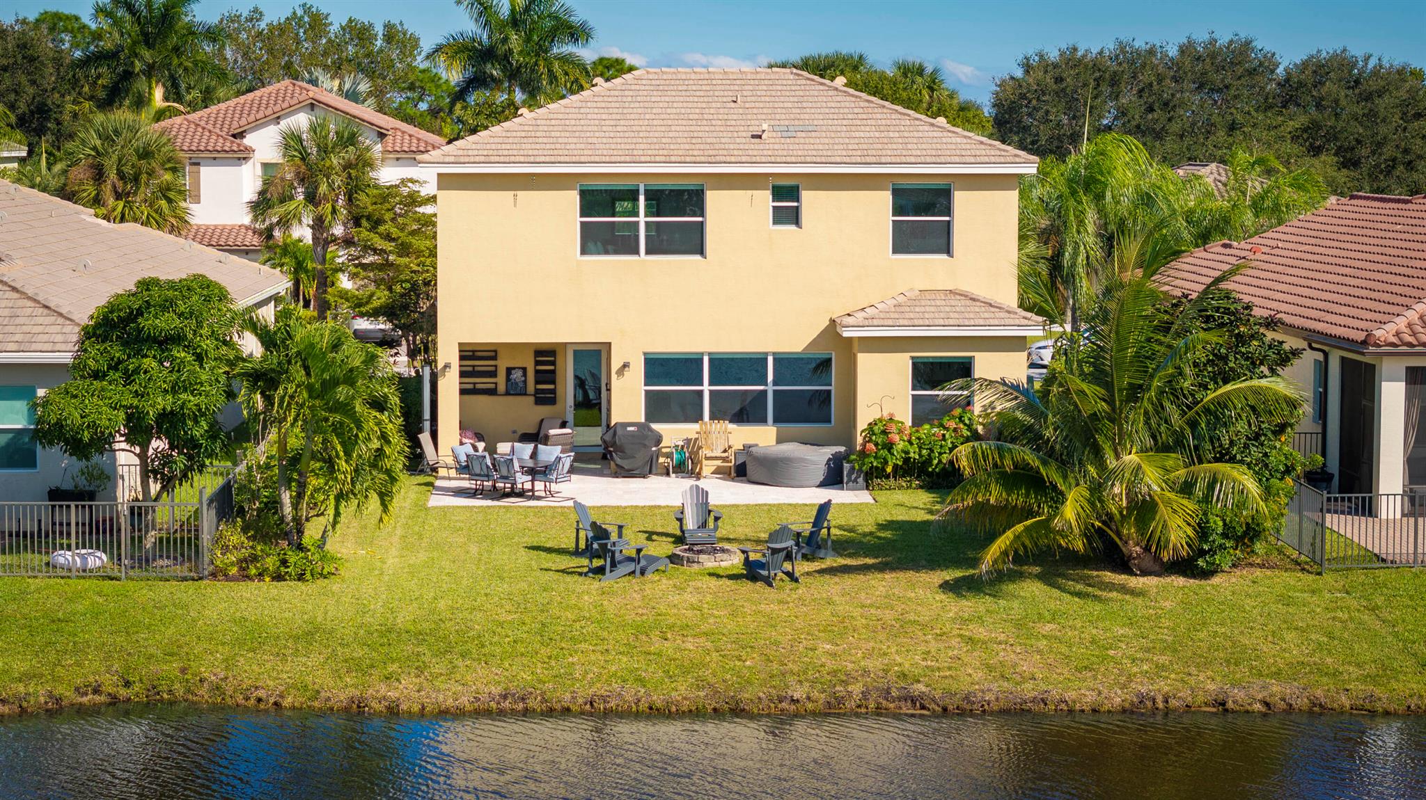 Enjoy stunning lakefront living in this impeccably updated and maintained home featuring upgraded floors, cabinets, quartz counter tops and backsplash, large kitchen island, stainless steel appliances, light fixtures, fans, impact windows and doors, remote control window blinds, travertine patio pavers and an abundance of natural light. Room for a pool and more in the large backyard. Enjoy fishing in the lake and nights around the fire pit. 3 bedrooms+ loft. One bedroom on main floor near cabana bath. Large closets and extra storage space. Close to schools, shopping, dining, entertainment, and recreation. Resort-style amenities include pickleball, pool, hot tub, tennis, clubhouse, gym, splash pad, sand volleyball, walking paths, basketball, and more. Low HOA Must see. Move-in ready.