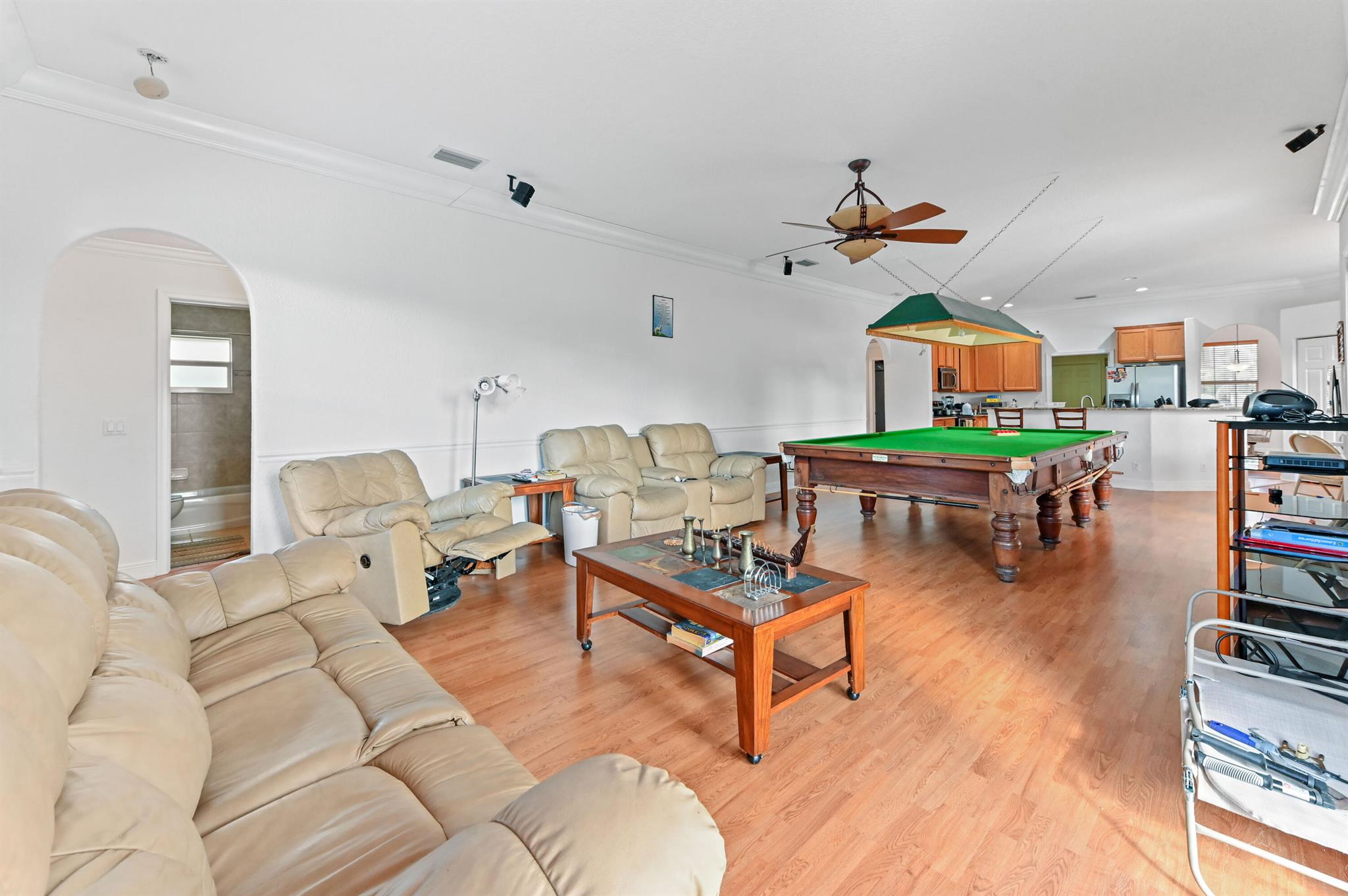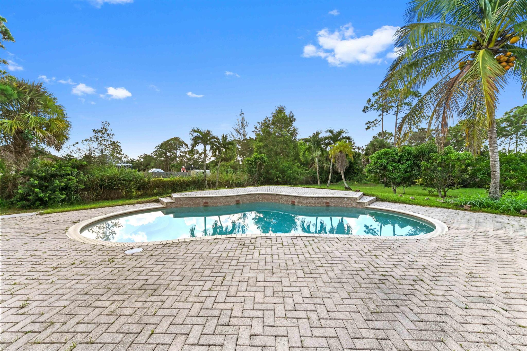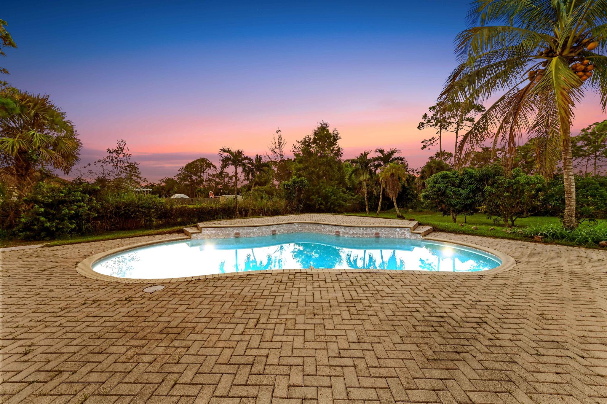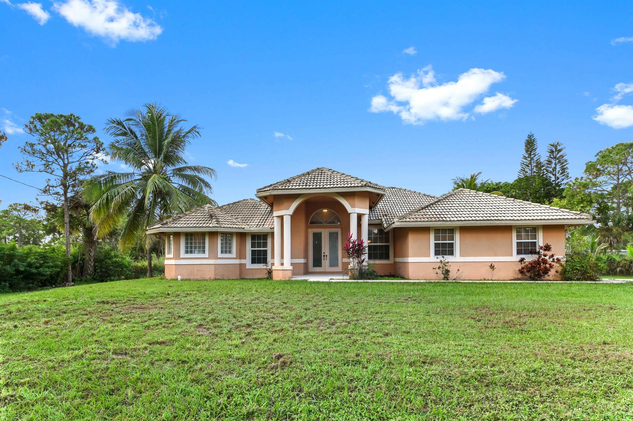 Prepare to be amazed by this truly stunning and feature-rich ranch home, perfectly situated on a fully fenced 1.25-acre canal-front lot in a highly desirable Acreage location. This magnificent property was designed for luxury and comfort, featuring five bedrooms and three baths, all meticulously planned. Step inside to discover a spacious and elegant interior boasting designer features, including knockdown textured walls and ceilings and stylish wood laminate flooring throughout the main areas. The home offers both formal living and dining spaces, complemented by a truly huge family room perfect for large gatherings.