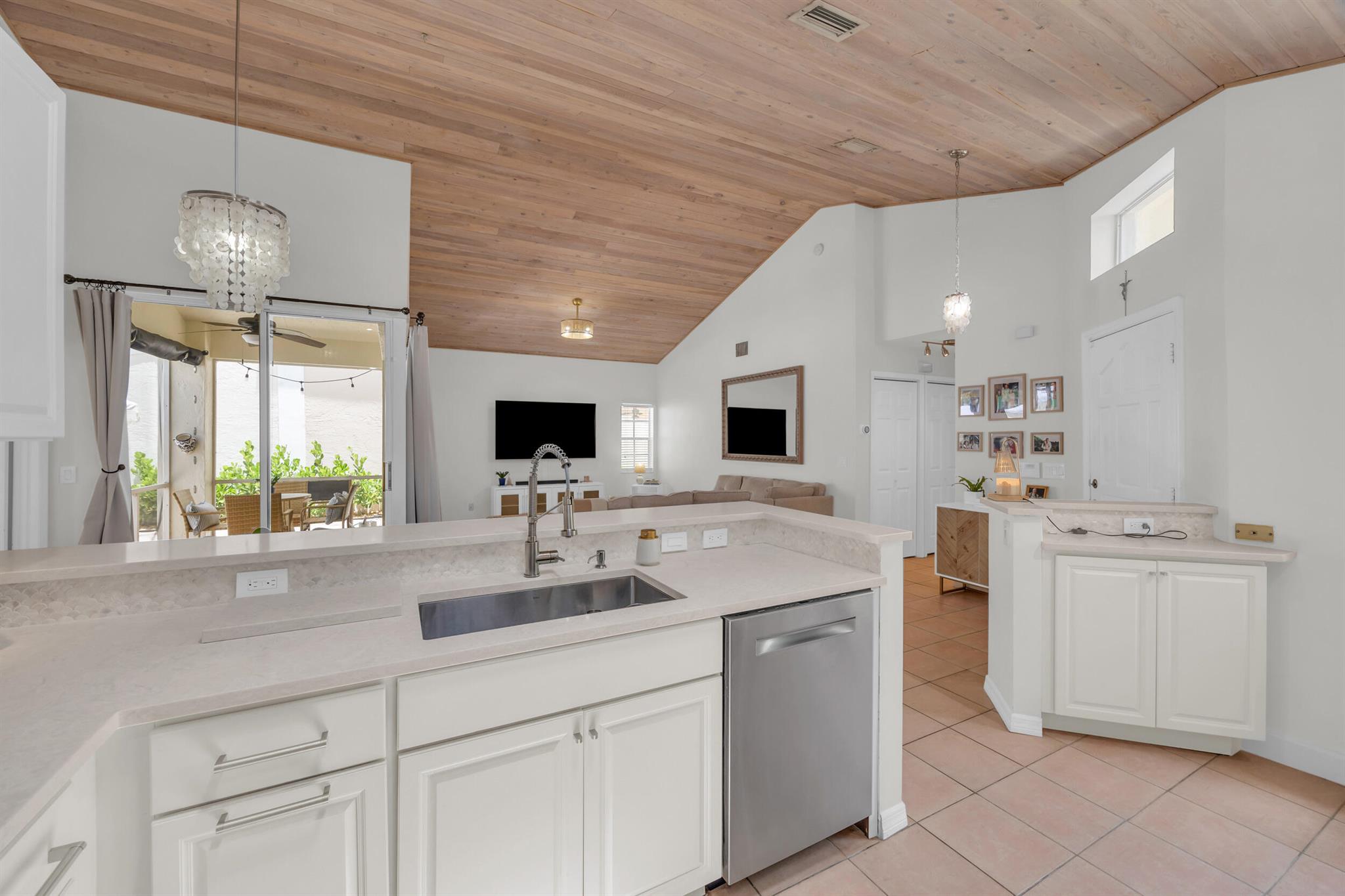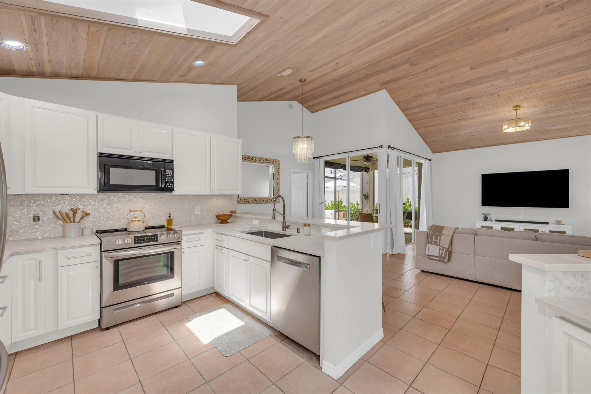 Beautifully updated 3 bedroom, 2 bath home located in the highly desirable Barclay Club at PGA National in Palm Beach Gardens. This single-story residence features a brand-new kitchen with beautiful white cabinets, quartz countertops, a stylish new backsplash, stainless steel appliances and a spacious breakfast bar perfect for casual dining or entertaining. The open-concept living and kitchen area is enhanced by vaulted ceilings finished in rich knotty pine wood, adding warmth, texture and coastal charm to the home's bright, airy feel. The primary suite includes generous closet space and an updated bath, while two guest bedrooms share a refreshed second bath.