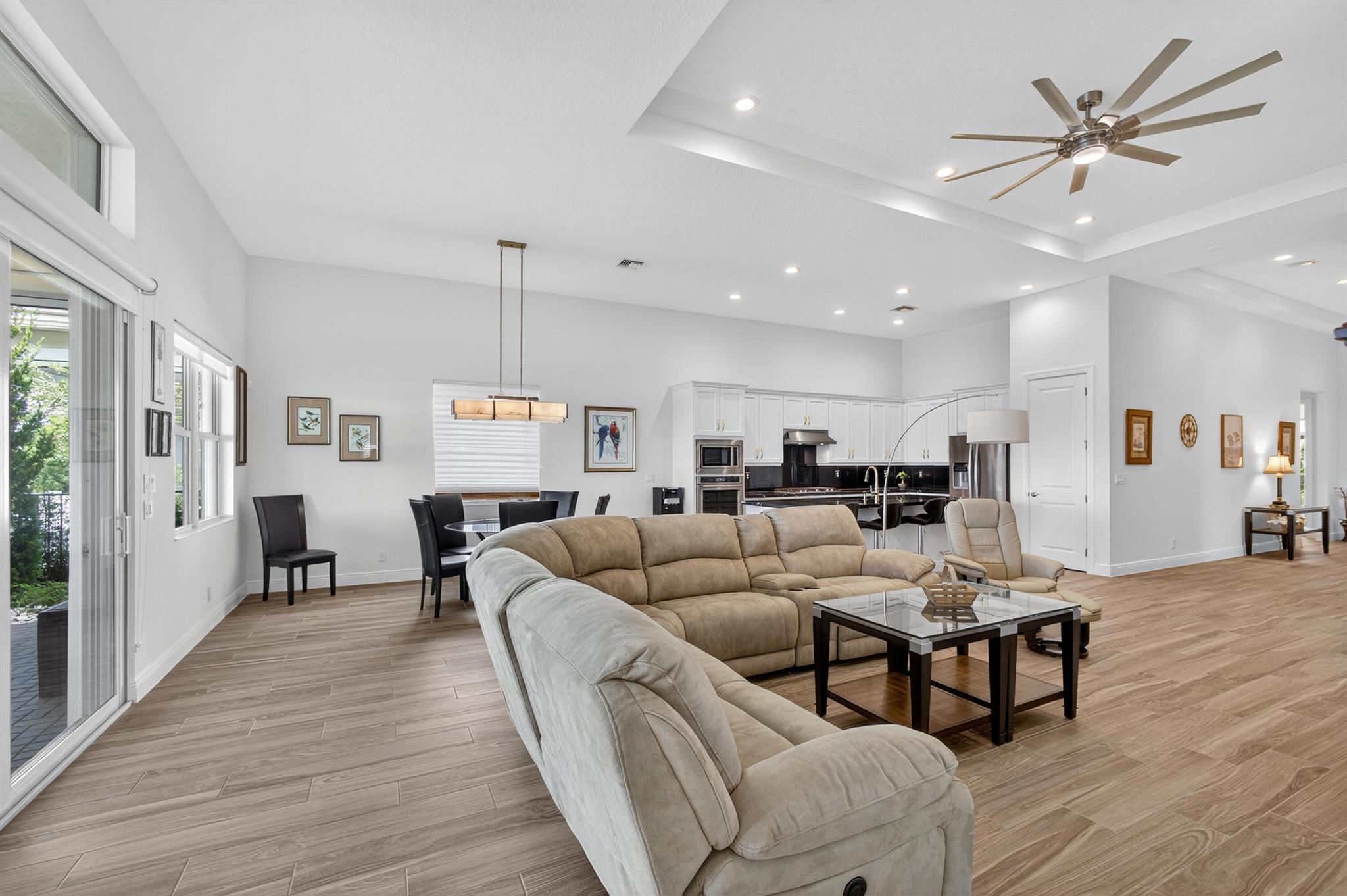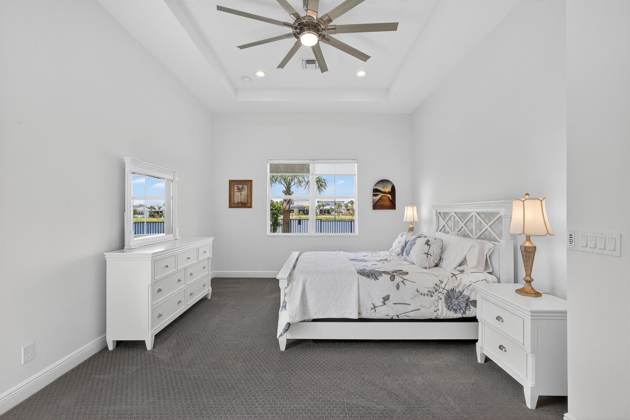 This beautifully appointed 3-bedroom plus office, 3-bath home offers an open and airy floor plan with a bright coastal feel and stunning wide water lake views. Western exposure provides magnificent sunsets that can be enjoyed from the extended lanai patio, creating the perfect setting for entertaining or relaxing by the water. The home features a Tropical-inspired backyard complete with astro turf, a golf putting area, and remote-controlled hurricane patio screens for year-round comfort. Inside, every detail has been thoughtfully upgraded, whole house, Generac Generator, oversized 8-blade ceiling fans with lights in the living areas, bedrooms, and patio, custom blinds on all windows, upgraded light fixtures, and an oversized jetted tub in the primary suite and comfort height toilets.
