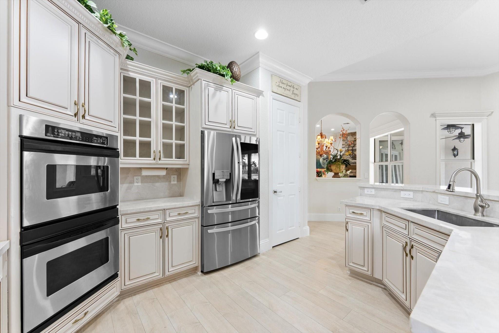 Simply a beautiful home, perfectly sited on an equally beautiful lakefront lot in the exclusive Estate section of Parkland Isles. Offerings: a 2023 Roof, Impact Glass Doors, & tasteful updates with high-end finishes. Panoramic water views via walls of glass & breathtaking sunsets fill the home with natural light & beauty. The creamy off-white kitchen boasts quartzite counters, top-tier appliances, & opens to the spacious family room. The primary suite is a private retreat with an updated spa-like bath & sitting area overlooking the pool & lake. A resort-style pool, manicured landscaping, & serene waterfrontage complete the setting. A triple-split design offers privacy for family & guests. All assigned schools are A rated & are a short stroll away. Residents enjoy World Class Amenities.