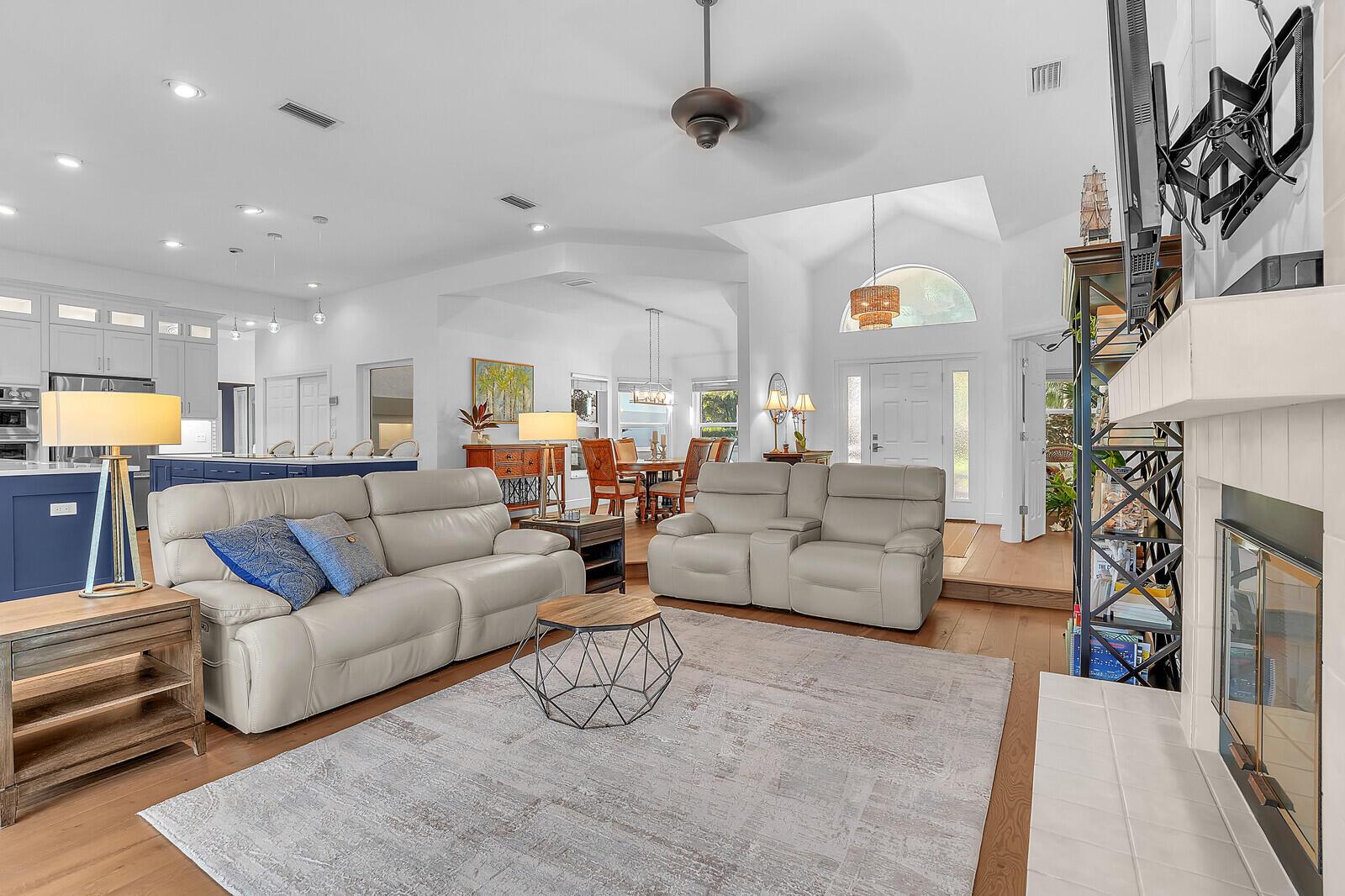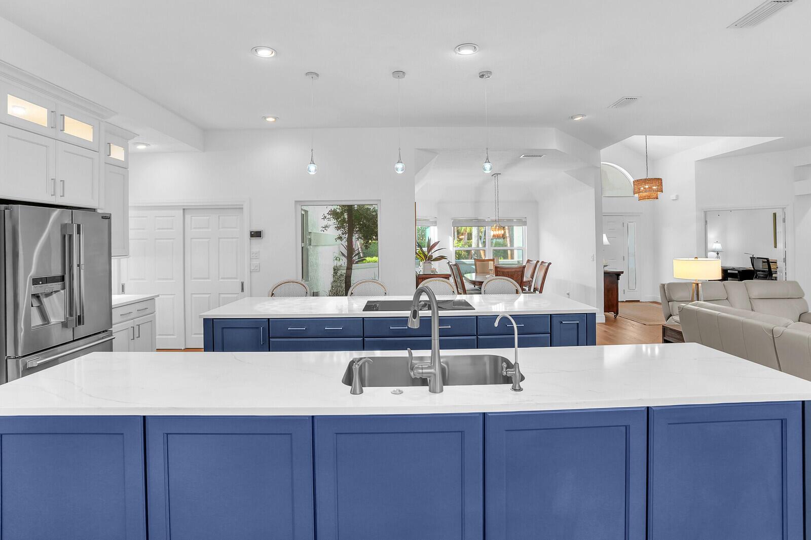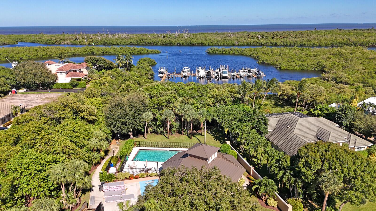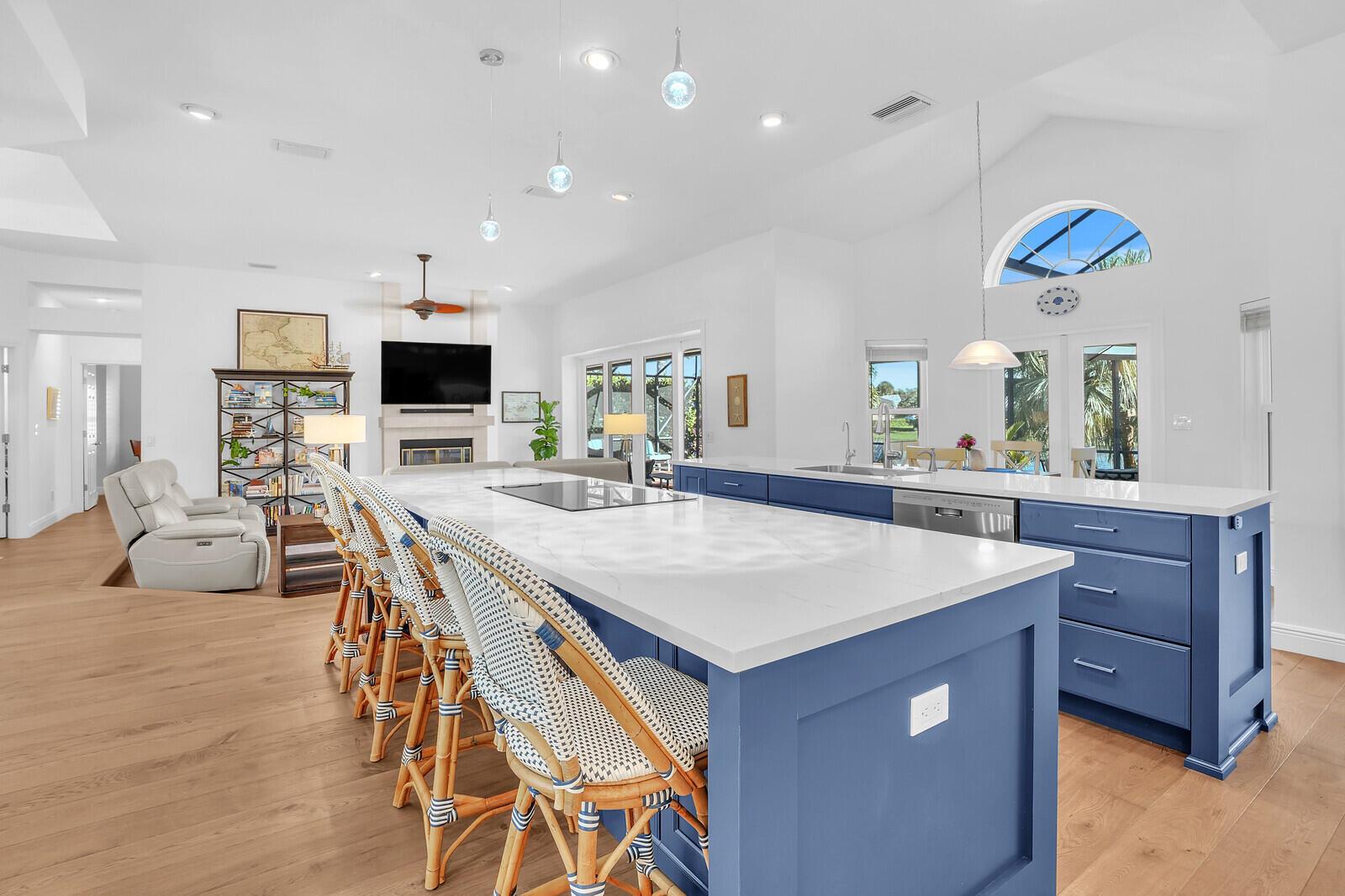 Bring Your Boat! Experience luxurious coastal living in this exquisitely remodeled 3-bedroom plus office, 3.5-bath lakefront, pool home with 2-car garage, located in the sought-after gated community of Marina Bay in Hobe Sound. One of only 37 homes in this private waterfront enclave, this former model home is perfectly positioned on a generous .459-acre lot, offering rare privacy, tranquil lake views, and an assigned 50-foot boat slip in Marina Bay's private marina just off of the ICW. Completely reimagined between 2023 - 2025, the heart of the home features a forward-thinking dual-island kitchen design, with custom one-piece quartz countertops, a seamless motion-activated sink, and reverse osmosis water to both the sink and refrigerator. Outfitted with Signature Kitchen Suite