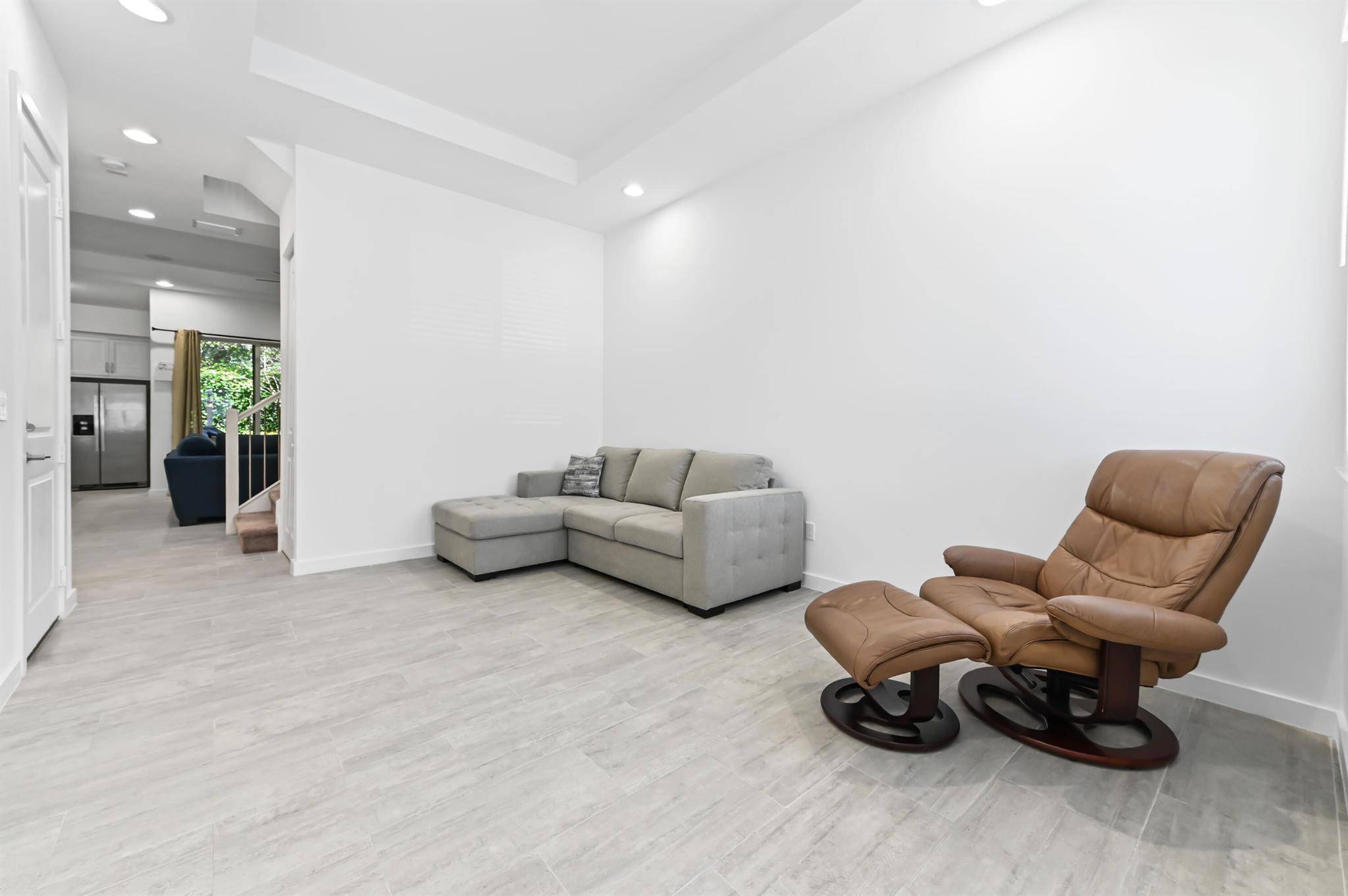 Welcome to this spectacular, modern two-story townhome, where contemporary style and a high-end finishes define the living experience in a beautifully maintained property and community. The entire residence is finished with elegant flooring and a pristine white and gray color palette. The master suite is a luxurious sanctuary, featuring a private balcony and a relaxing master bath that is like a spa. This bath boasts a stunning extended dual-sink vanity topped with white marble-look quartz, providing exceptional storage and counter space. The shower is a masterpiece, offering a separate soaking tub and a large glass-enclosed walk-in shower fully finished with high-end, continuous marble-look tile and a river rock floor.