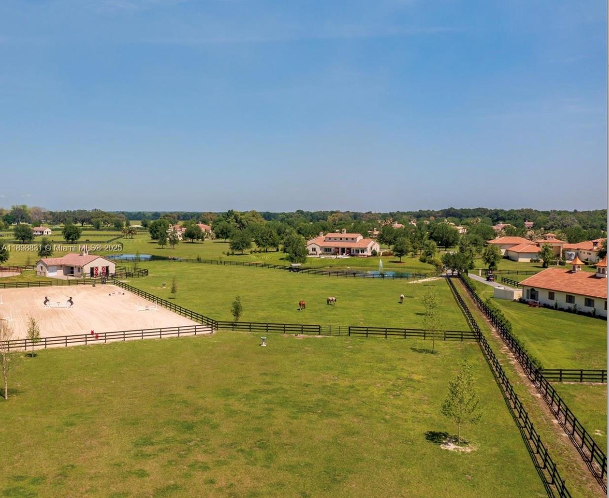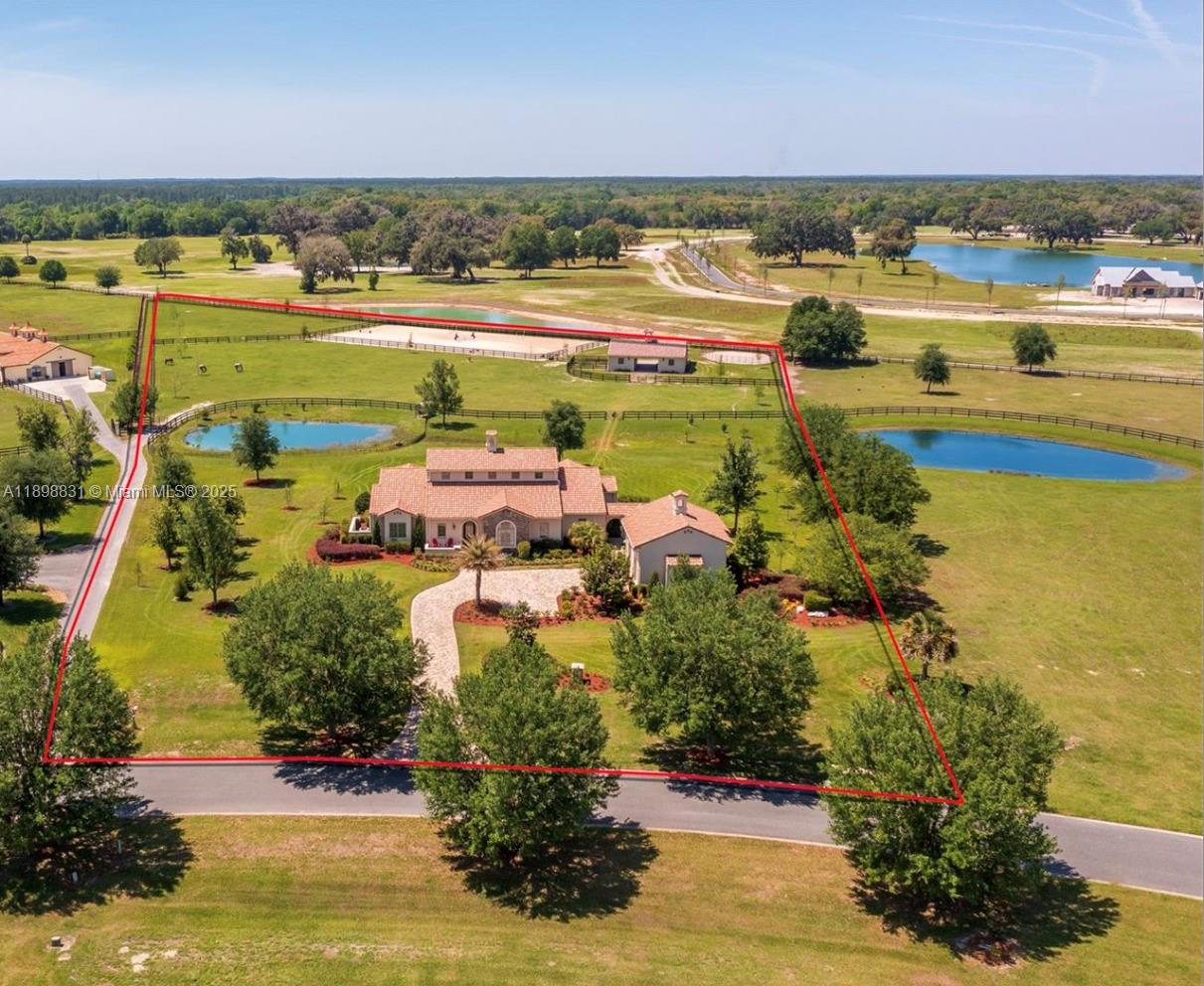 Luxury Tuscan estate in the gated equestrian community of Bel Lago, just minutes from the World Equestrian Center. This 4BR/4BA + media room home boasts over 3,800 sq ft under air with cathedral ceilings, travertine finishes, plaster walls, custom kitchen, formal dining, and a gas fireplace. Enjoy sunset views over the pool and pastures. The spacious primary suite, ample closets, tray ceilings, and elegant details throughout offer both beauty and comfort. A breezeway leads to a 2-car garage with AC and an upstairs room. Outdoors, a 41x14 heated pool/spa (2020), 3-stall concrete block barn (2022) with tack room, bath, 2 paddocks, and 200x100 arena make this ideal for equestrian living. Direct access to trails and set on over 5 acres with professional landscaping and cryo board fencing.