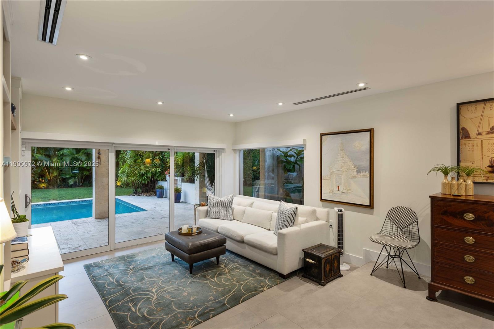 Hidden behind a lush private atrium, this 5BD/4.5BA residence lives like a private retreat. The entry sets a tranquil tone—an open-air enclave that adds privacy and a peaceful sense of arrival. Inside, light and greenery fill every space, where wood-clad ceilings, glass doors, and natural textures create relaxed sophistication. The show-stopping primary suite is a true sanctuary, rarely found in this price category—nearly two rooms in one, with a lounge area, private pool access, and a spa-inspired bath. On the opposite side, four generous bedrooms, two ensuite, offer comfort and privacy. Tall privacy hedges surround the pool, creating a serene escape with spaces to dine, lounge, or unwind. Homes of this character are seldom available—come experience it for yourself.