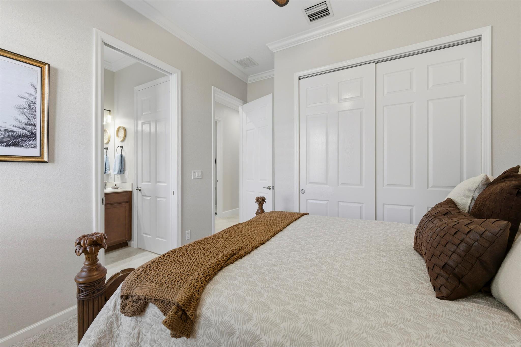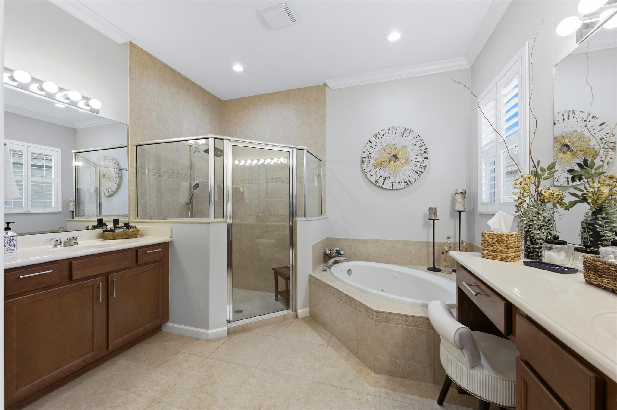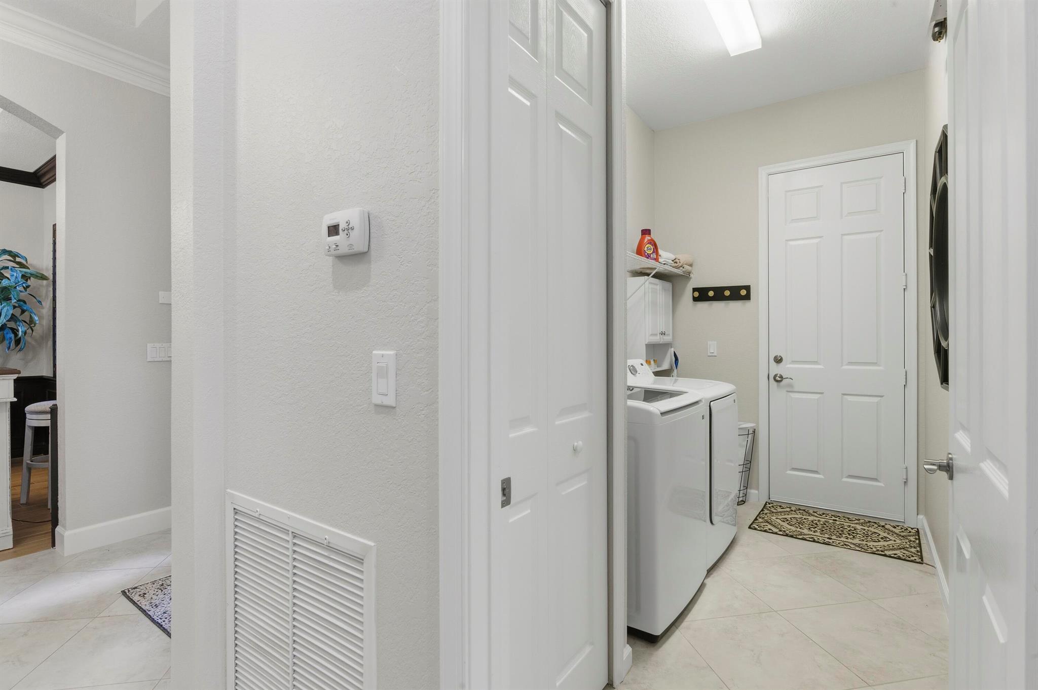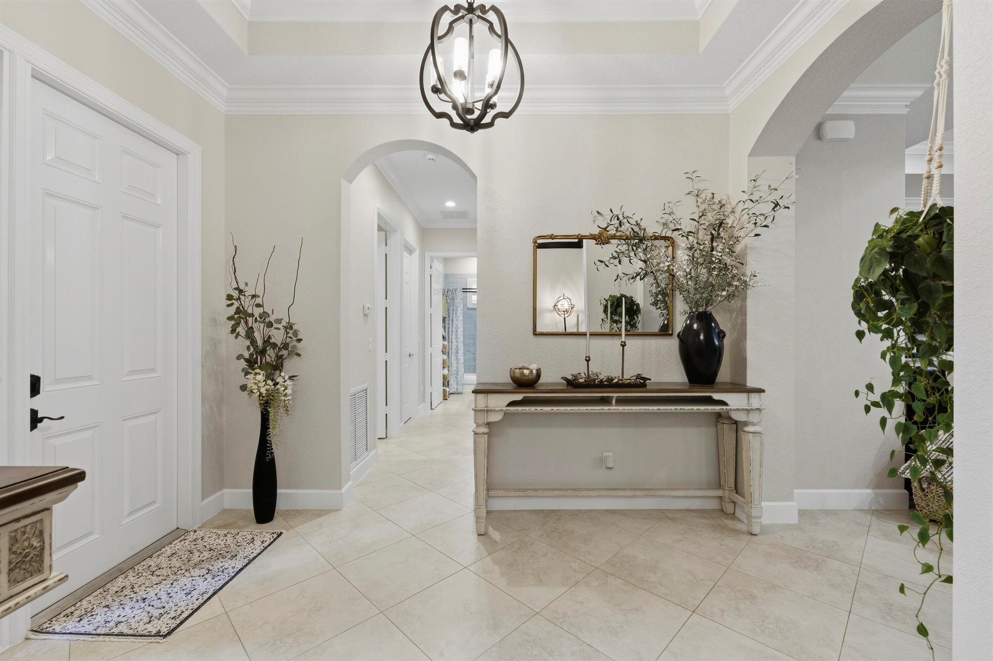 Welcome to Savannah Estates (aka Venetian Village), a gated community of just 50 homes. This well-maintained CBS 3BR/2.5BA pool home offers a 3-car air-conditioned garage with epoxy flooring and is ideally located on a cul-de-sac. Built in 2013, features include impact windows, crown molding, tiled common areas, and refreshed 2024 landscaping with remote irrigation. The driveway, patio, and pool deck are covered with brick-pavers. Enjoy a screened lanai overlooking the heated saltwater pool and spa with lighted waterfalls (2024) --perfect for entertaining or relaxing in style. A kitchen window was added for more natural light and a pool view. Convenient to I-95, schools, shops, medical services dining, parks, beaches, and golf. PBI is approx 45 minutes away. Up to three pets welcome.
