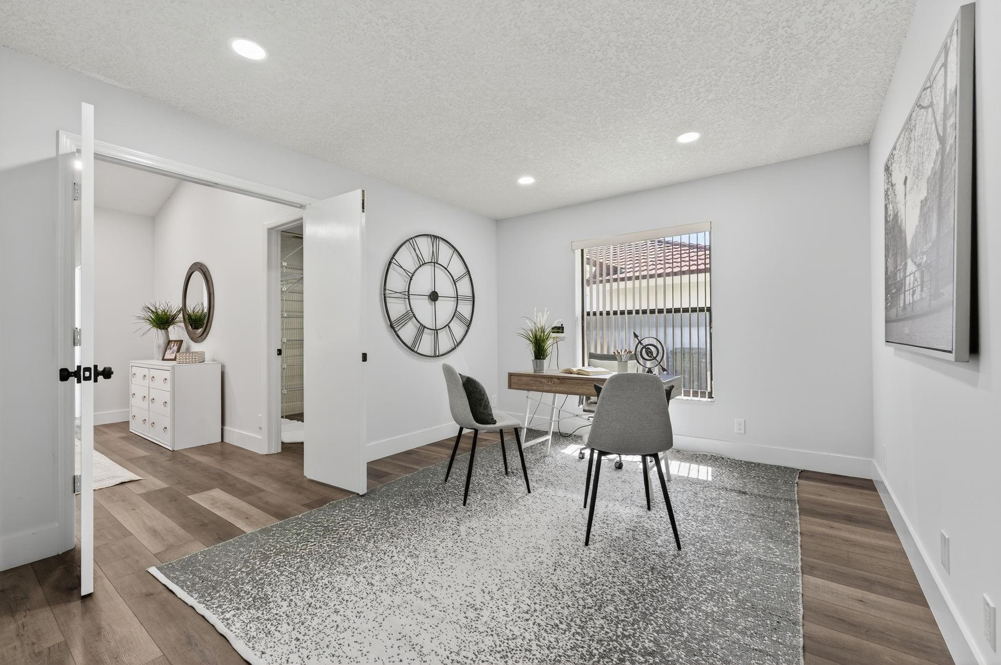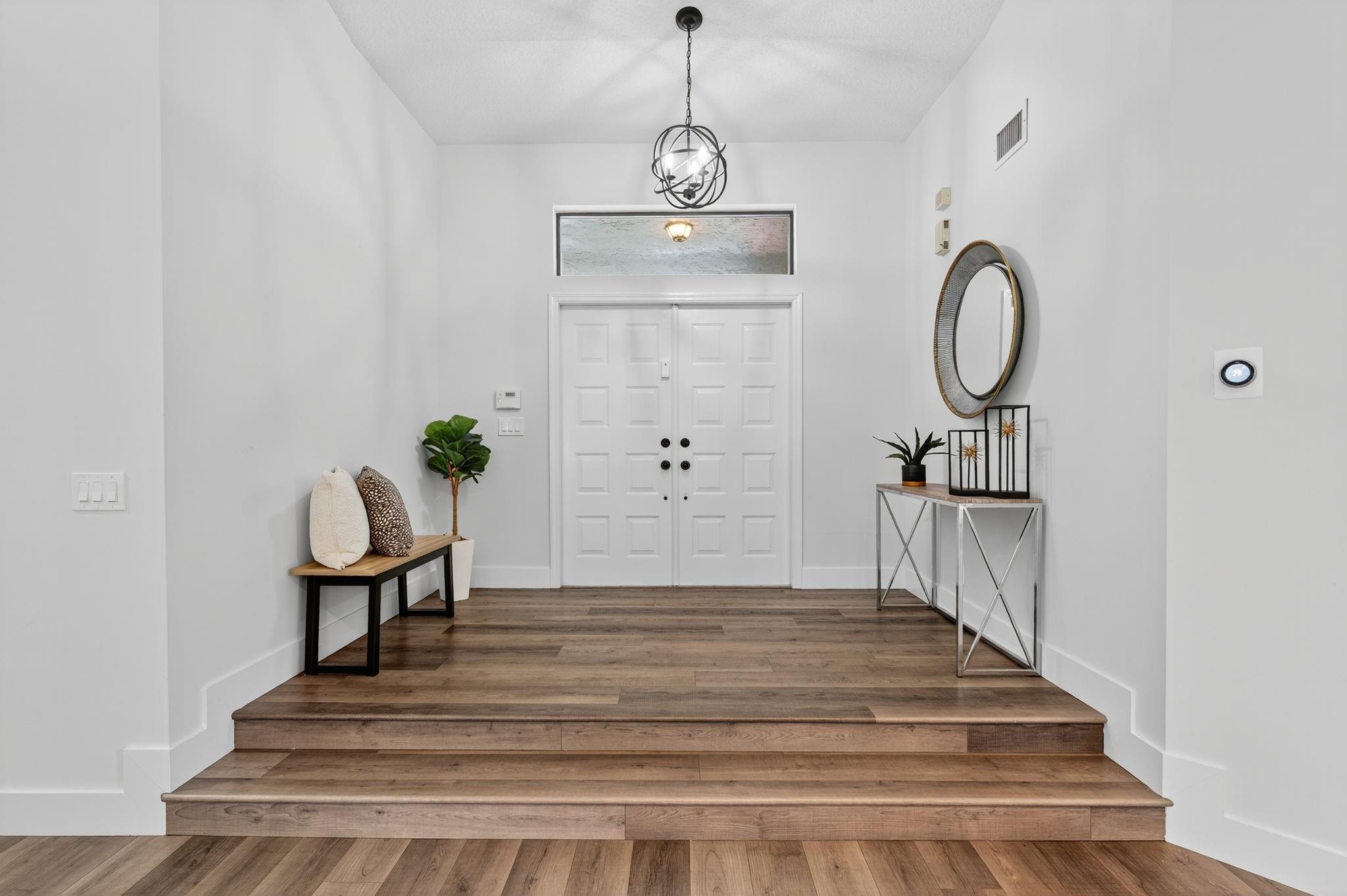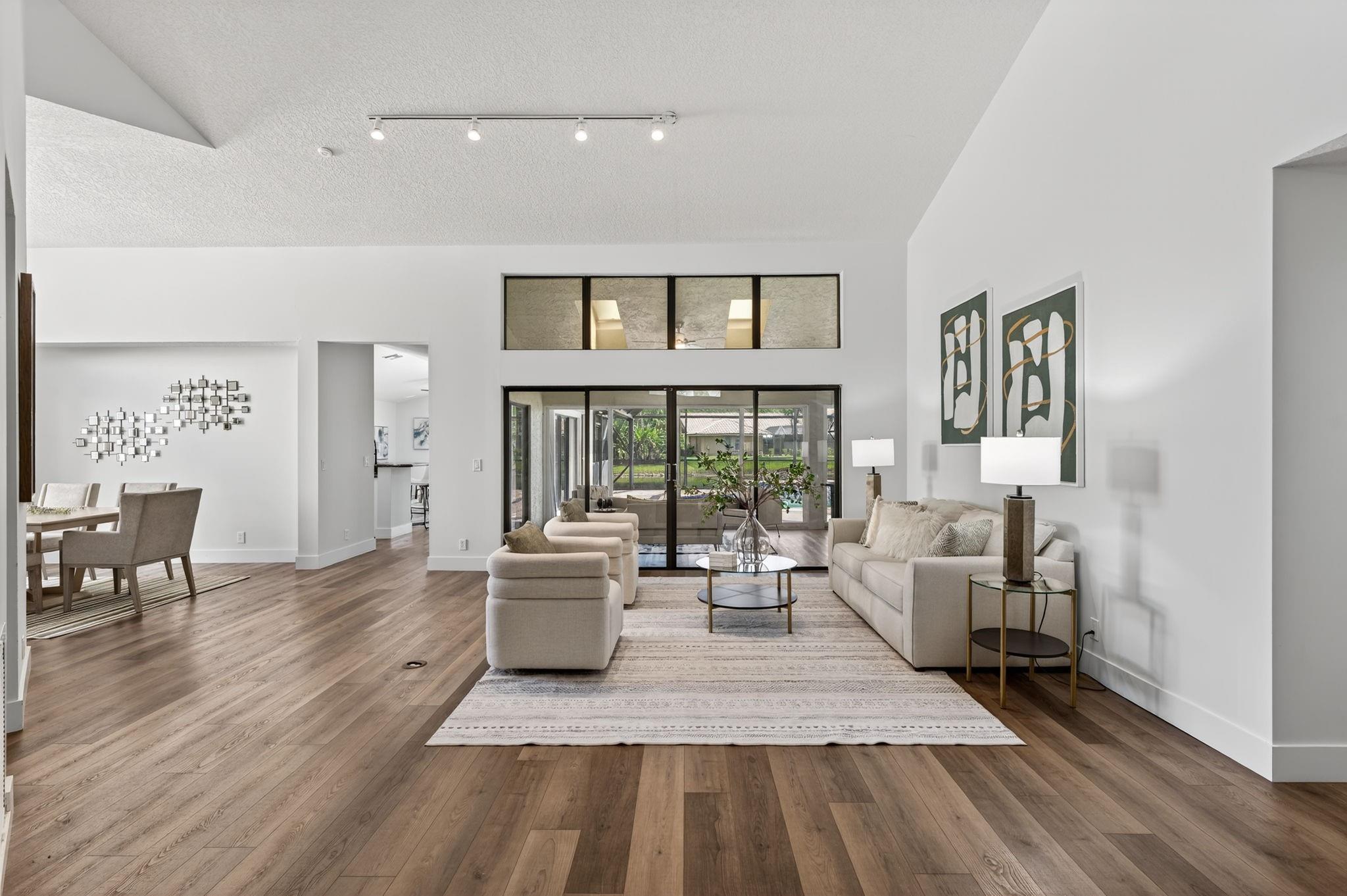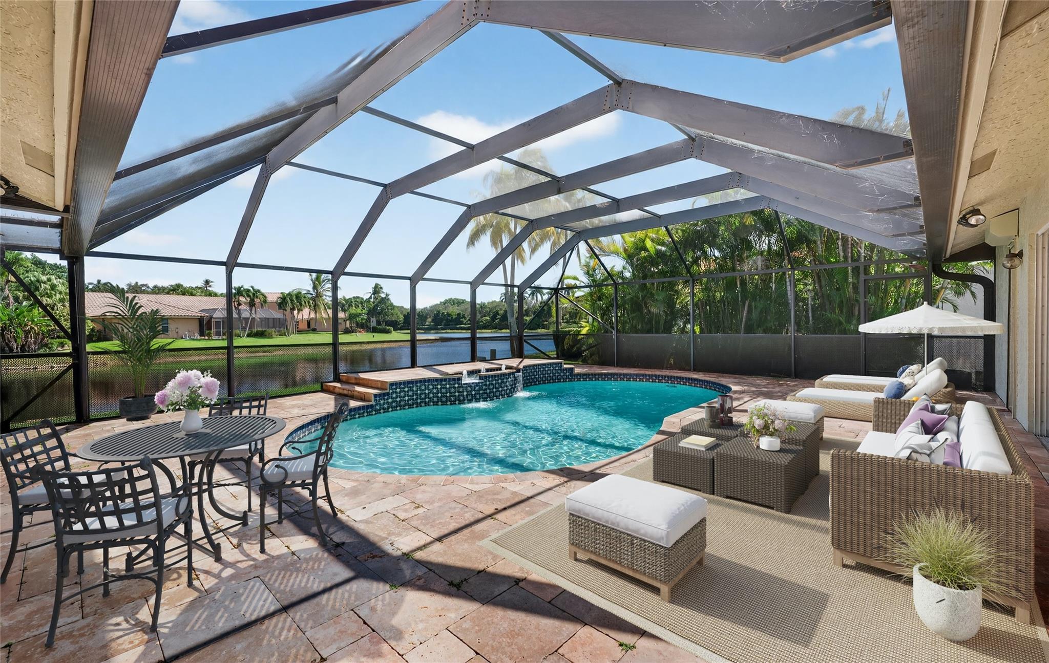 Set at the edge of a cul-de-sac in the boutique neighborhood of Sunset Springs, this stunning 4Bd, 2.5BA LAKEFRONT home is newly remodeled throughout! The expansive foyer with formal areas leads to a glass-enclosed air-conditioned SUNROOM that extends the living area to 2741 sf, providing an amazing indoor/outdoor entertainment area with new IMPACT sliding glass doors leading to the HEATED SALT POOL. Summer/Fall 2025 updates include all fully remodeled modern bathrooms, new paint in/out, new LED lighting & fixtures, a newer salt-water pool system w/ remote-controlled heater, new AC, smart-control sprinkler system, new washer, new tile on exterior walkway/entry, fresh landscaping. 10yr Roof, accordions, family room w/stone fireplace. Comm park, tennis, top schools, walkable to Town Center!