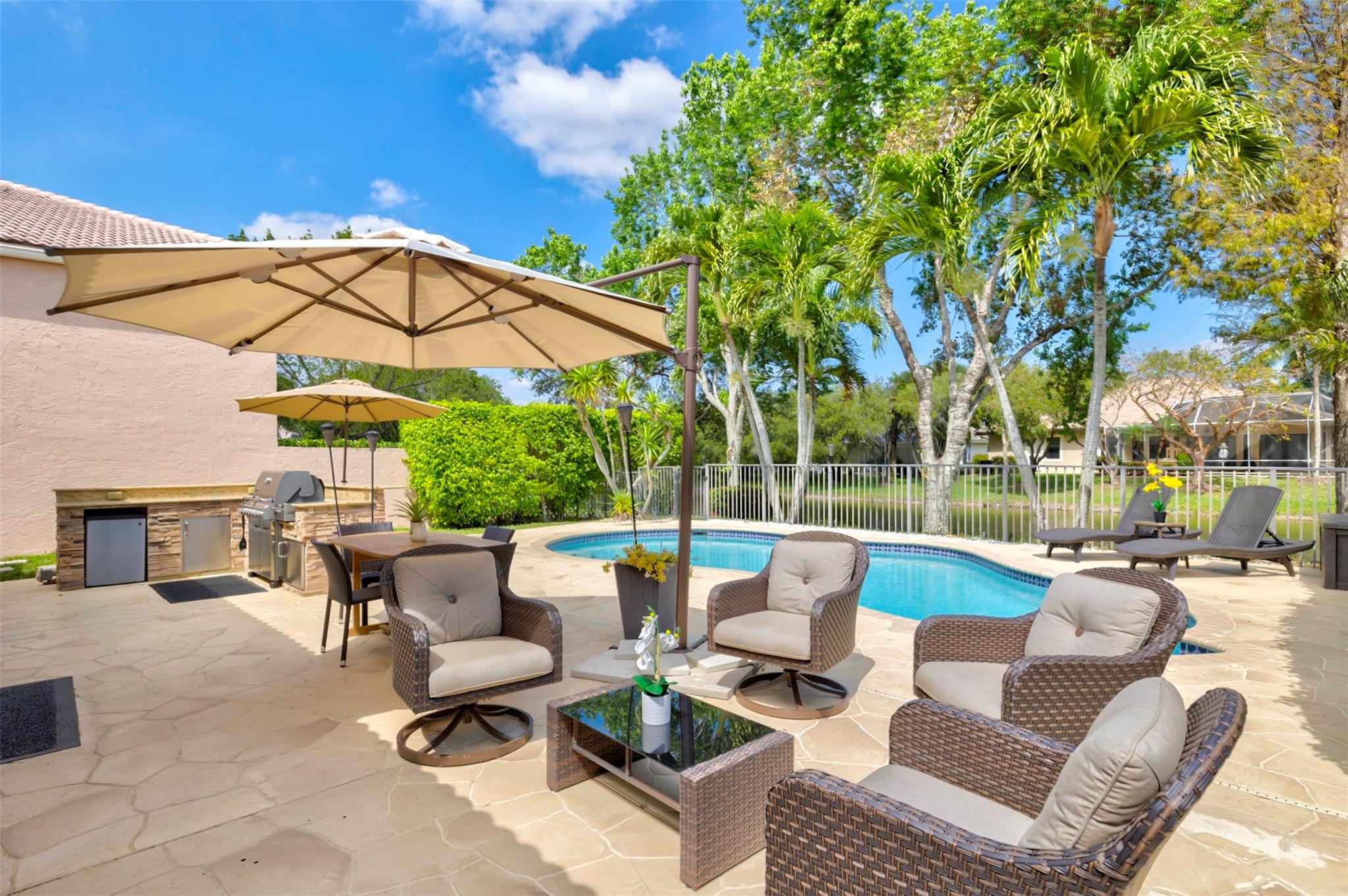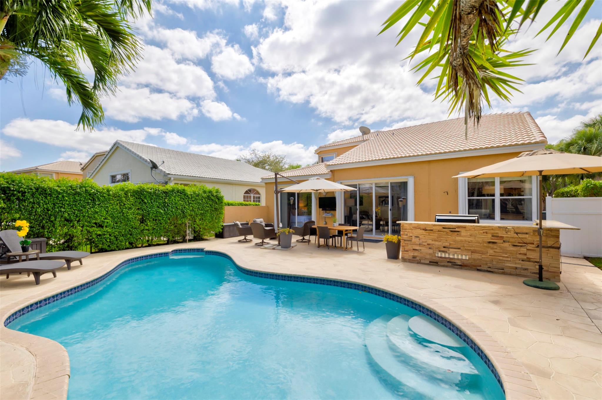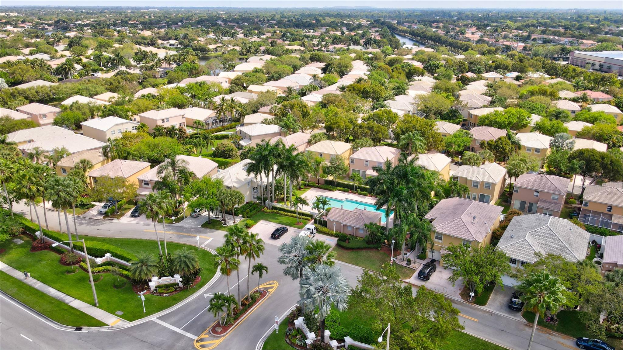 BIG 4/2.5 POOL home featuring 2,100+ SF in sought after Knightsbridge. WF w/ private salt pool. LOW HOA! Neutral ceramic tile + soaring ceiling in LR w/ Palladian windows. DR featuring a limestone accent wall. Entertaining is a breeze in your CHEF'S kitchen w/ 36” cabinets, granite counters, SAMSUNG S/S appliances. Savor morning coffee at the breakfast nook + convenient island. FR has sliders that lead to your patio. Fall in love in the XL primary BR on main level w/ additional wardrobe + large walk-in closet. NEWER primary bath w/ 2 vanities & quartz counters. Private shower & BIG soaking tub. All laminate floors up. Guest BRs have wall closets. Guest bath w/ shower, tub & vanity. Great patio w/ summer kitchen & pool. Inside laundry w/ W/D & sink. Newer HWH. Accordion shutters! NEW ROOF!