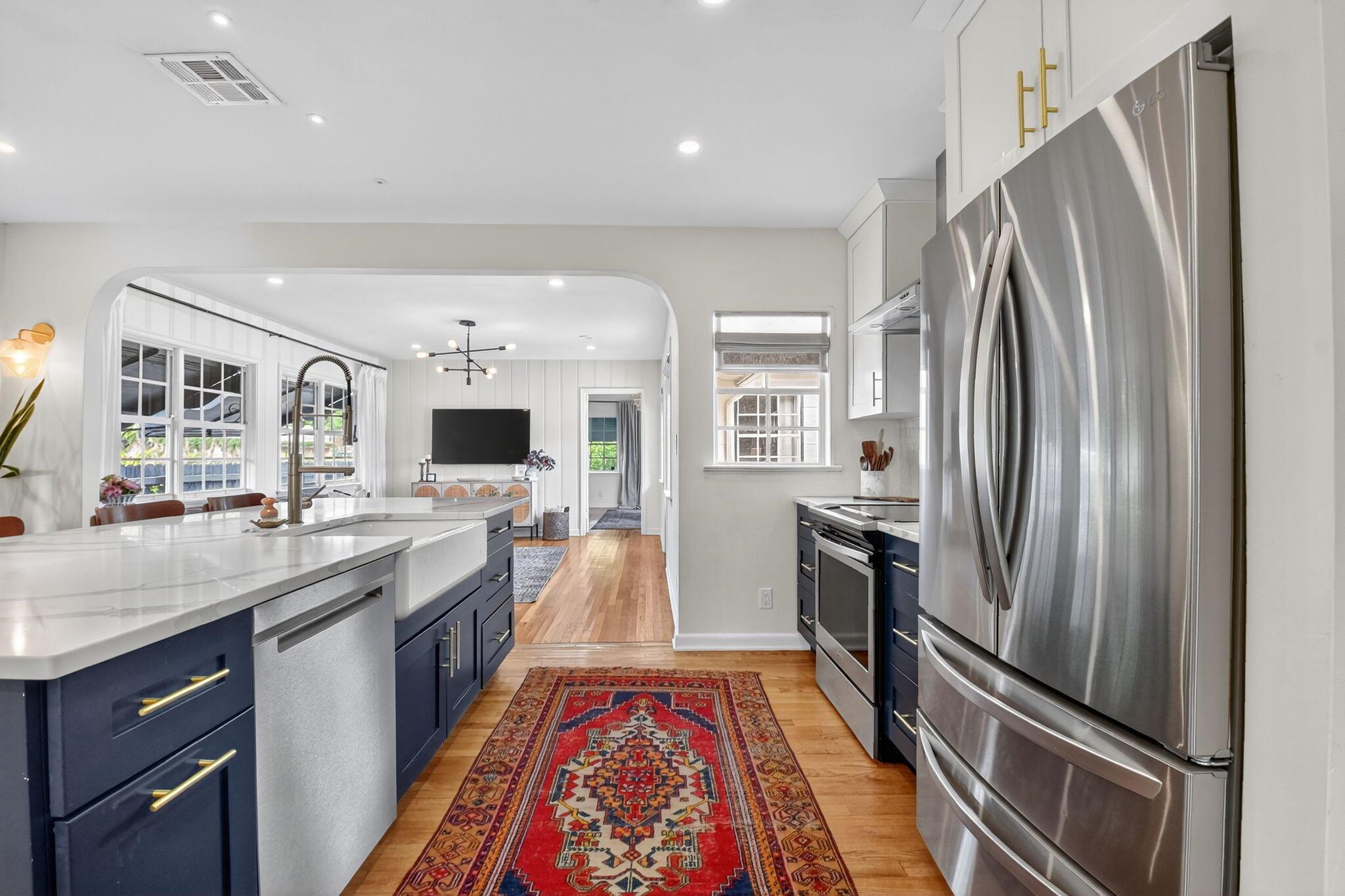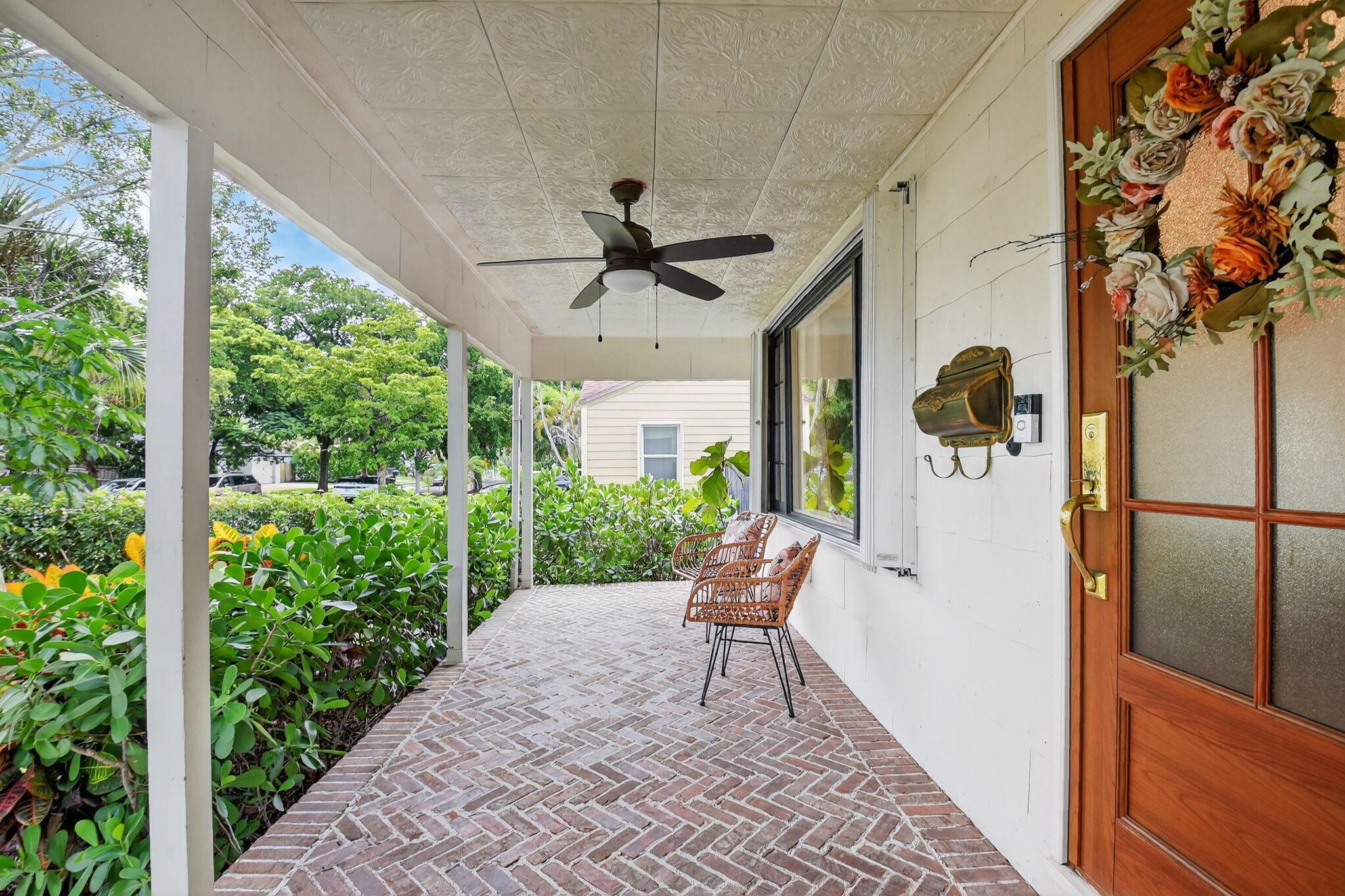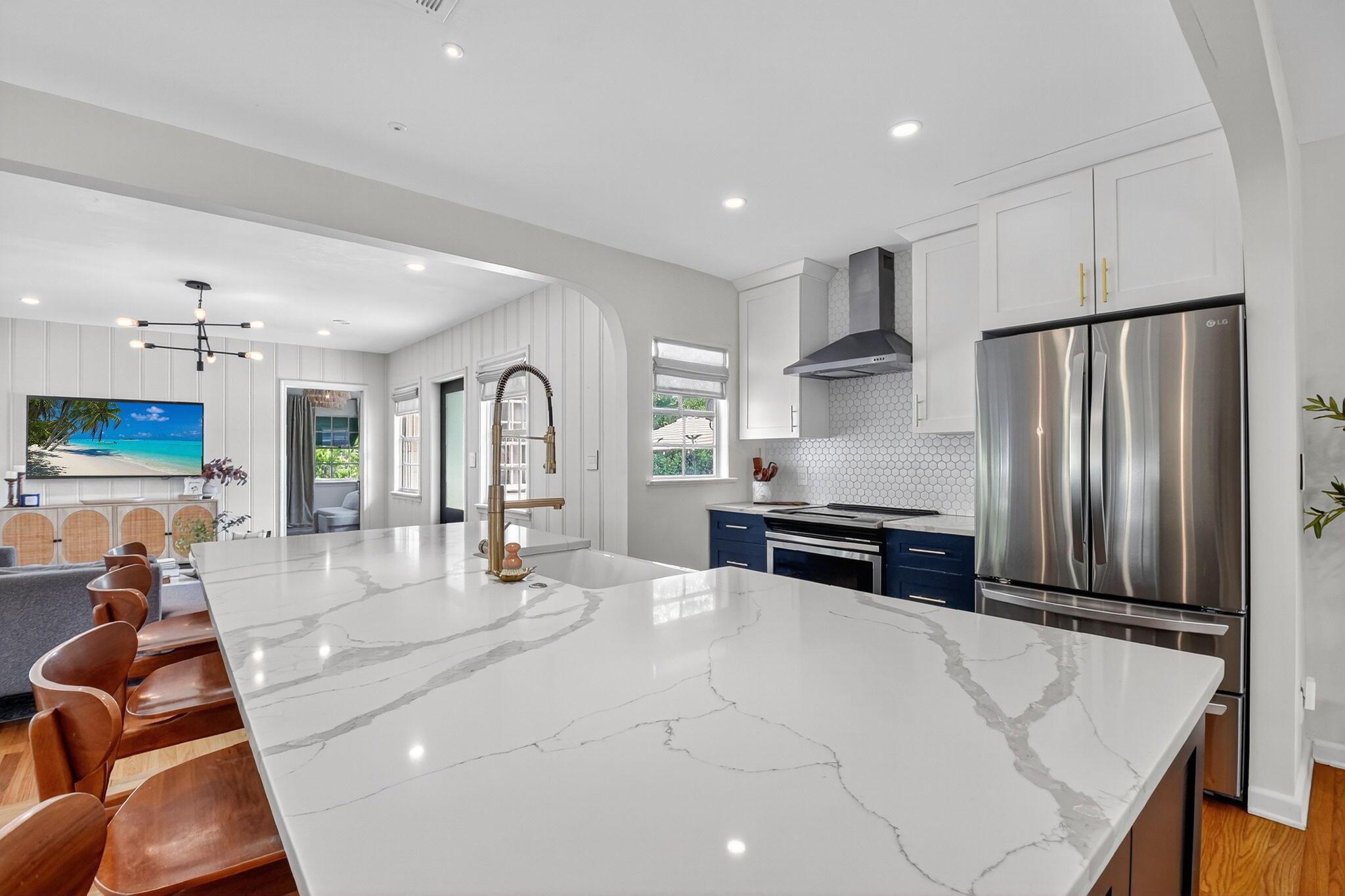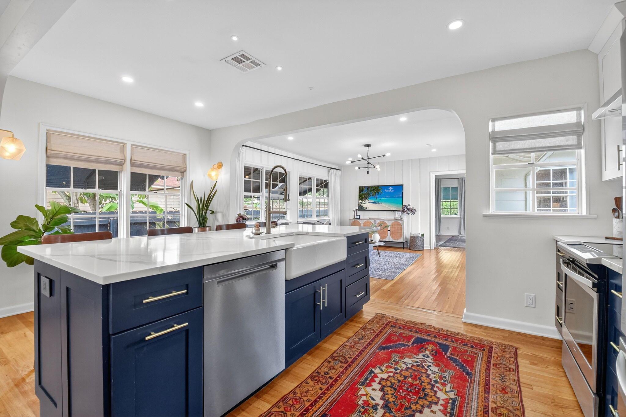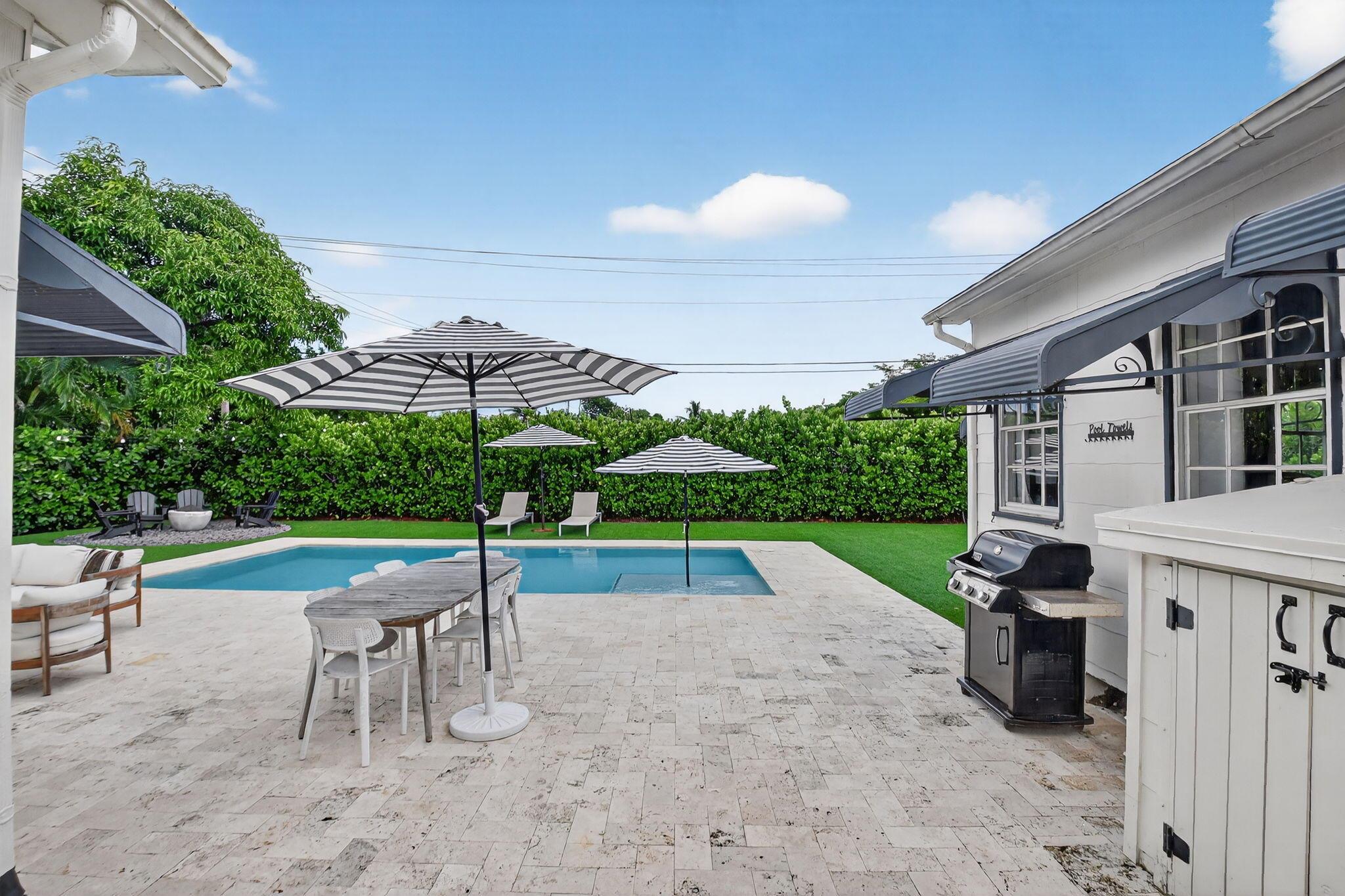 A rare blend of charm, space, and style, this beautifully remodeled historic home is located in one of West Palm Beach's most desirable neighborhoods. Just minutes from downtown but tucked away on a quiet, tree-lined street, the home offers the kind of indoor-outdoor living experience that's nearly impossible to find in the heart of the city. Inside, you'll find a bright and airy floor plan centered around a stunning, fully renovated kitchen. The oversized island, sleek quartz counters, custom cabinetry & high-end finishes make it both functional & visually striking, perfect for everyday living or entertaining. Both bathrooms have been tastefully updated with a clean, modern aesthetic that complements the home's timeless charm. But what truly sets this home apart is the expansive backyard