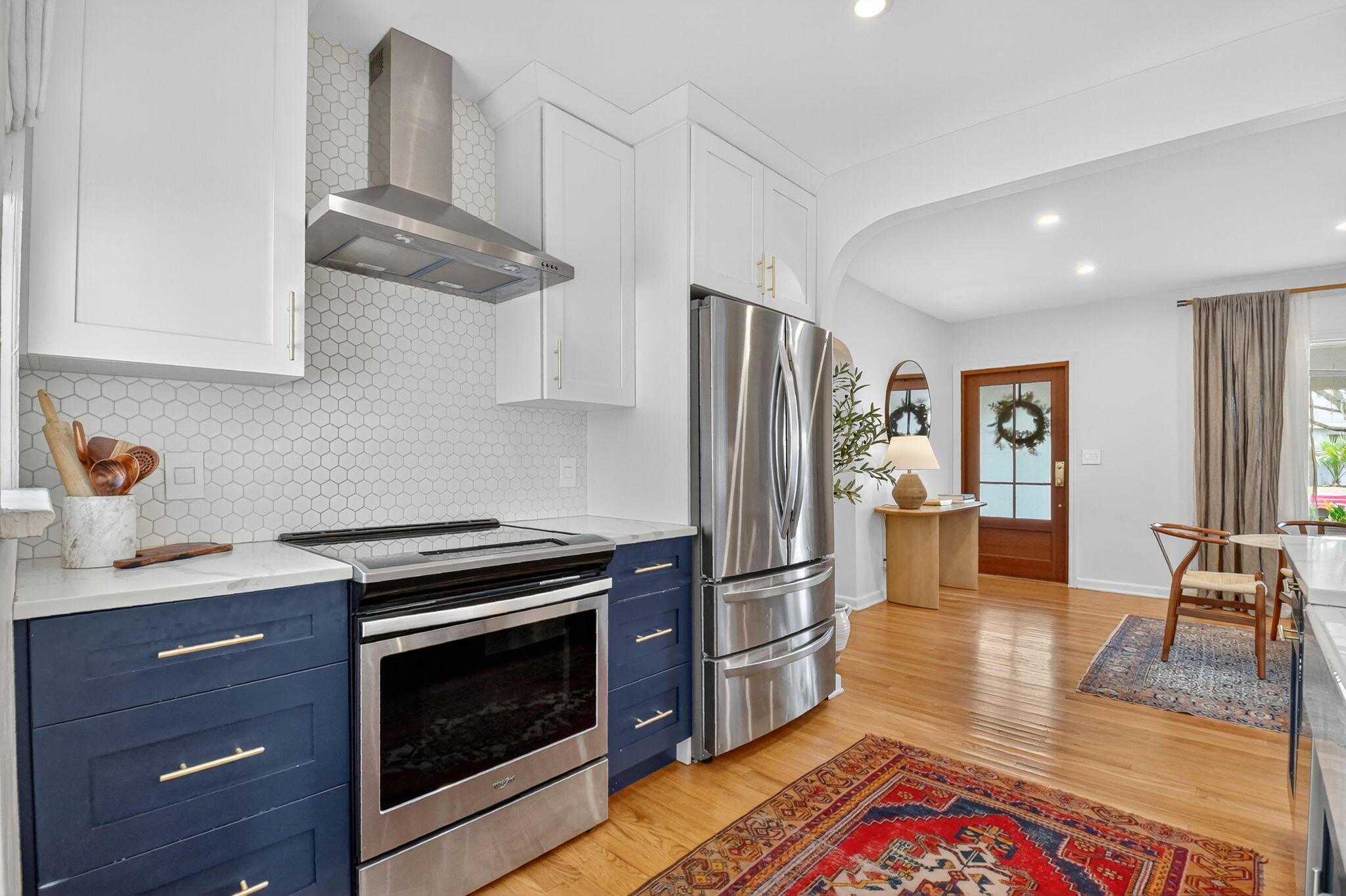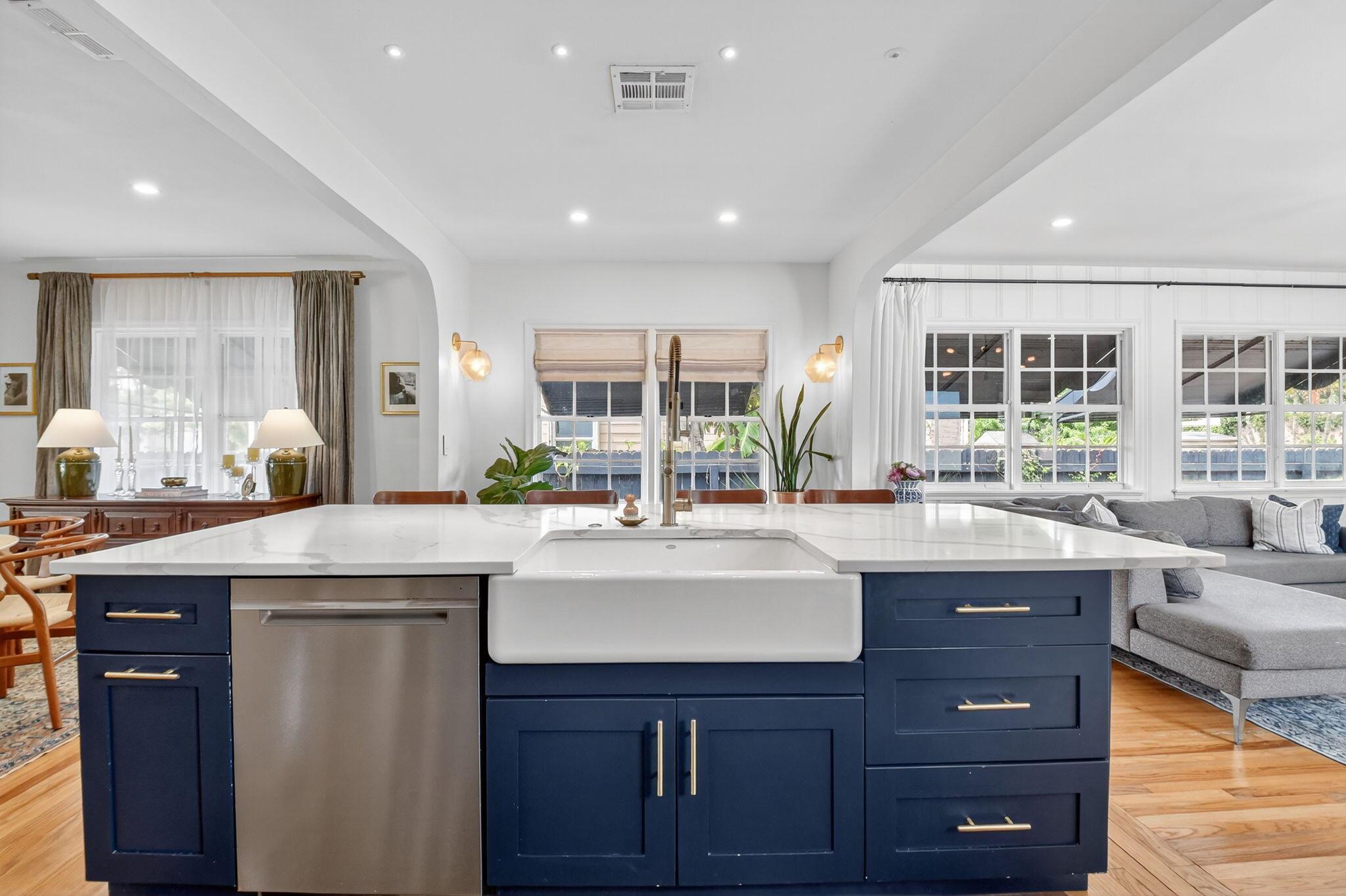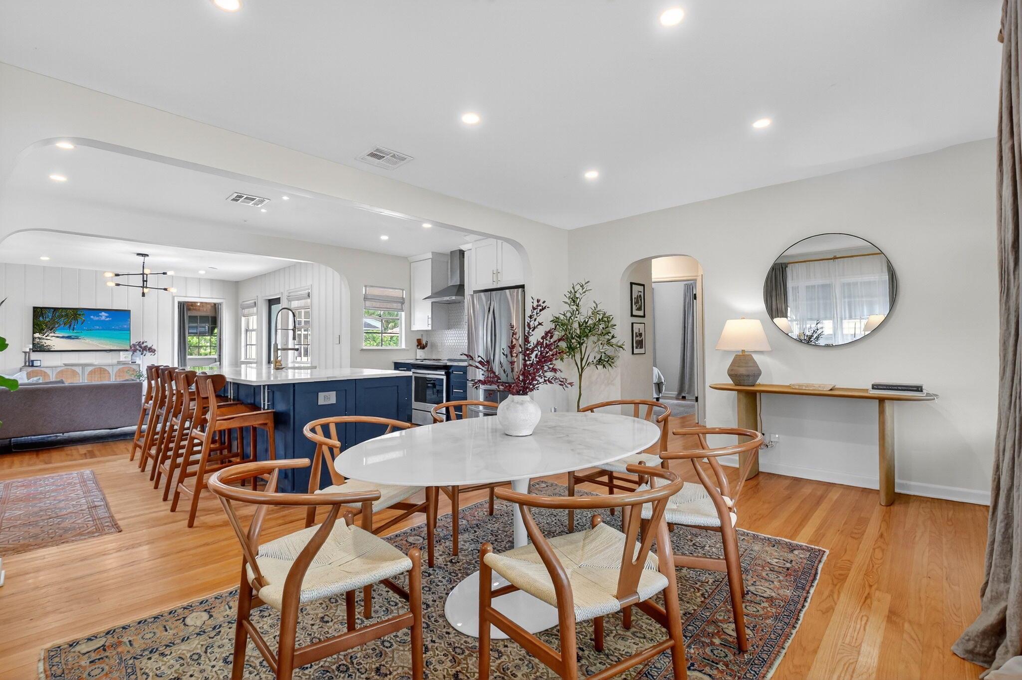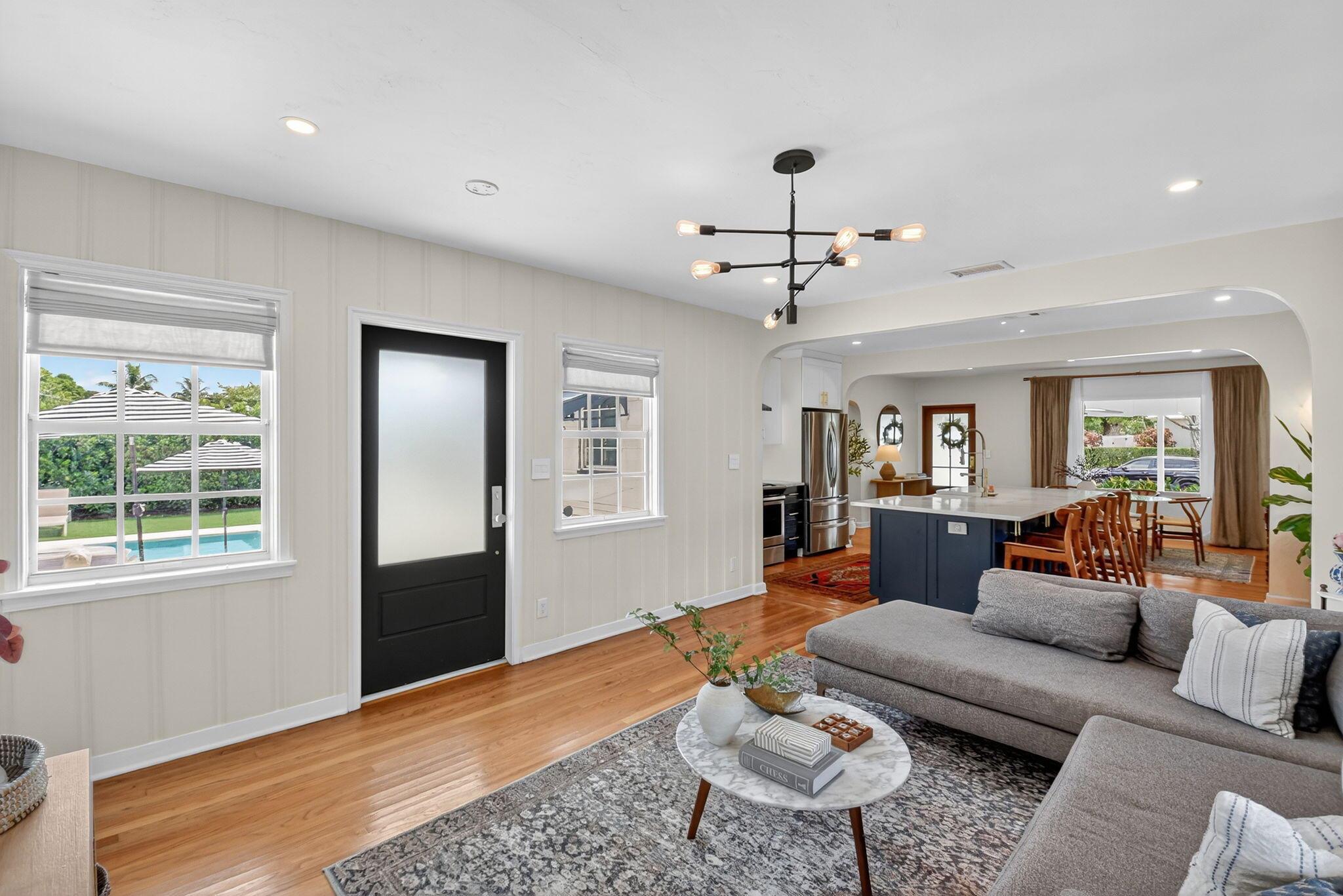 A rare blend of charm, space, and style, this beautifully remodeled historic home is located in one of West Palm Beach's most desirable neighborhoods. Just minutes from downtown but tucked away on a quiet, tree-lined street, the home offers the kind of indoor-outdoor living experience that's nearly impossible to find in the heart of the city. Inside, you'll find a bright and airy floor plan centered around a stunning, fully renovated kitchen. The oversized island, sleek quartz counters, custom cabinetry & high-end finishes make it both functional & visually striking, perfect for everyday living or entertaining. Both bathrooms have been tastefully updated with a clean, modern aesthetic that complements the home's timeless charm. But what truly sets this home apart is the expansive backyard