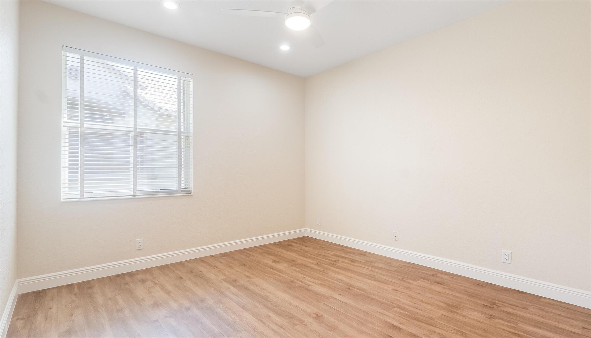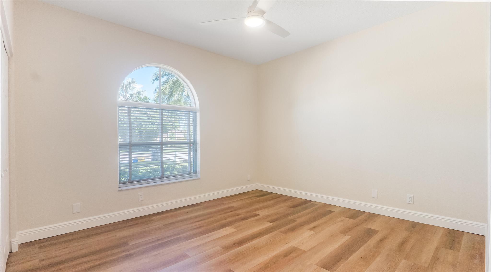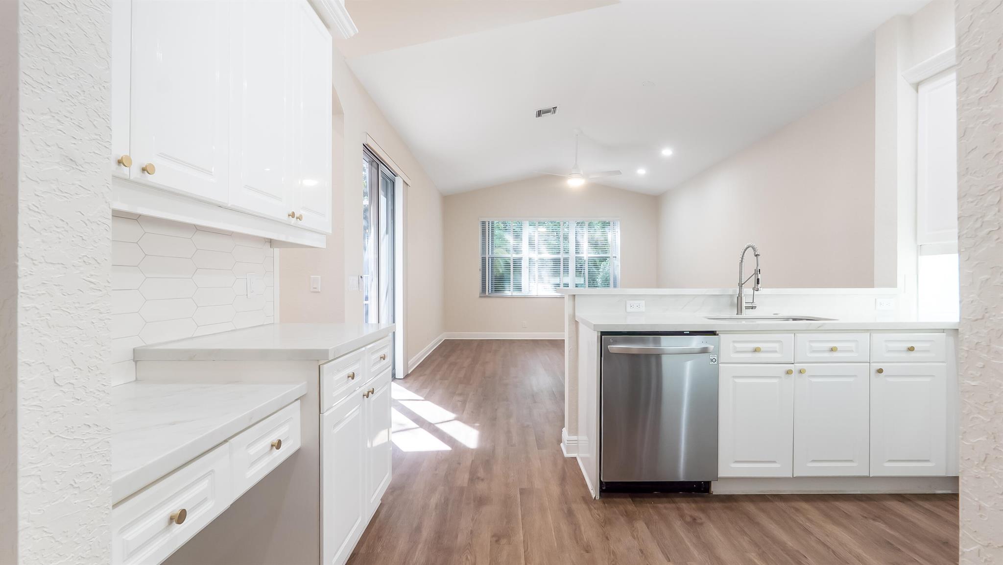The perfect turnkey opportunity in the gated community of The Shores at Boca Raton. This newly remodeled 4-bedroom, 2.5-bath home with a 2-car garage has it all. Updates include a new roof (2023), newer A/C (2022), updated bathroom vanities, white kitchen with stainless steel appliances and more. The modern kitchen features, quartz countertops with a large newer sink and appliances, The home features all new luxury vinyl flooring throughout. High ceilings and an open layout create a bright, spacious feel. Enjoy the private, fenced backyard with a large screened-in patio and ample space to entertain, play, or build a private pool. Accordion shutters on all windows, southern exposure, and no rear neighbors. Located within The Shores, a 150-acre gated community built by Kenco